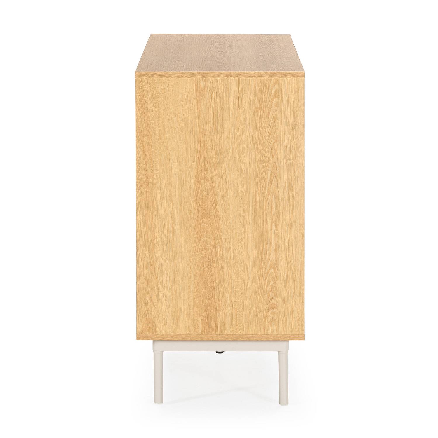 Este aparador de 80 cm de alto está disponible en dos atractivas combinaciones: La primera versión presenta una estructura en color roble combinada con patas y frontales en tono gris, perfecta para ambientes sobrios y elegantes. La segunda apuesta por el contraste entre el cálido roble y un fresco verde, perfecta para quienes desean añadir un toque distintivo y actual al salón.