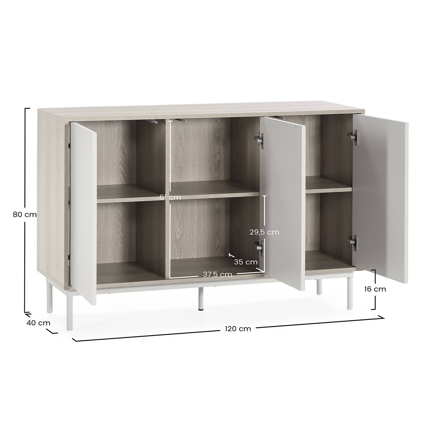Su distribución interior ofrece un espacio práctico para guardar vajilla, cristalería, mantelería o todo aquello que quieras mantener ordenado y fuera de la vista. Al tratarse de un aparador 3 puertas, permite organizar el contenido de forma clara, separando por zonas según tus necesidades y facilitando el acceso.
