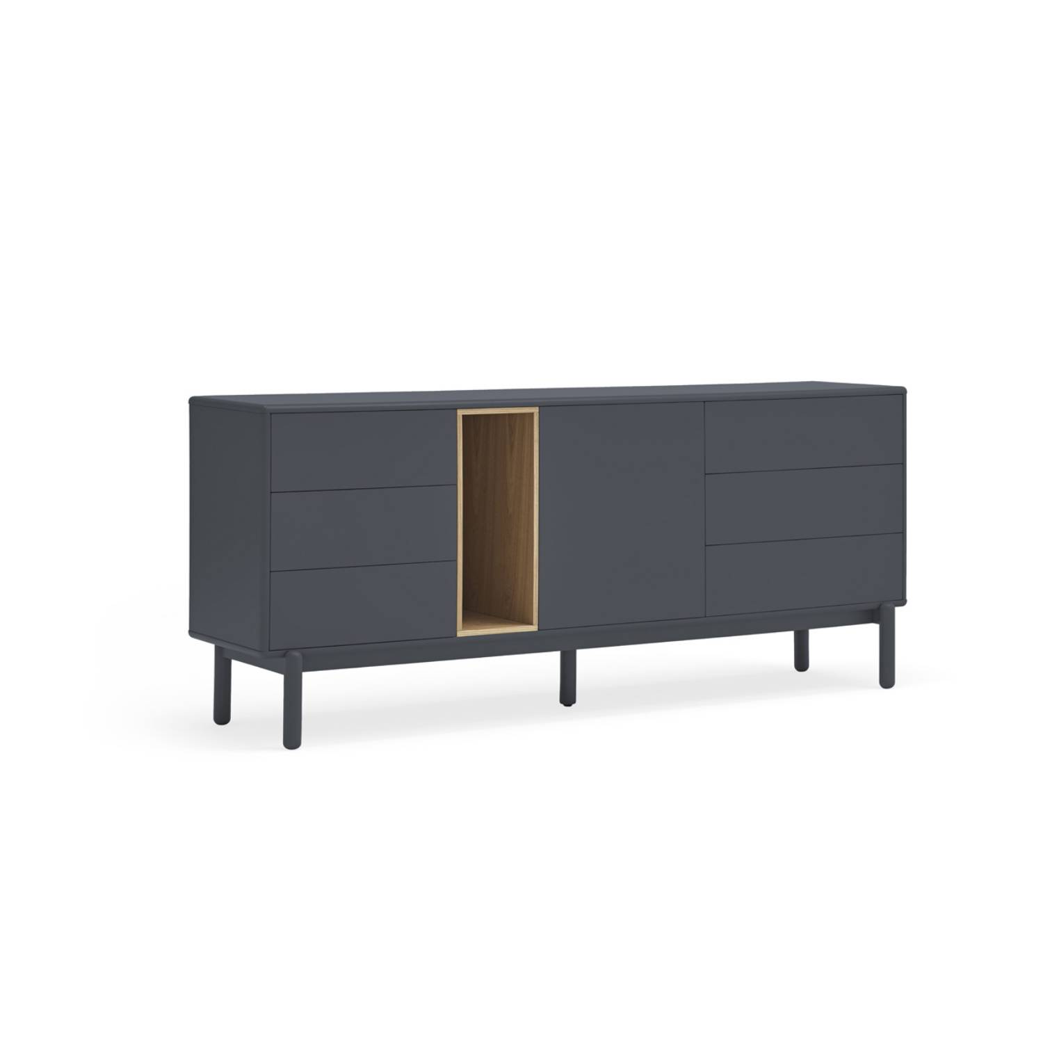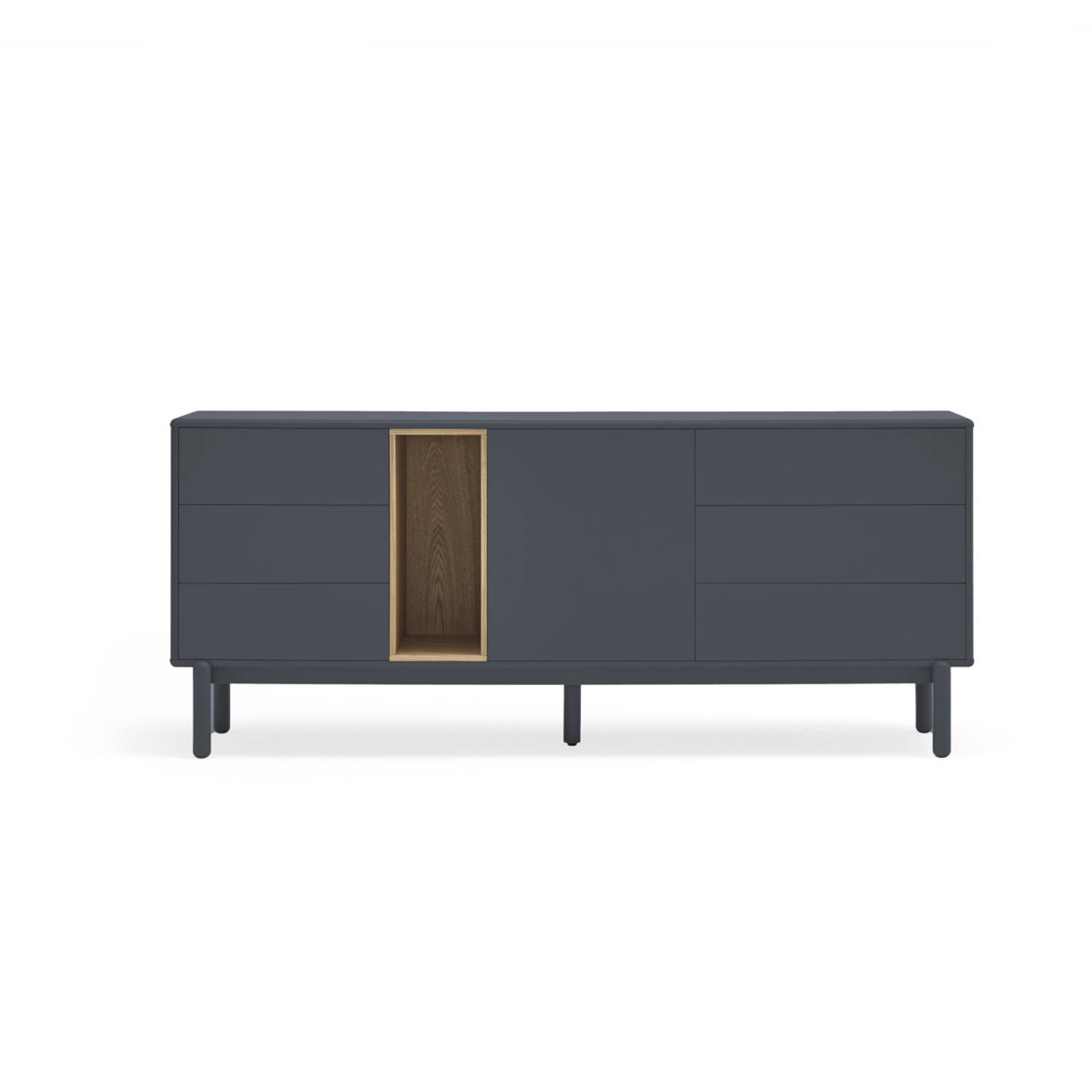 Aparador Corvo de Teulat. El redondeo a lo largo de todo el perímetro del mueble hace que Corvo sea una colección de aspecto suave y voluminoso. A su vez es lo que permite que todas las piezas queden integradas de manera precisa sin necesidad de piezas extra, generando un aspecto mucho mas limpio.