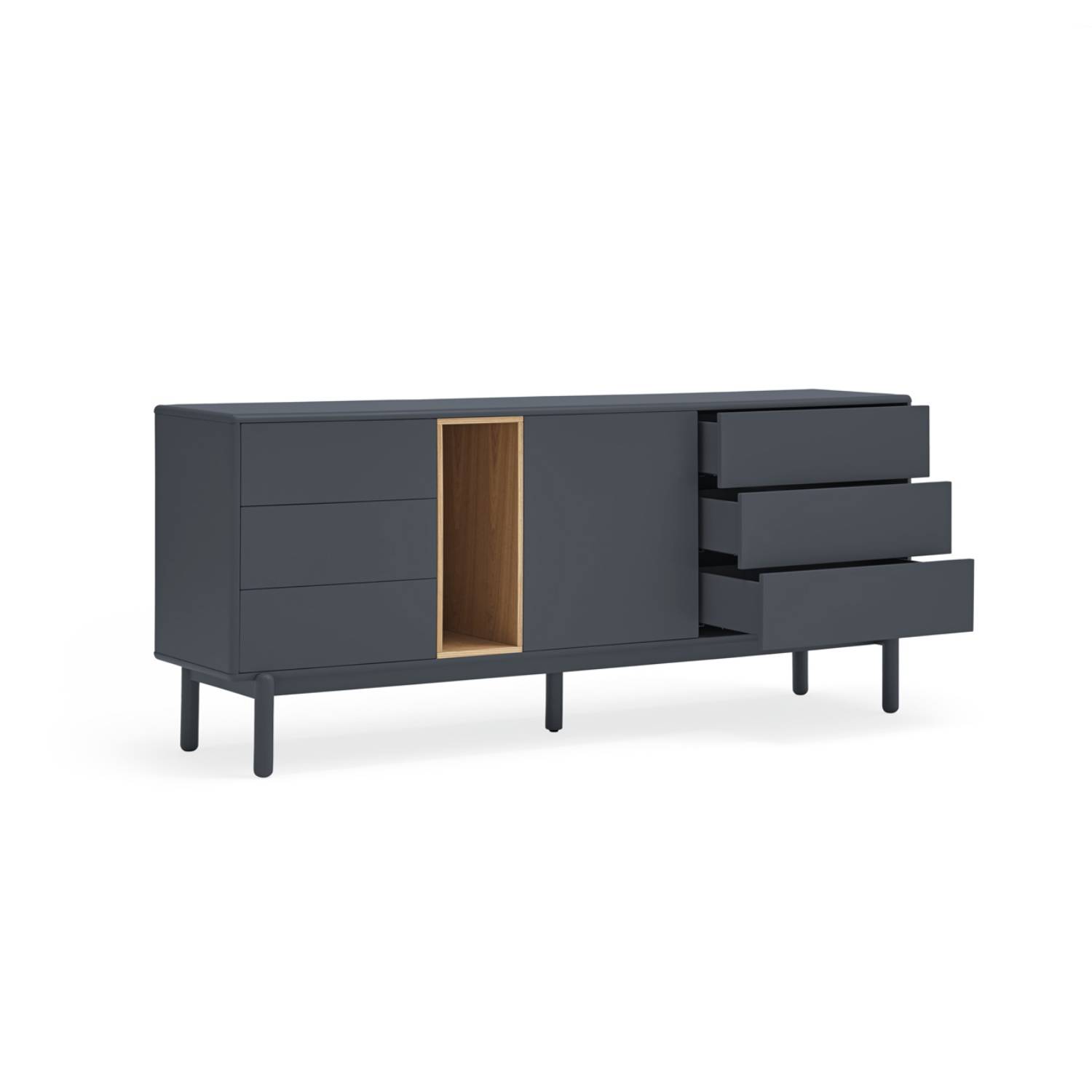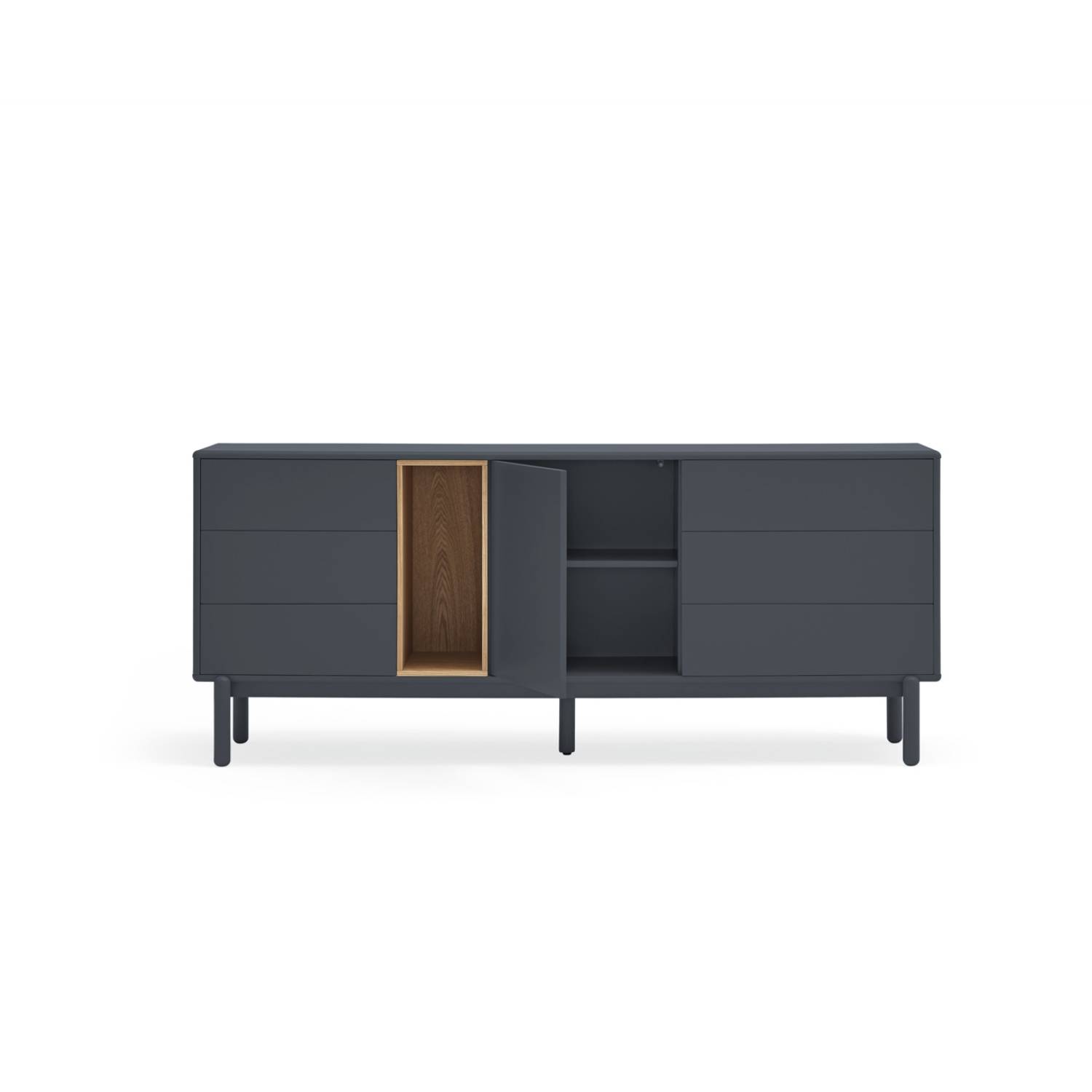 Aparador Completamente chapado en roble, Yoko combina la naturalidad de la madera con detalles en color, haciéndola perfecta para encajar en distintos ambientes. Colores disponibles: roble/crema, roble/gris antracita, roble/teja. Patas metálicas