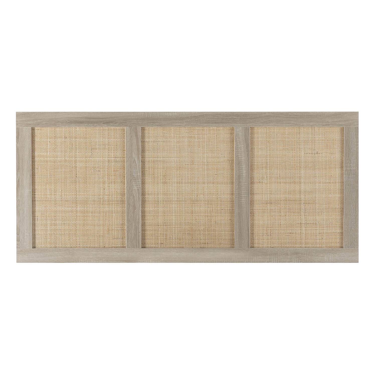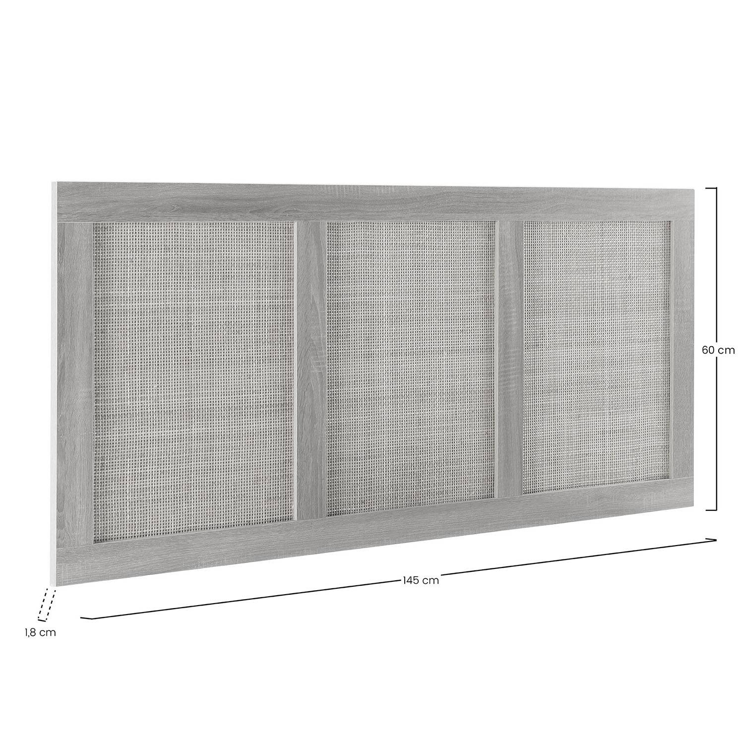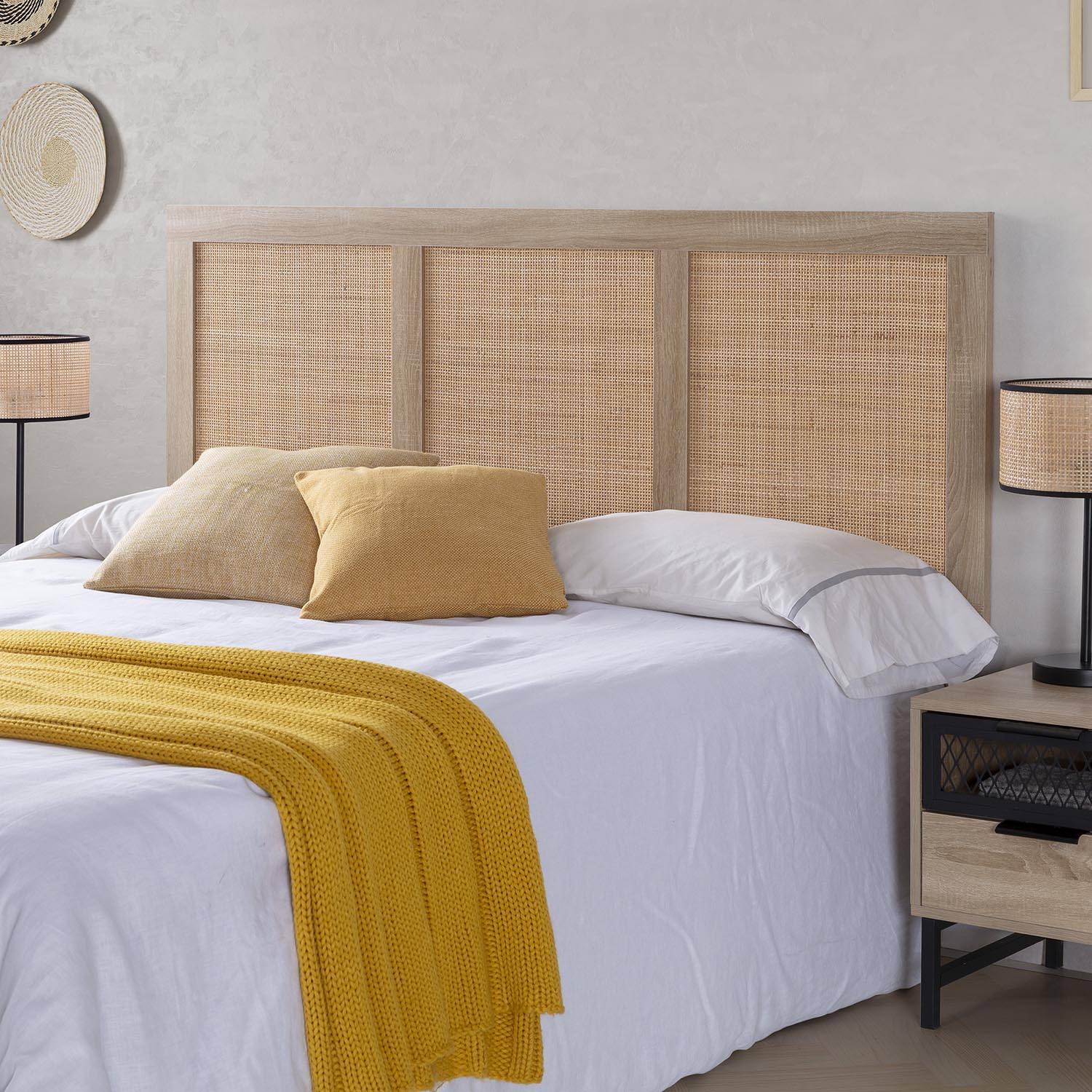 El diseño del cabecero de cama presenta dos o tres rectángulos decorativo, según la medida elegida, que realzan la textura del ratán y aportan un toque orgánico que contrasta con la superficie lisa del roble.