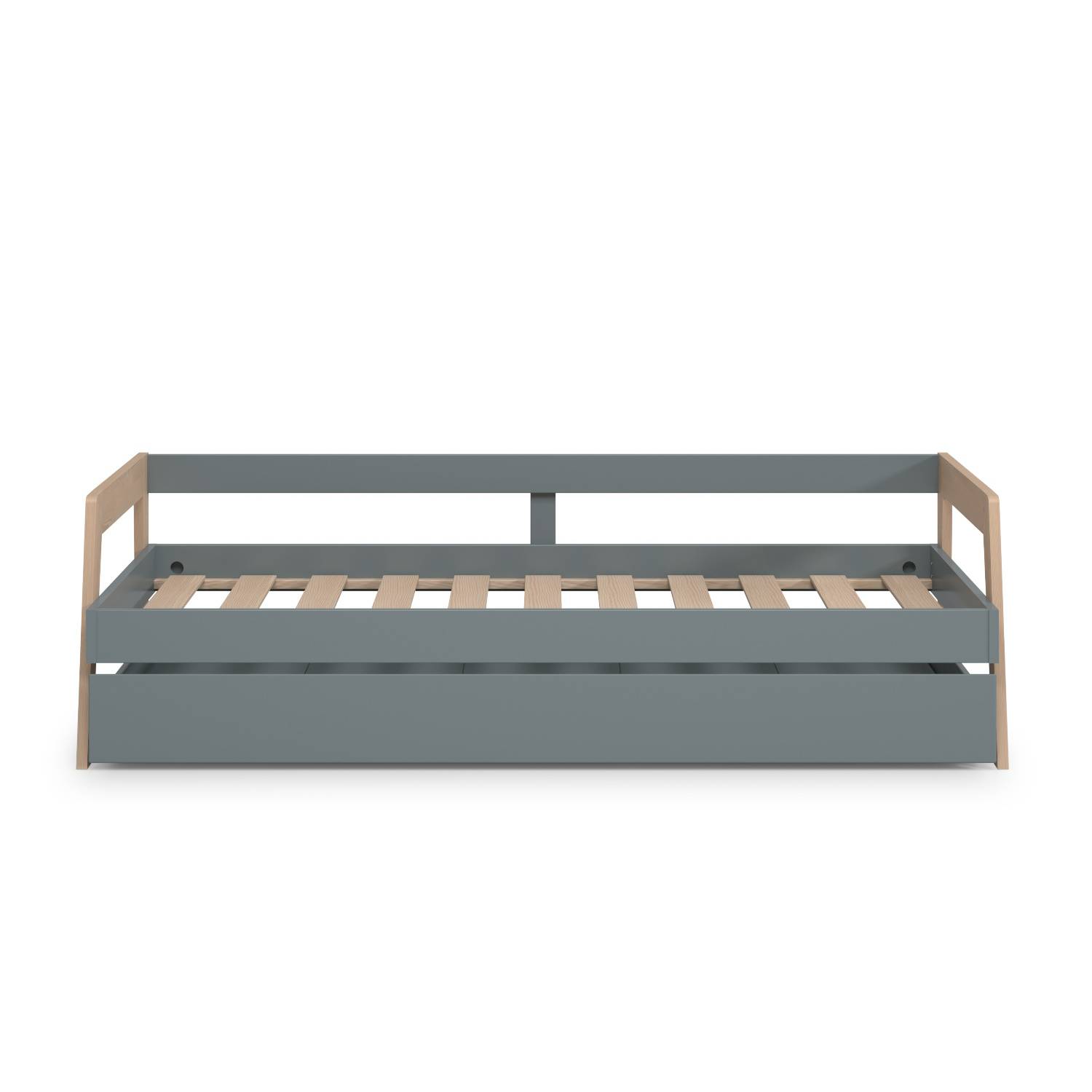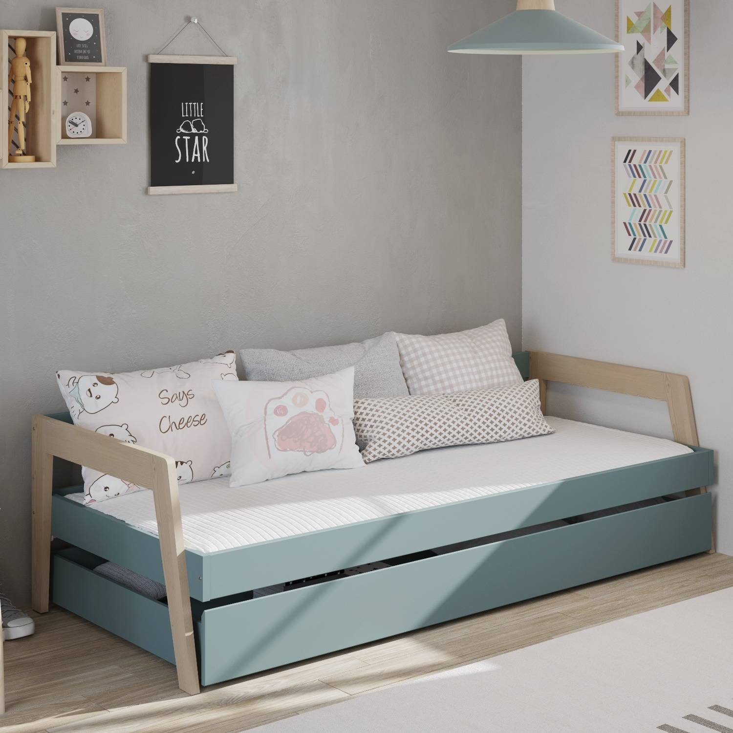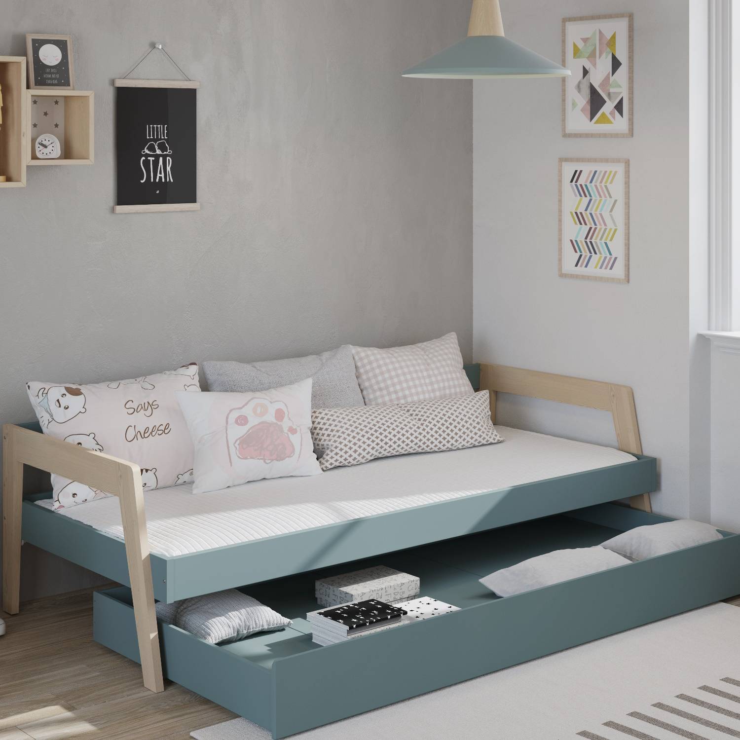 Cama nido Camile en color blanco o verde kaki combinado con madera natural fabricada en madera de pino y DM .La cama puede ser empleada tanto como cama supletorio como cajón de almacenaje. Colchón superior 90x200cm, colchón inferior 90x190cm y altura máxima 15cm.