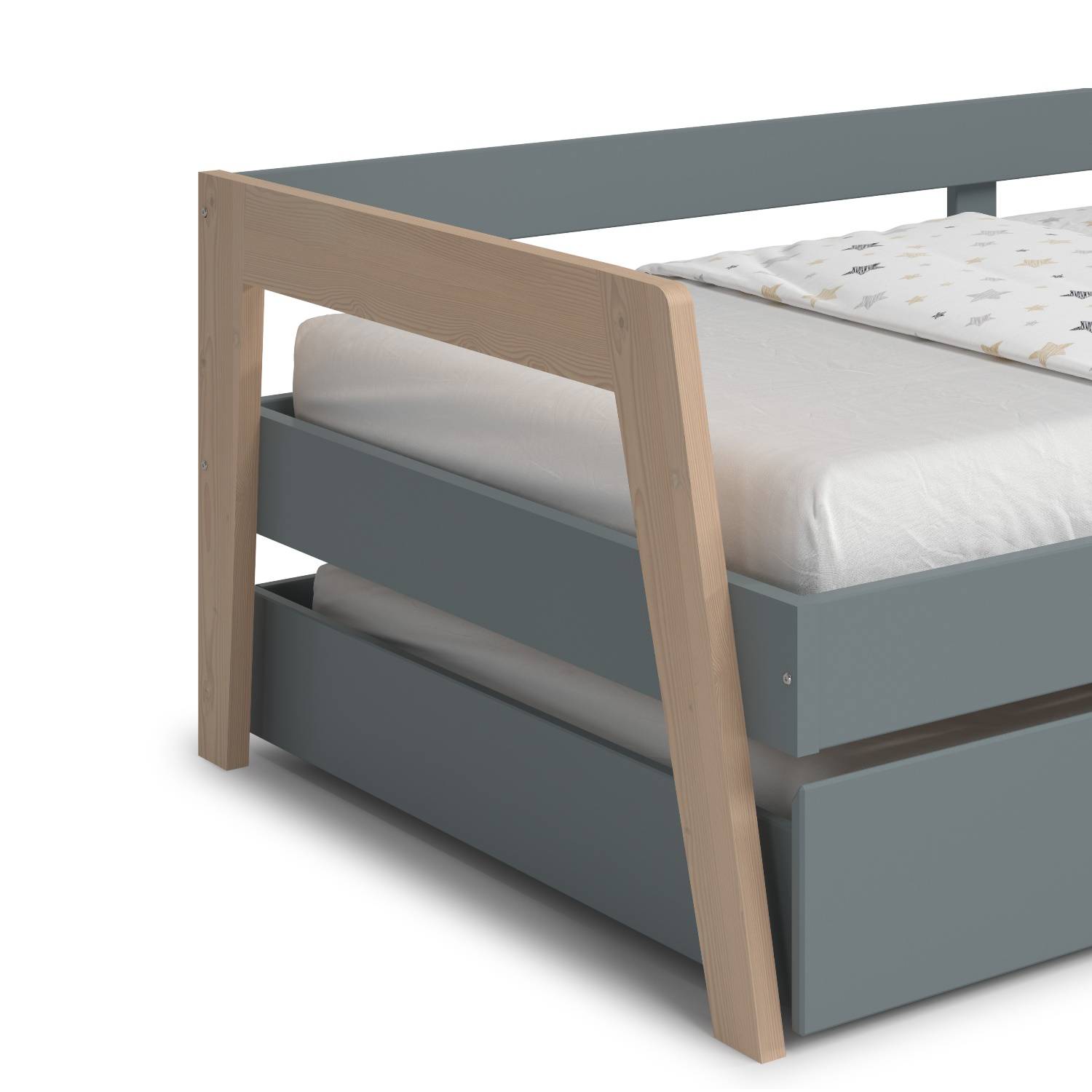 Cama juvenil Erica fabricada en madera de pino y DM, disponible en color blanco y madera natural o verde kaki y madera natural. Las medidas para el colchón son de 901x190cm, abajo podrás almacenar juguetes, libros...