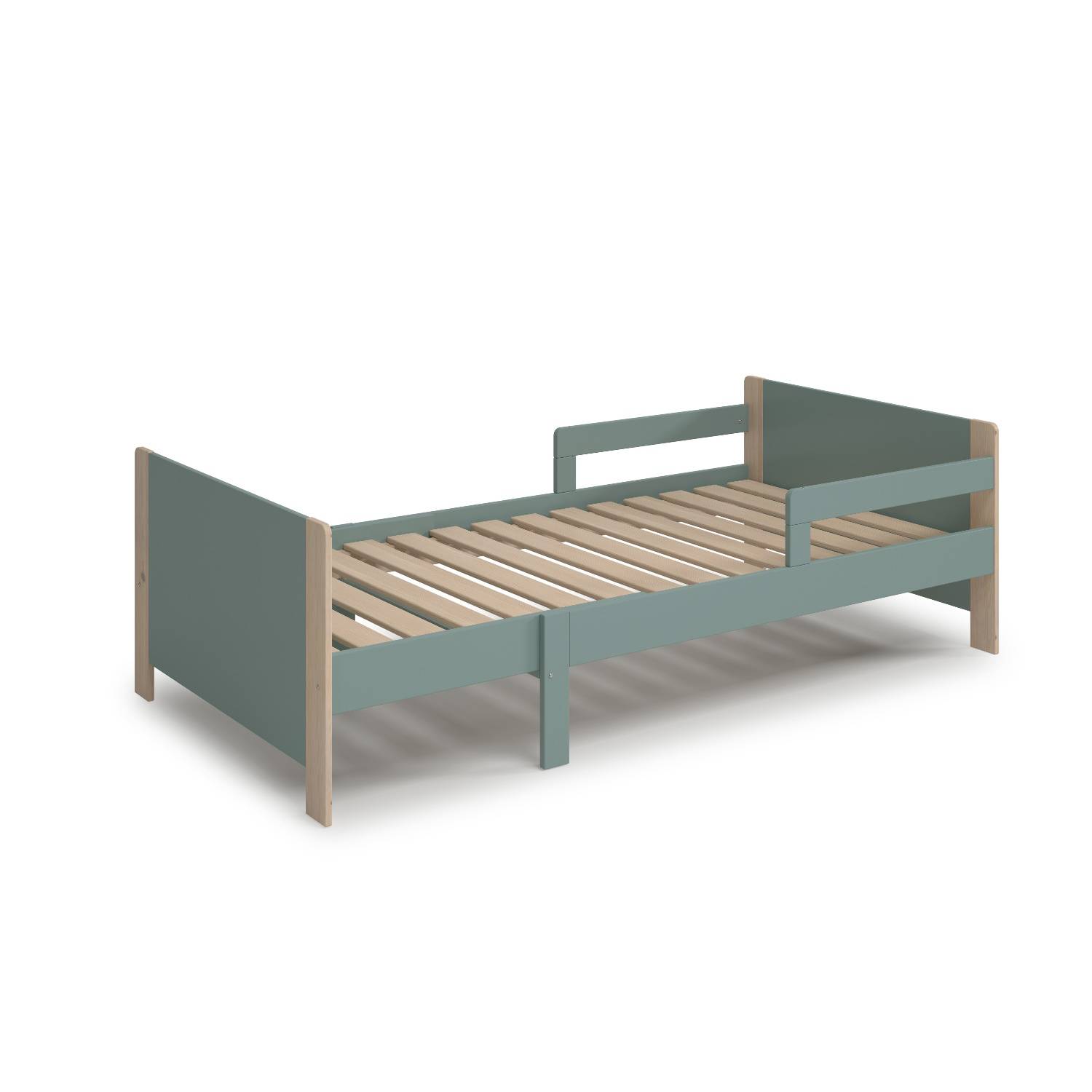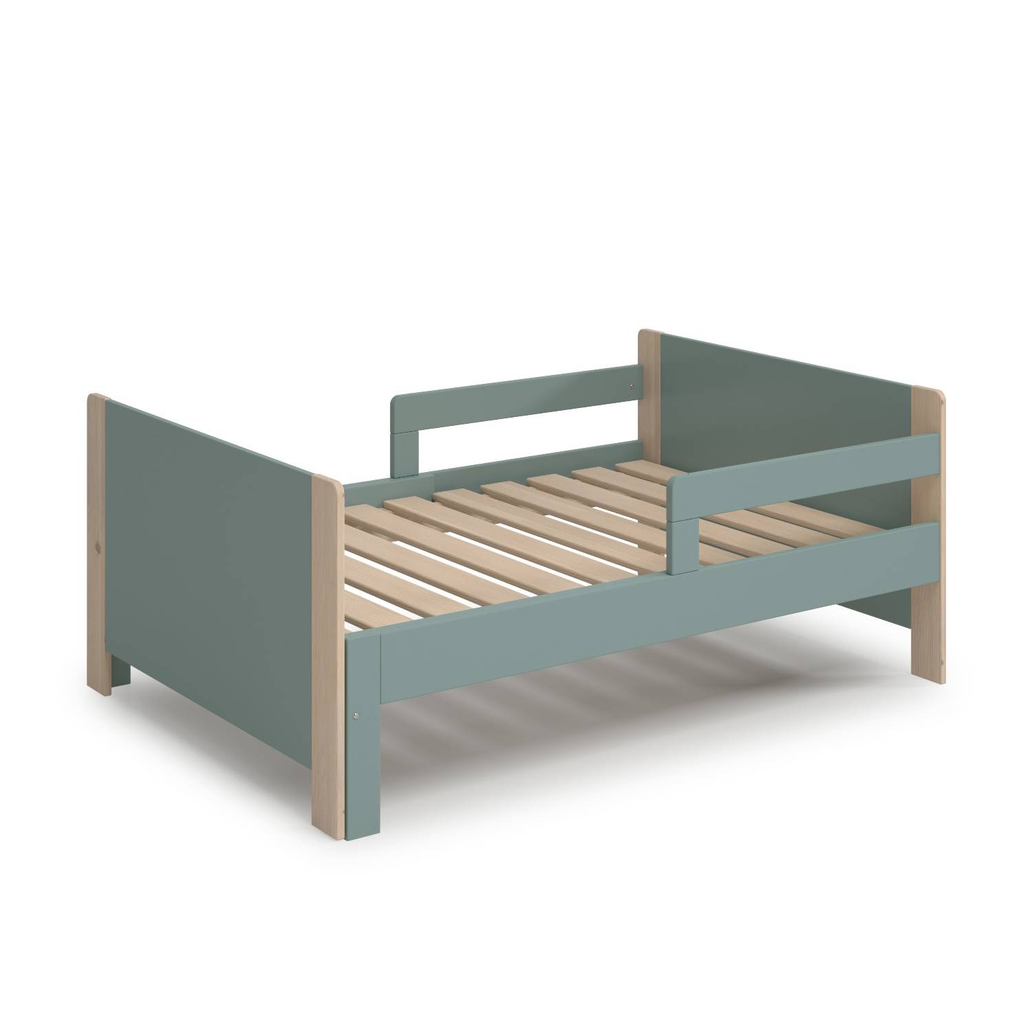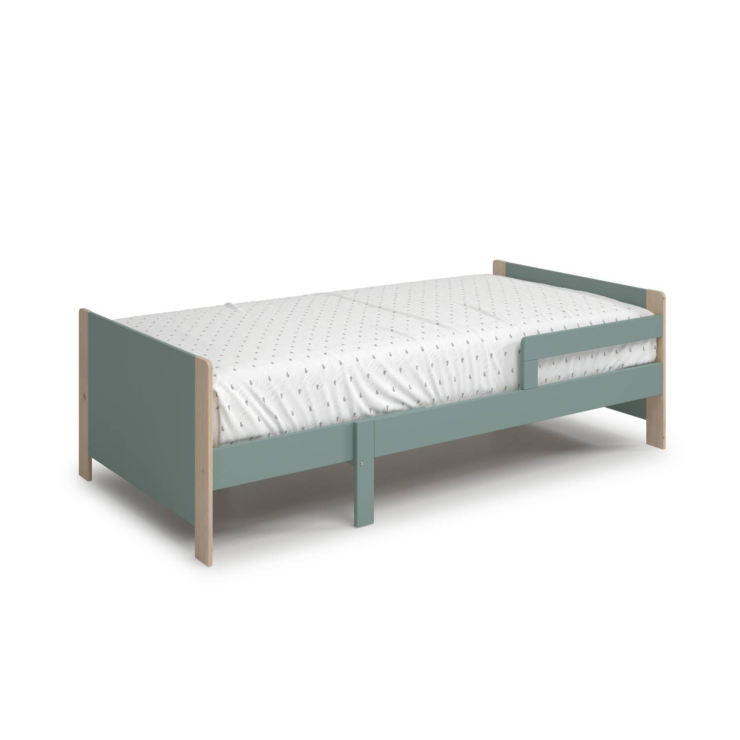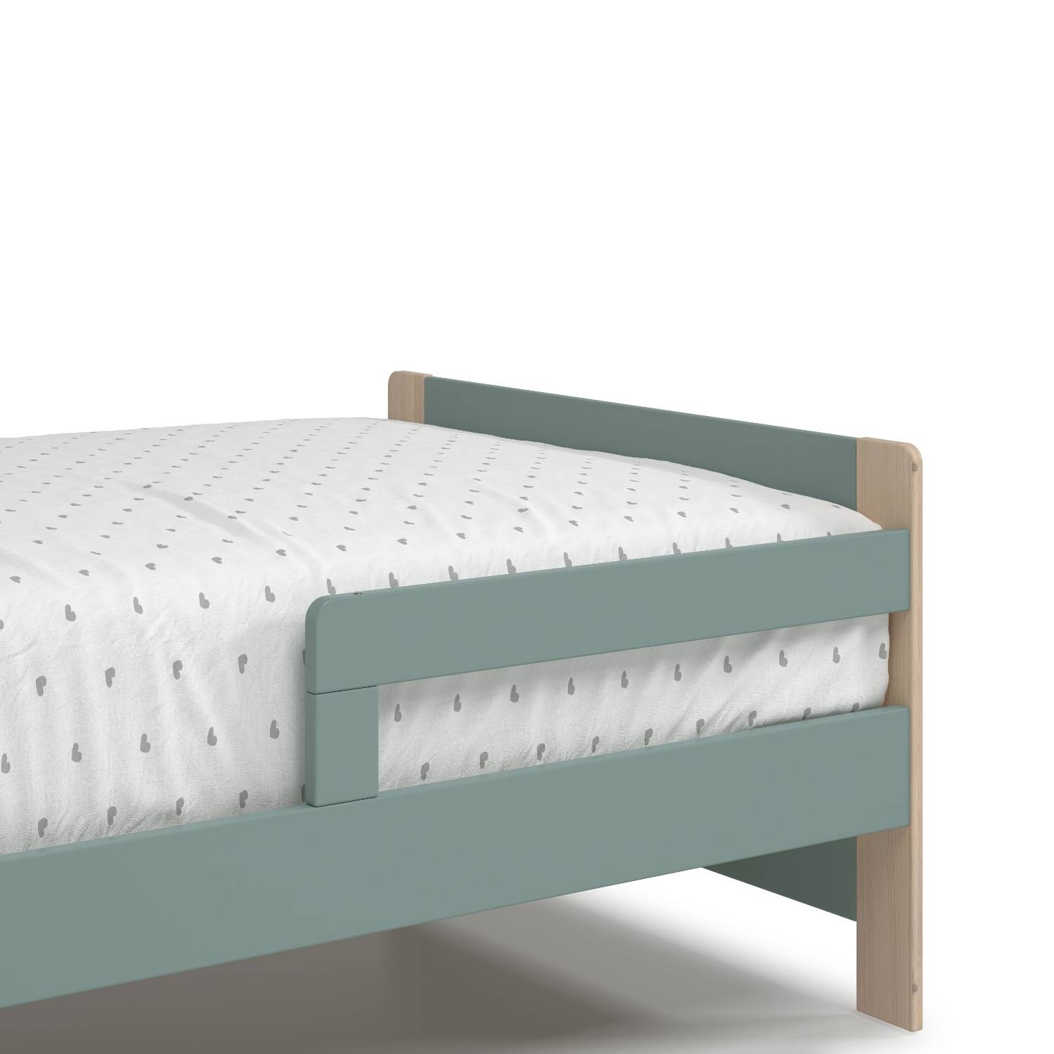 Cama evolutiva para los más pequeños de casa con barrera incorporada para mejorar su seguridad ante todo. Disponible en color blanco y cera o verde petrol y cera.