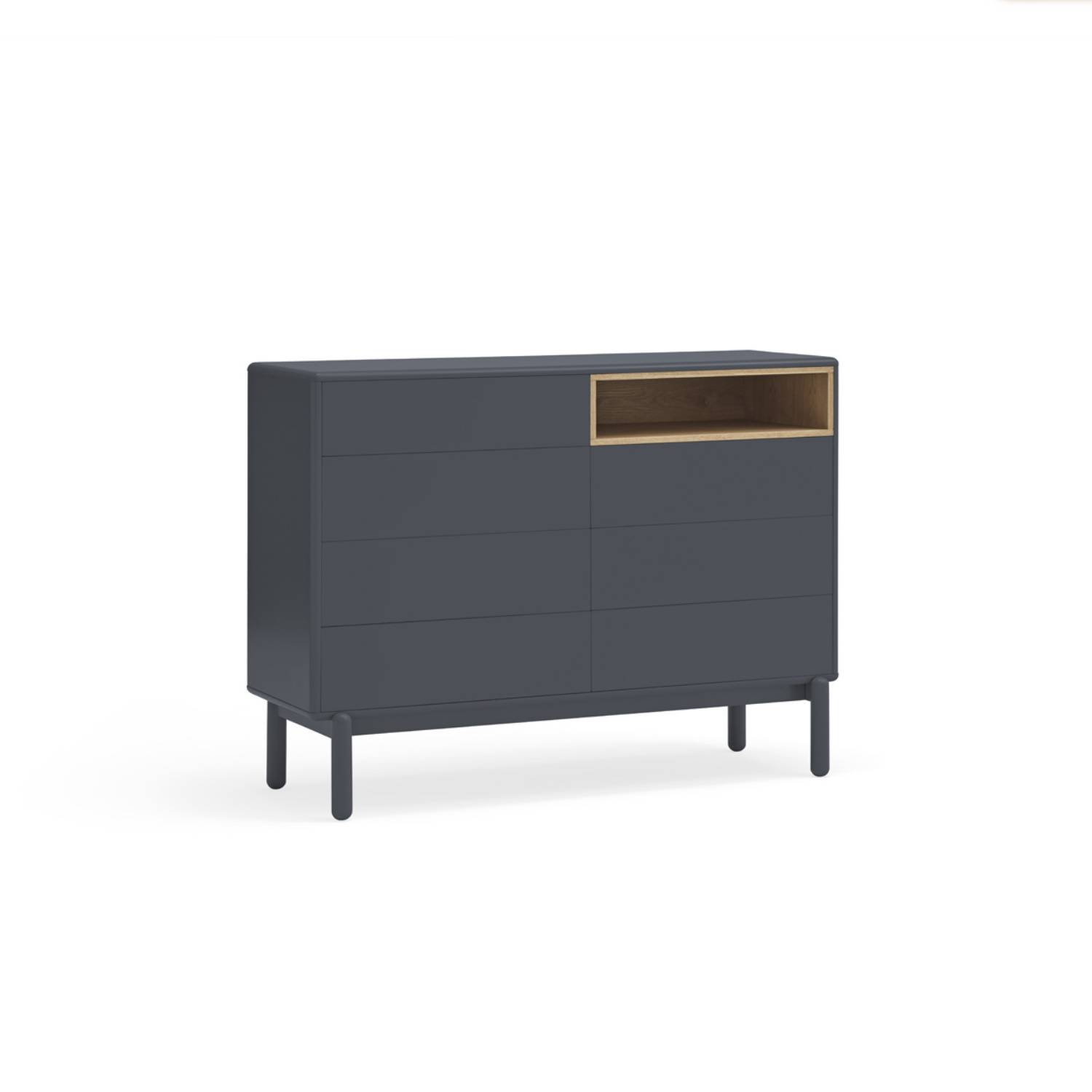 Aparador Corvo de Teulat. El redondeo a lo largo de todo el perímetro del mueble hace que Corvo sea una colección de aspecto suave y voluminoso. A su vez es lo que permite que todas las piezas queden integradas de manera precisa sin necesidad de piezas extra, generando un aspecto mucho mas limpio.