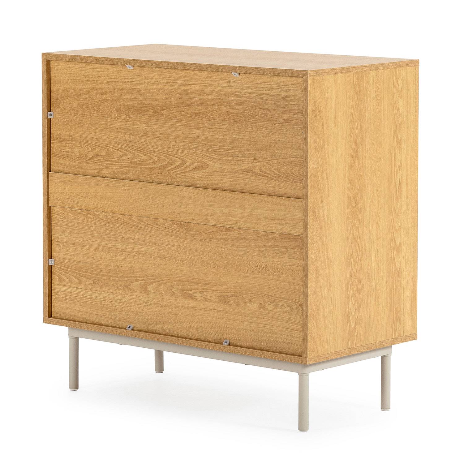 Su estructura principal está disponible en color roble, un acabado cálido y natural que aporta carácter y armonía al espacio, mientras que los frontales de los cajones y las patas metálicas añaden un toque de modernidad y ligereza visual. Puedes elegir entre dos combinaciones de color: roble con gris, perfecta para dormitorios neutros y sofisticados, o roble con verde, ideal para aportar frescura y personalidad a la estancia.