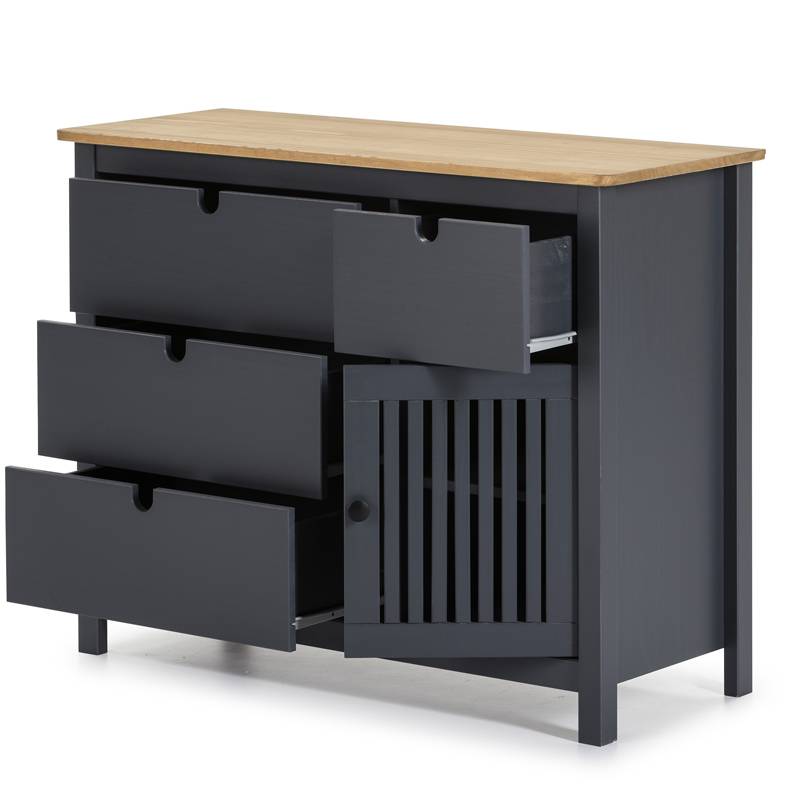 Aparador fabricado en madera de pino 3 cajones y una puerta corredera lacado. Disponible en cera y Gris antracita.