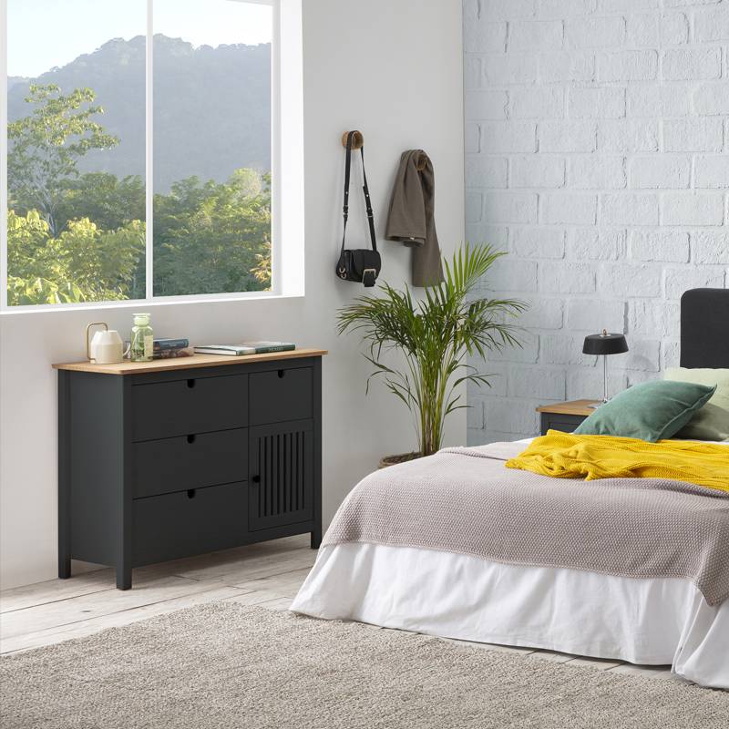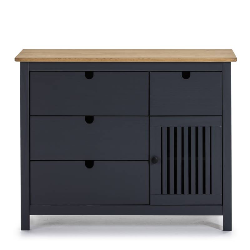 Cómoda de madera de pino de 4 cajones y 1 puerta; en un lateral los 3 cajones más grandes y, en el otro lado, 1 cajón más pequeño y una puerta. Disponible en blanco, cera y gris antracita. Tablero superior en madera embellecida. Sin tiradores.