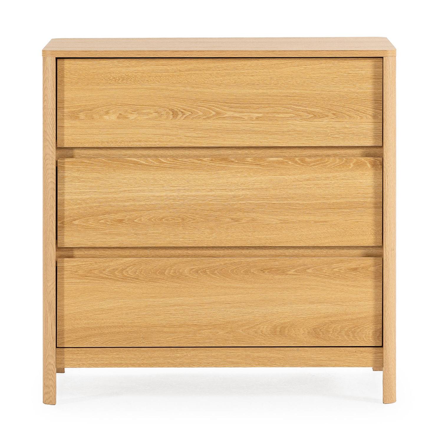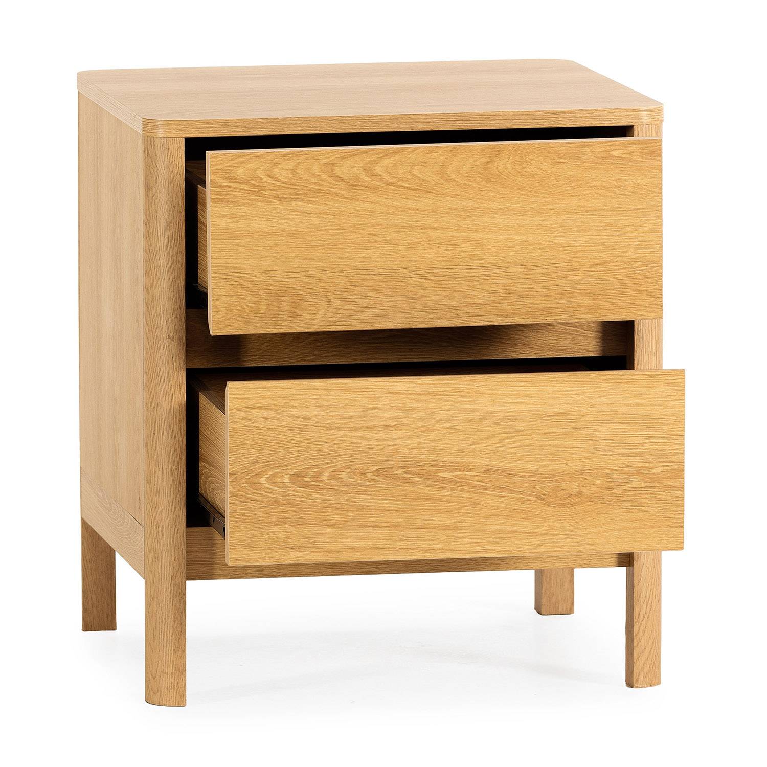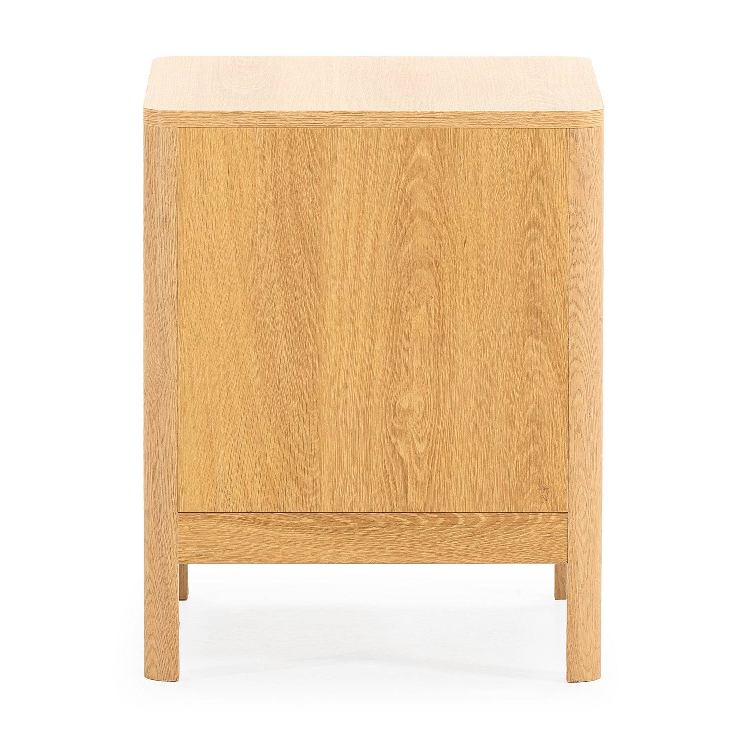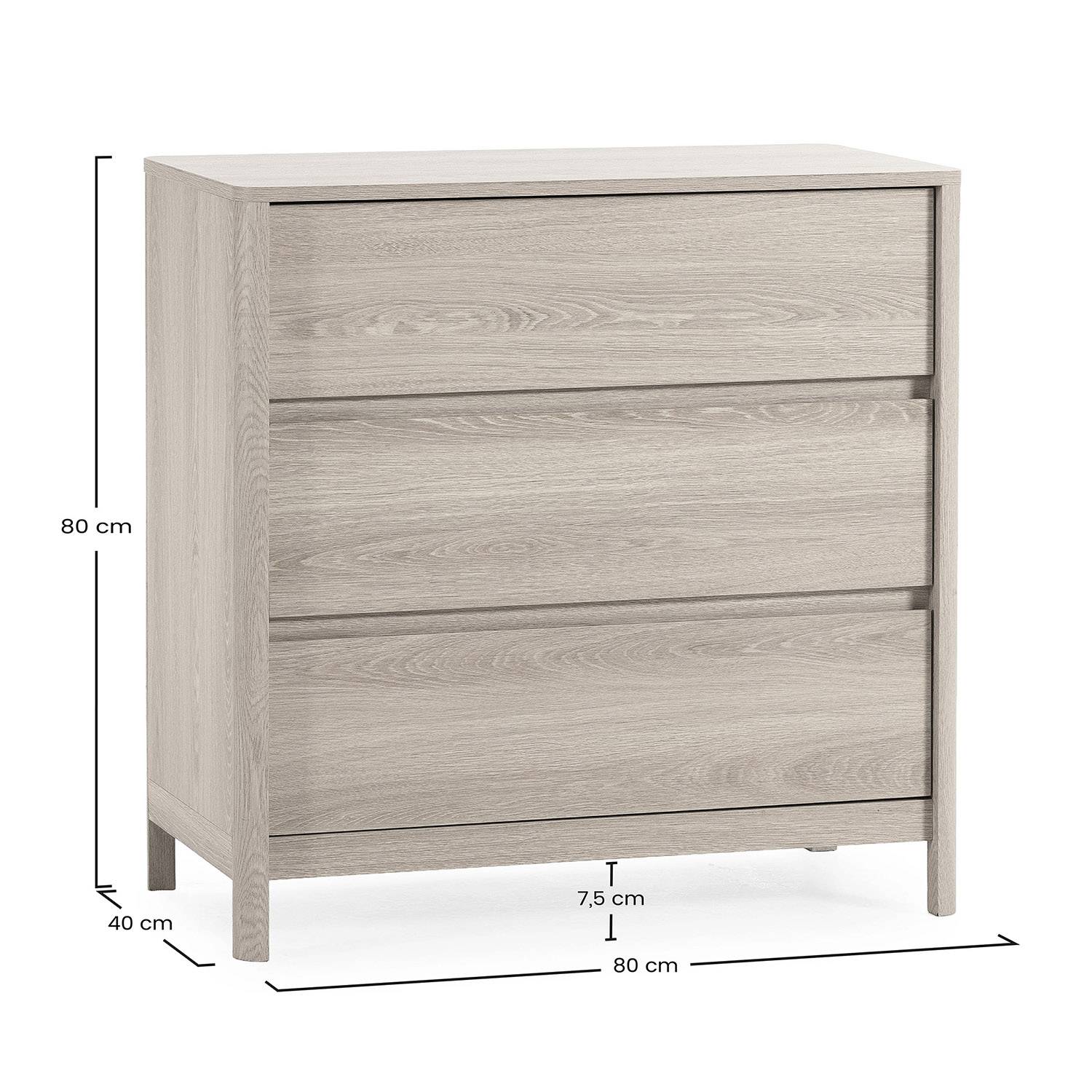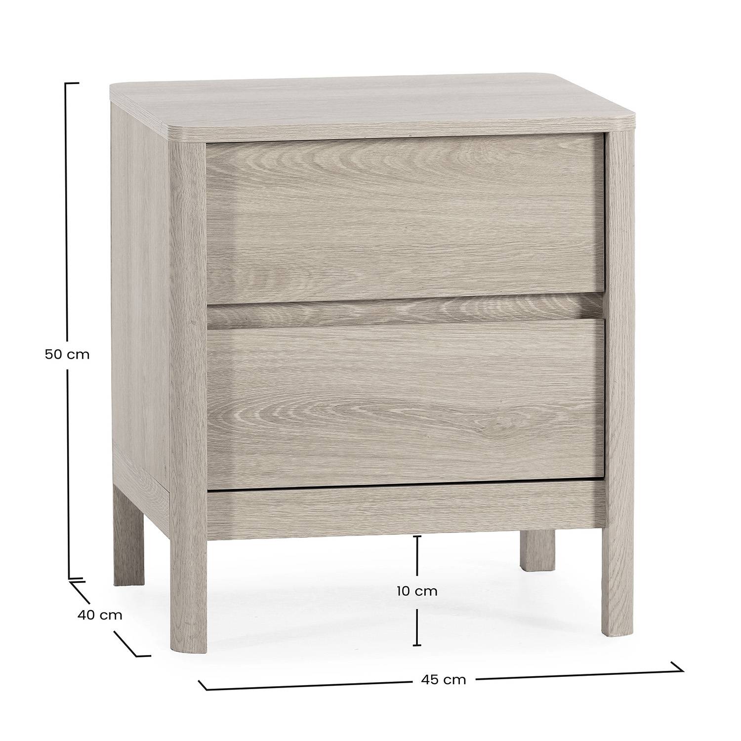 La mesita de noche cuenta con patas de 10 cm de altura, mientras que la cómoda incorpora patas de 7,5 cm. Esta elevación aporta ligereza visual y facilita la limpieza de la parte inferior.