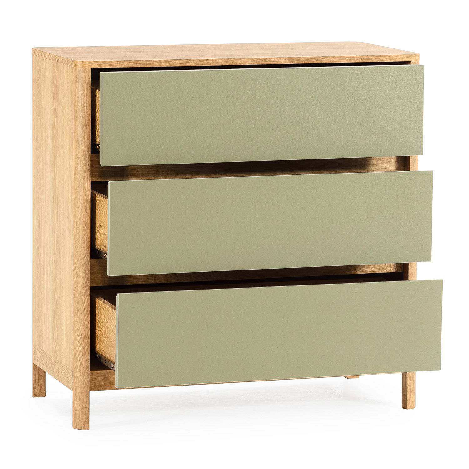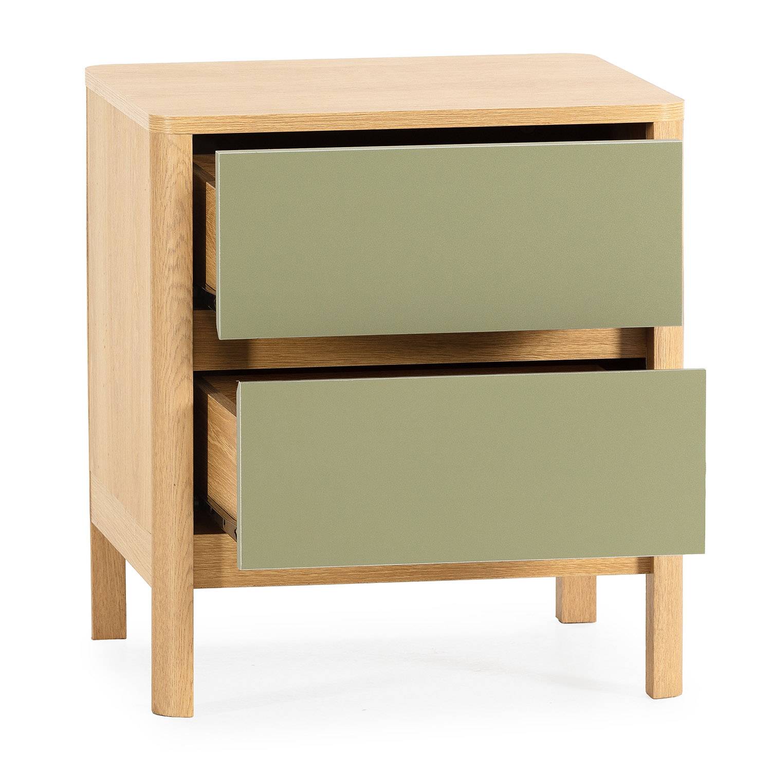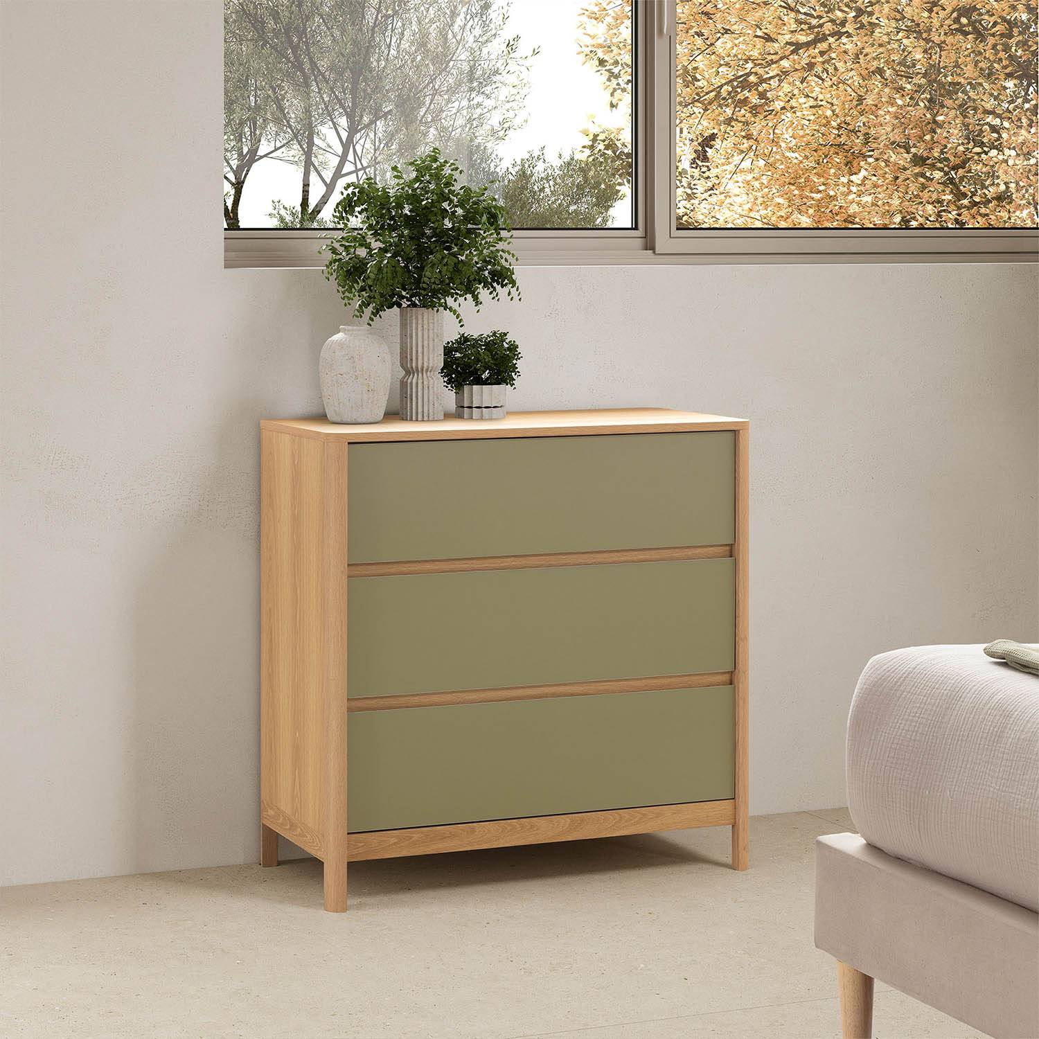 La estructura principal de ambos muebles se presenta en dos combinaciones decorativas. La primera opción apuesta por una estética uniforme, con estructura y frontal de cajones en color roble, ideal para ambientes cálidos, naturales y fáciles de combinar. La segunda alternativa mantiene la estructura en roble e incorpora el frontal de los cajones en color verde, un contraste que aporta un toque decorativo diferenciador sin perder la sensación de calidez.