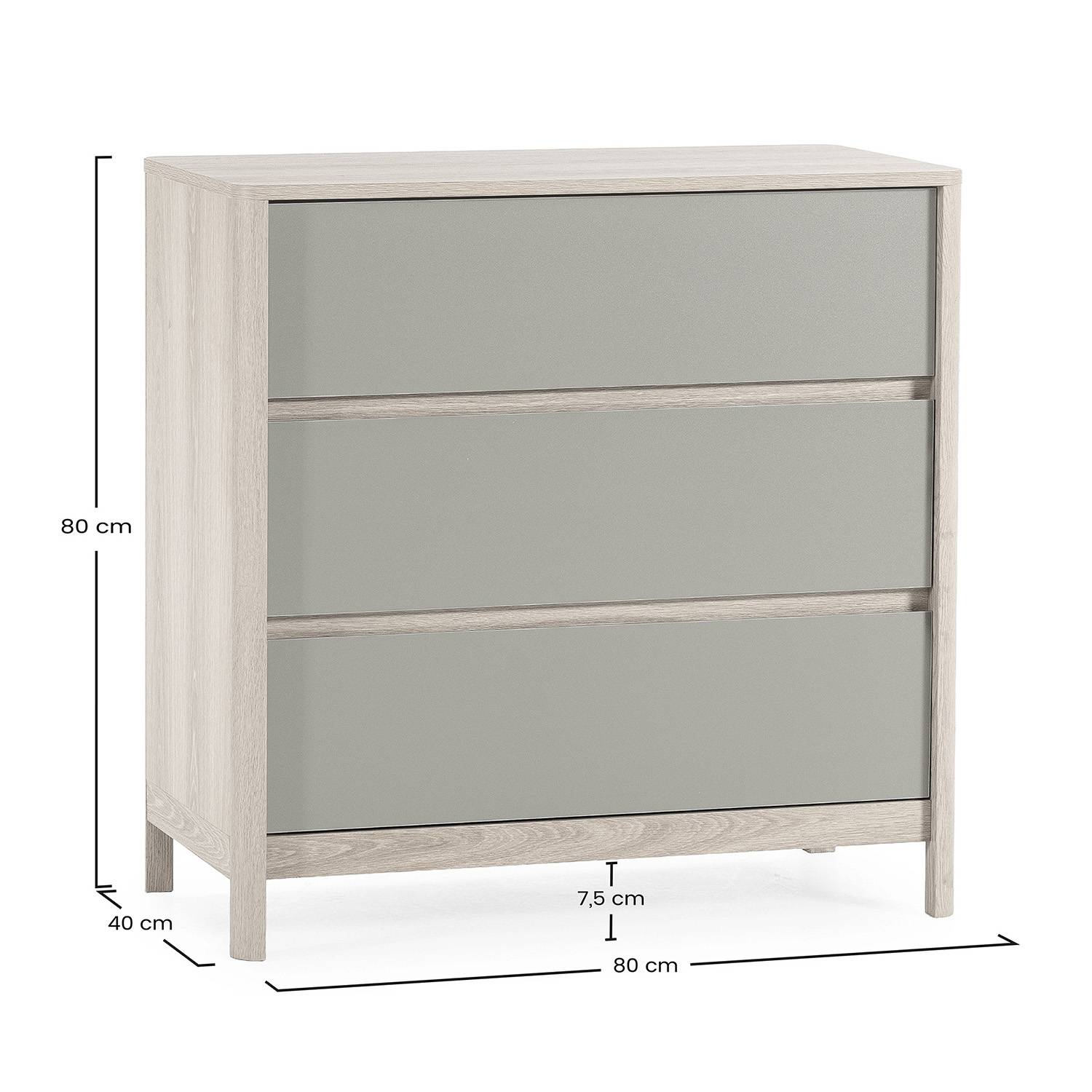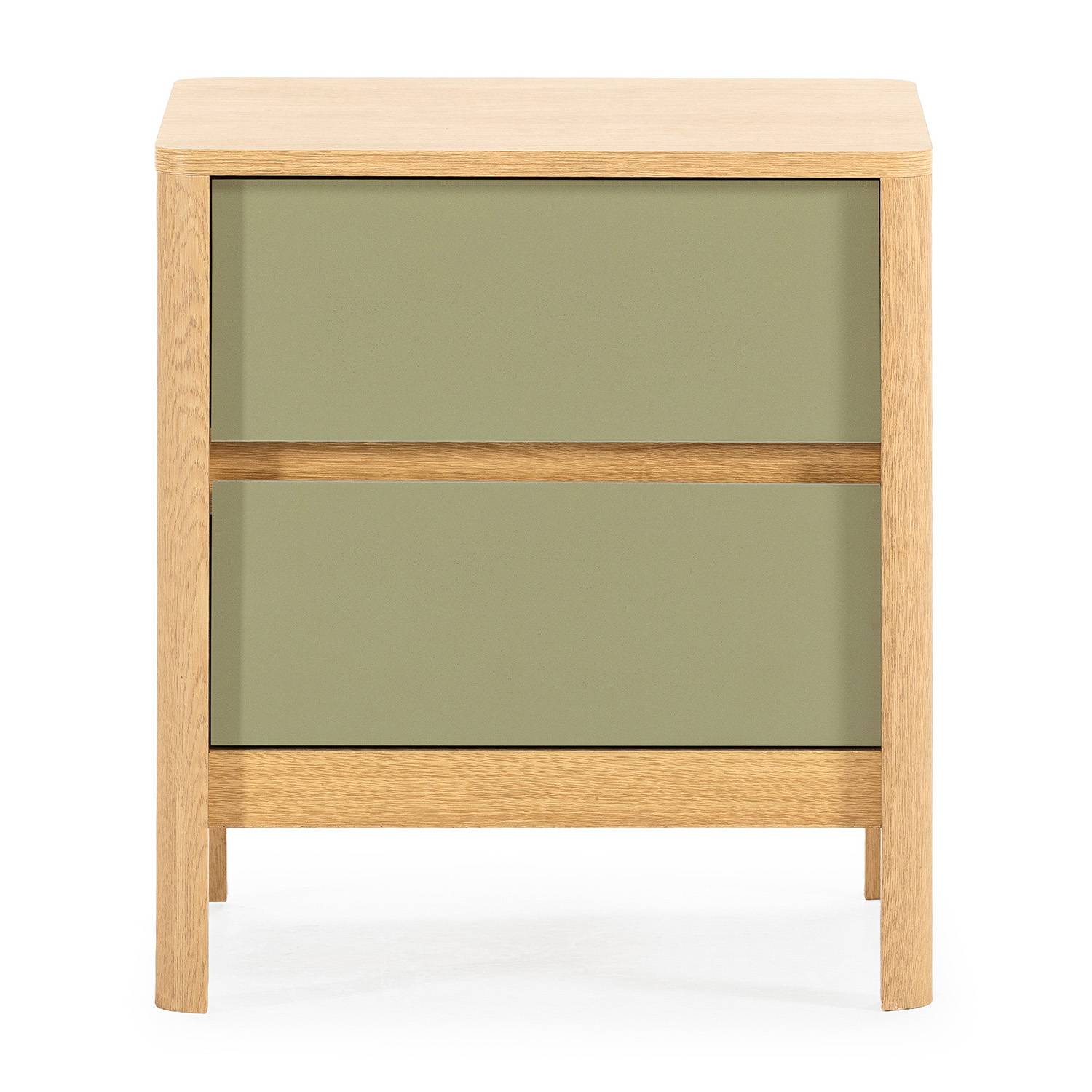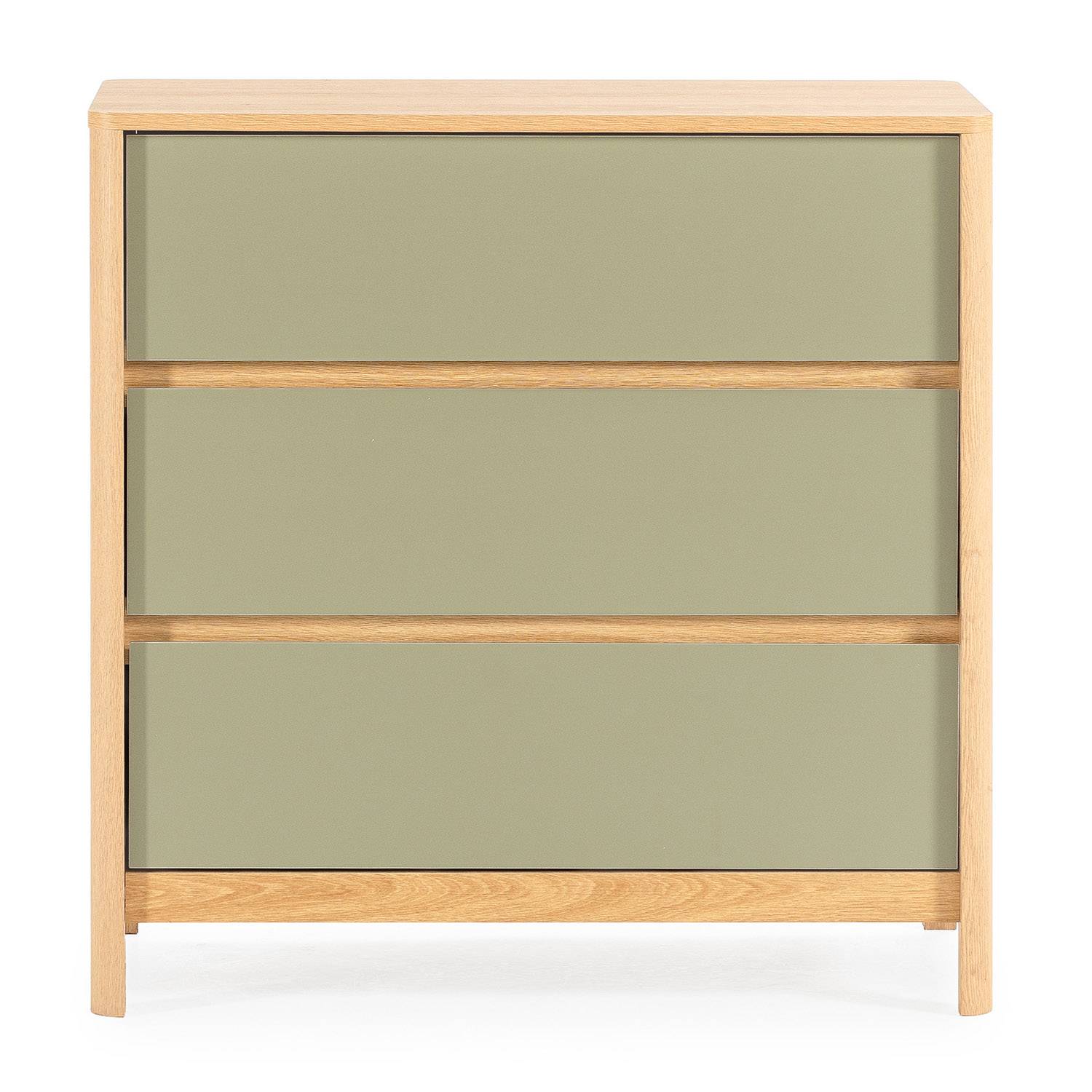 La estructura principal de ambos muebles se presenta en dos combinaciones decorativas. La primera opción apuesta por una estética uniforme, con estructura y frontal de cajones en color roble, ideal para ambientes cálidos, naturales y fáciles de combinar. La segunda alternativa mantiene la estructura en roble e incorpora el frontal de los cajones en color verde, un contraste que aporta un toque decorativo diferenciador sin perder la sensación de calidez.