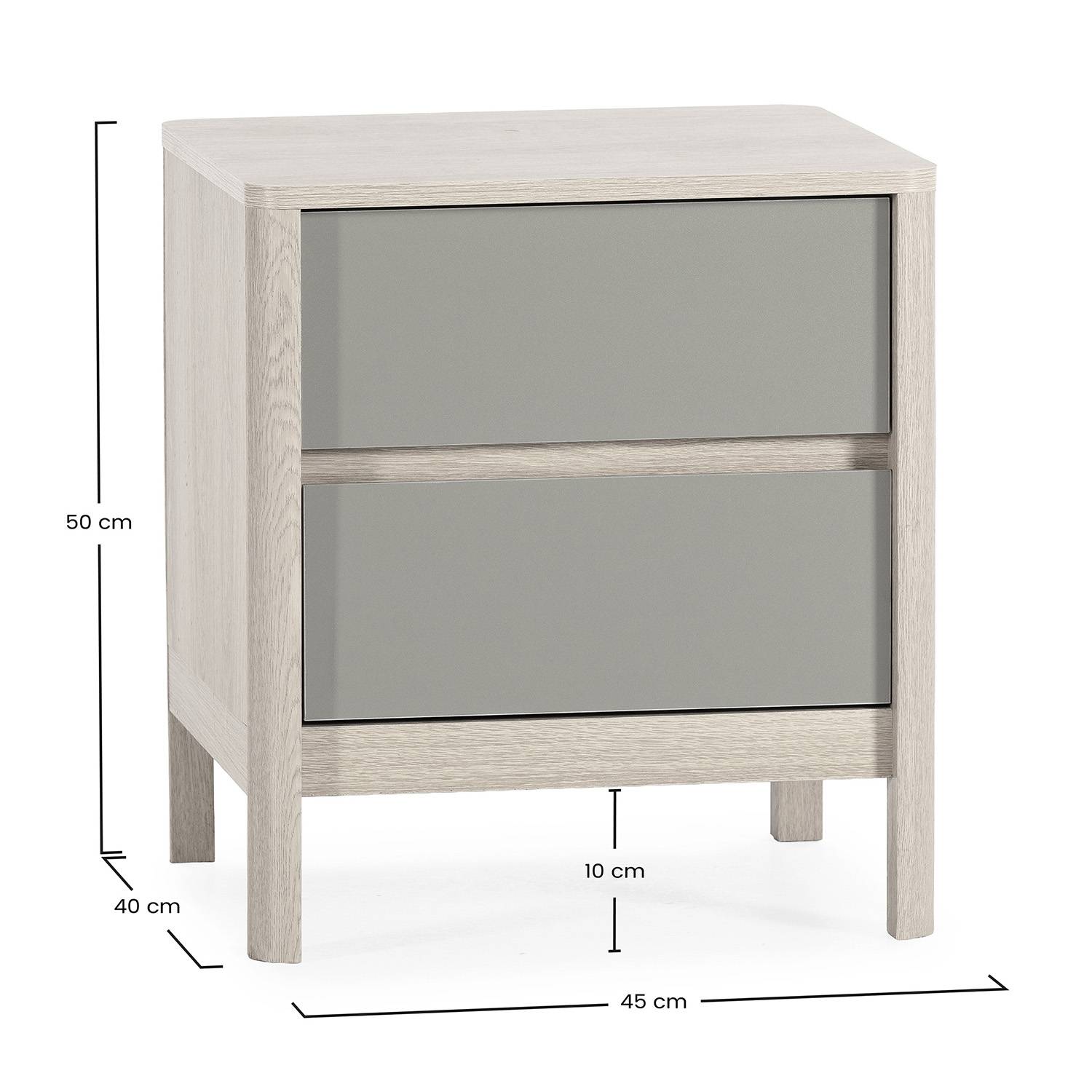 La mesita de noche cuenta con patas de 10 cm de altura, mientras que la cómoda incorpora patas de 7,5 cm. Esta elevación aporta ligereza visual y facilita la limpieza de la parte inferior.