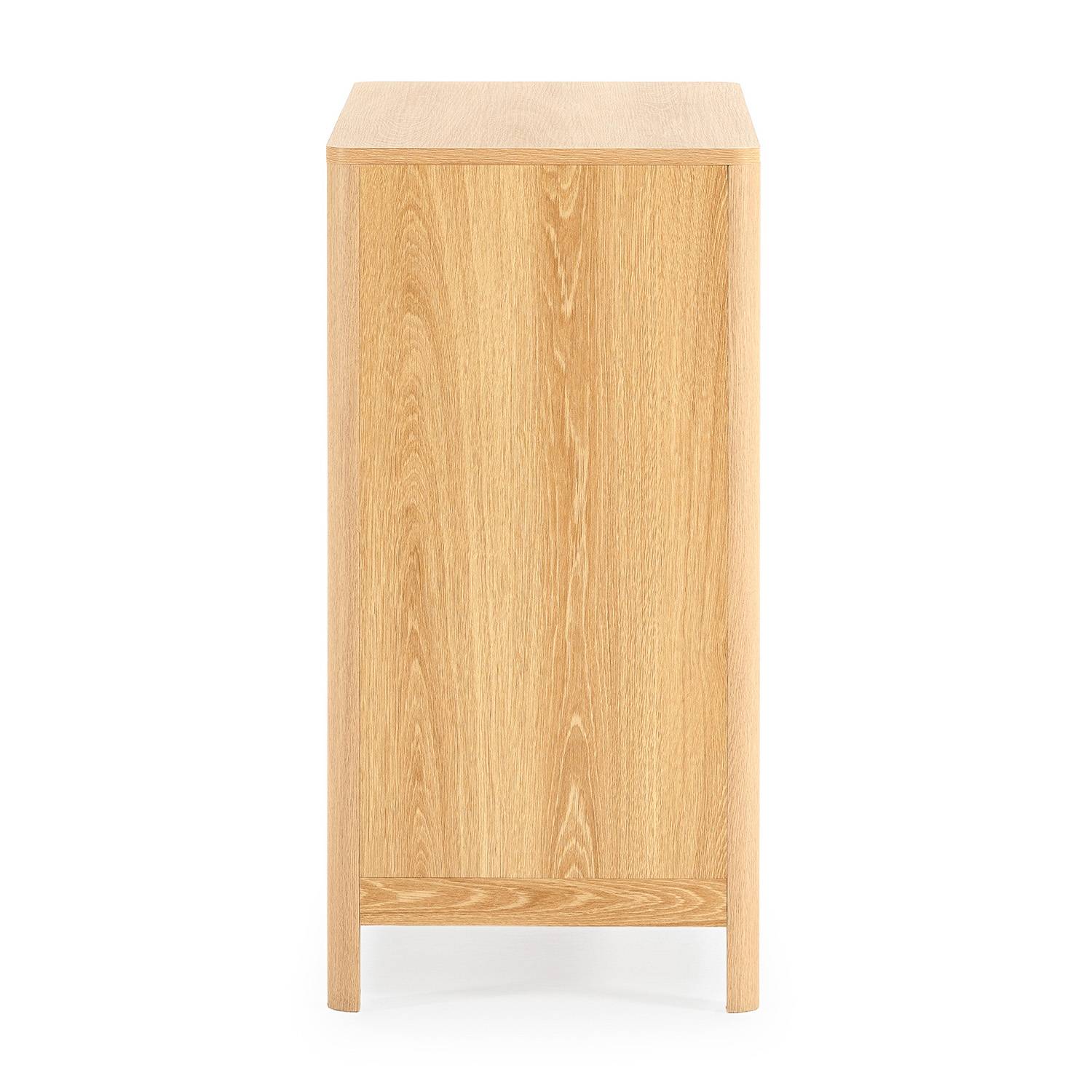 Los cajones incorporan un sistema de apertura tipo uñero integrado, que permite prescindir de tiradores visibles y mantener un frontal limpio y continuo. En el cajón superior, el uñero se sitúa en la parte inferior, mientras que en los demás cajones se encuentra en la parte superior, un detalle de diseño que aporta dinamismo al conjunto y refuerza su estilo elegante.