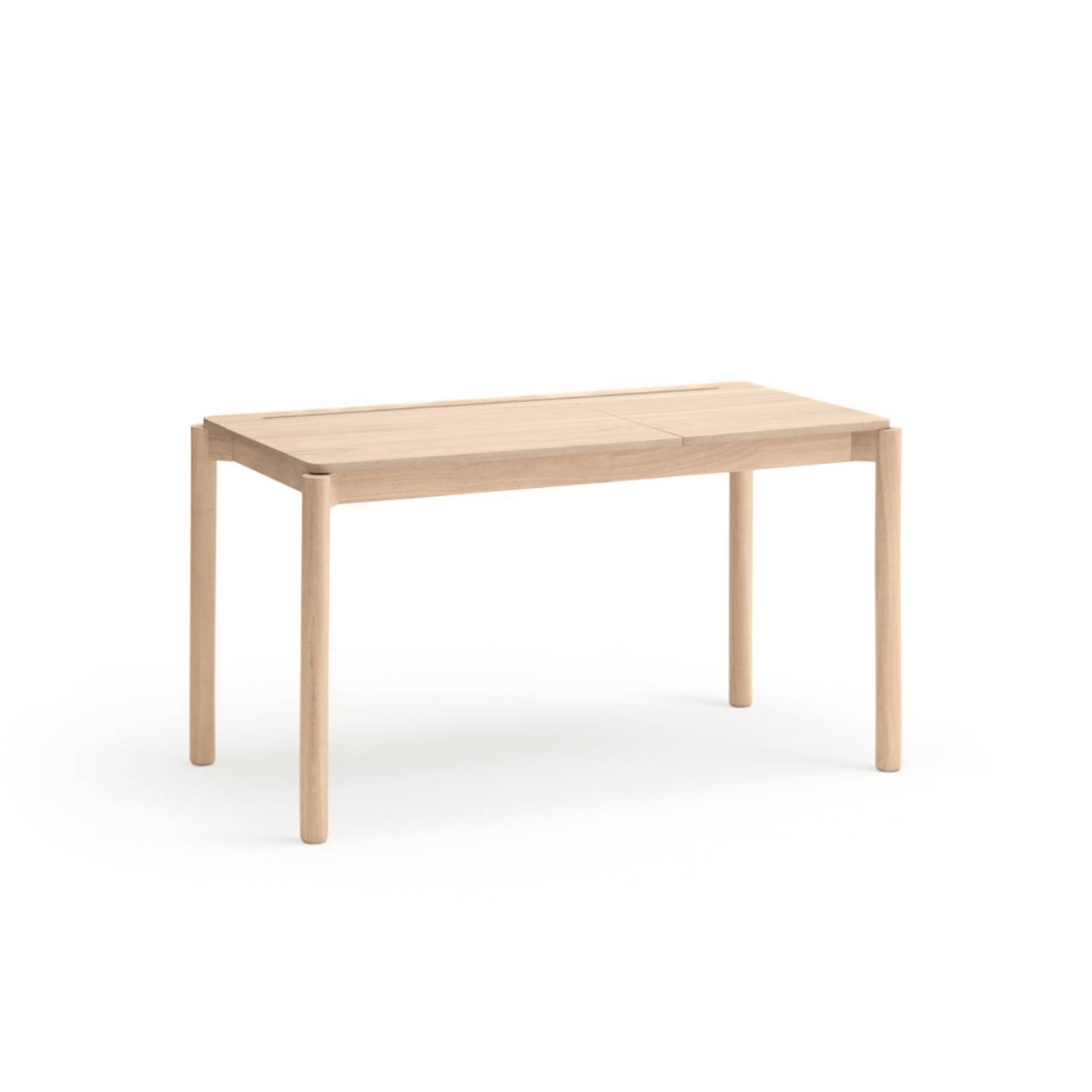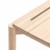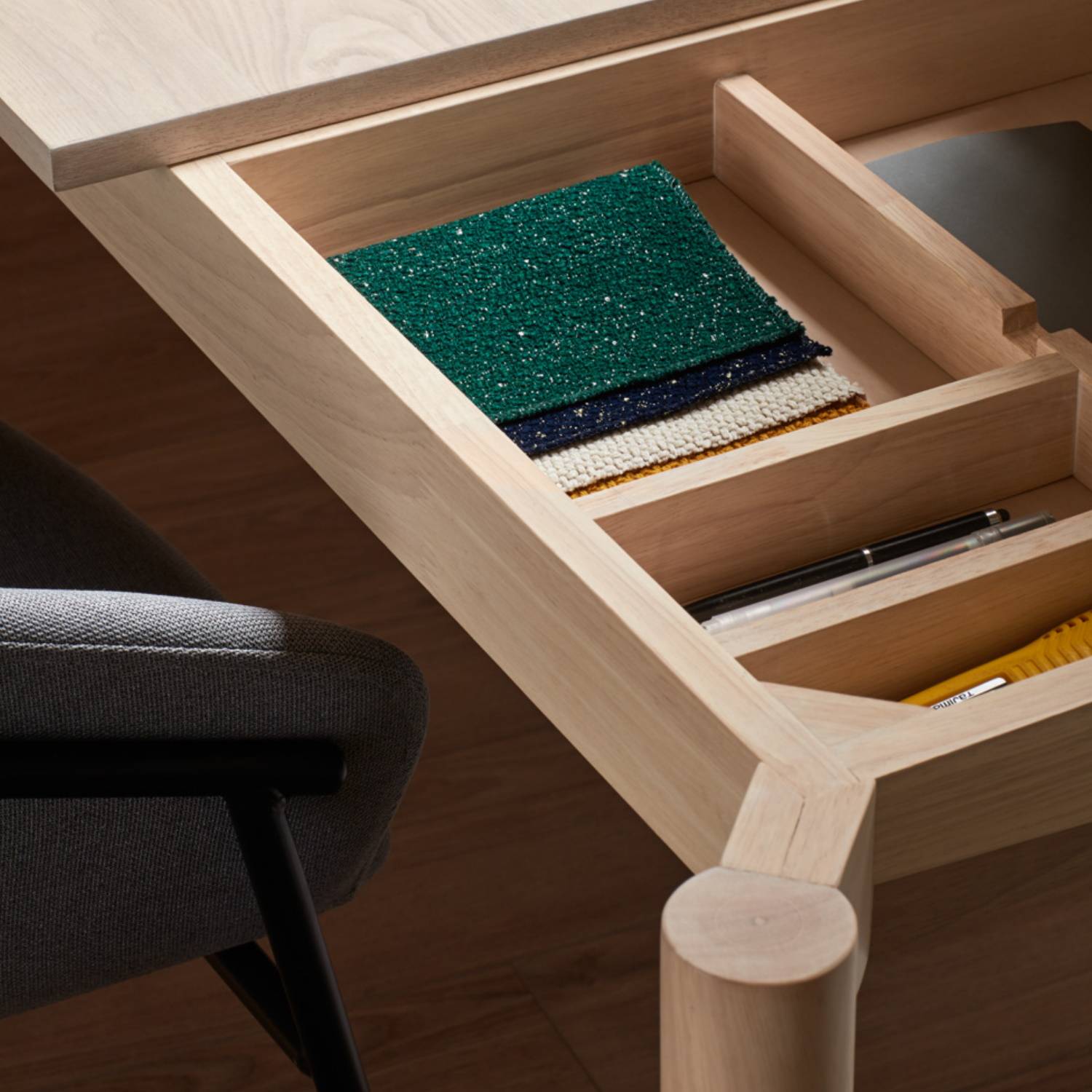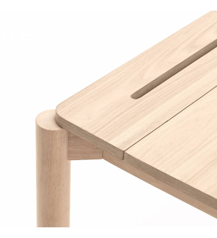 Escritorio Atlas de Teulat. Dispone de compartimentos para poder almacenar los cables del ordenador y otros elementos para que todo quede ordenado. Las patas son de madera maciza y el sobre esta chapado en fresno natural o tintado en negro.