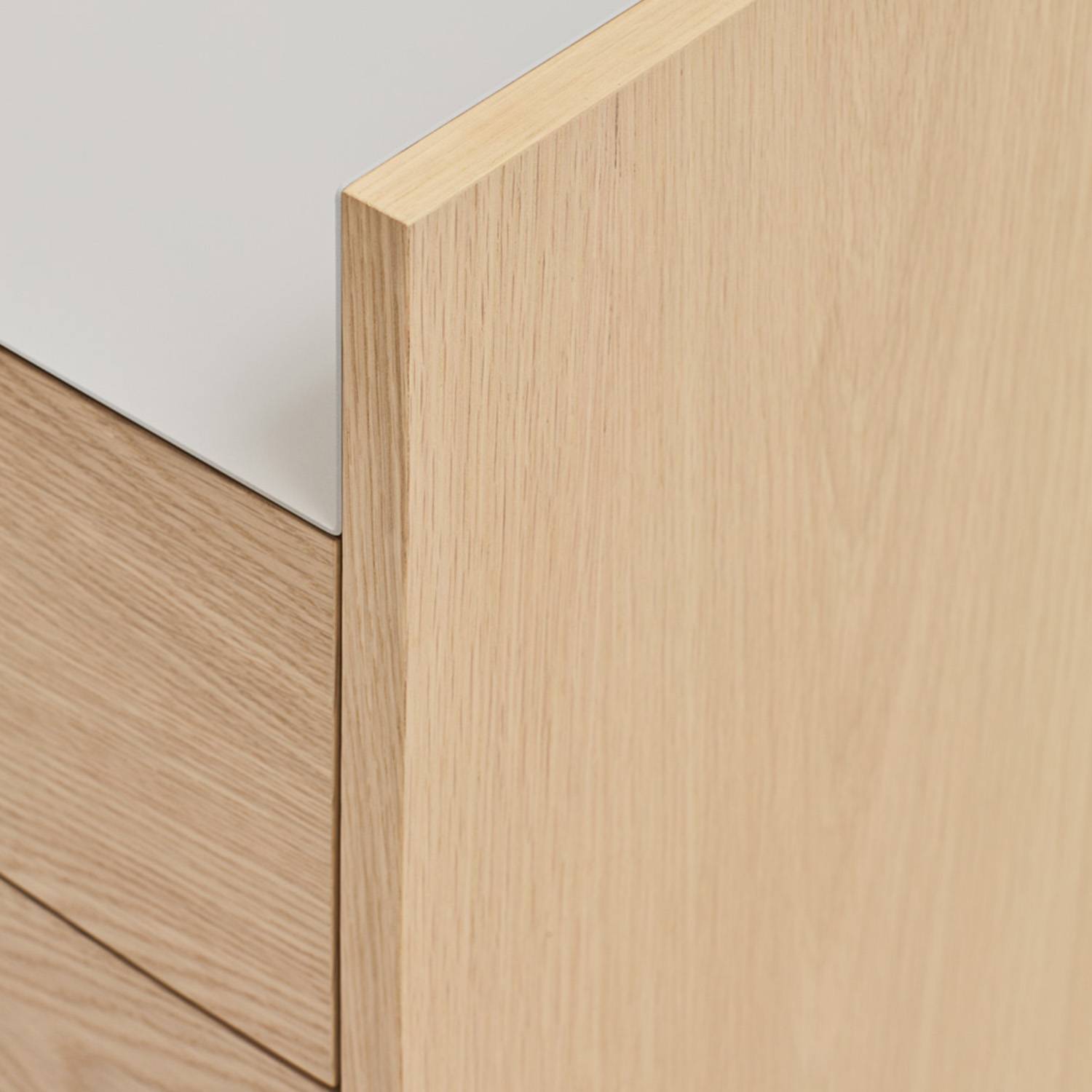 Cómoda de madera de pino de 4 cajones y 1 puerta; en un lateral los 3 cajones más grandes y, en el otro lado, 1 cajón más pequeño y una puerta. Disponible en blanco, cera y gris antracita. Tablero superior en madera embellecida. Sin tiradores.