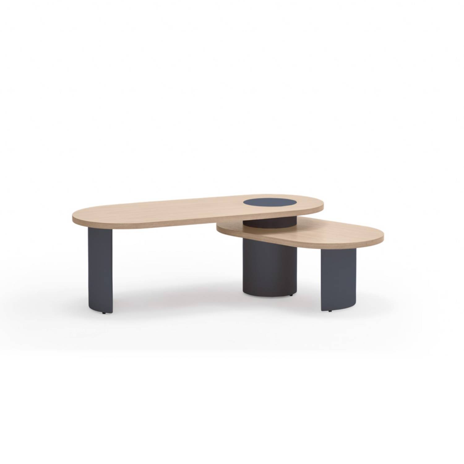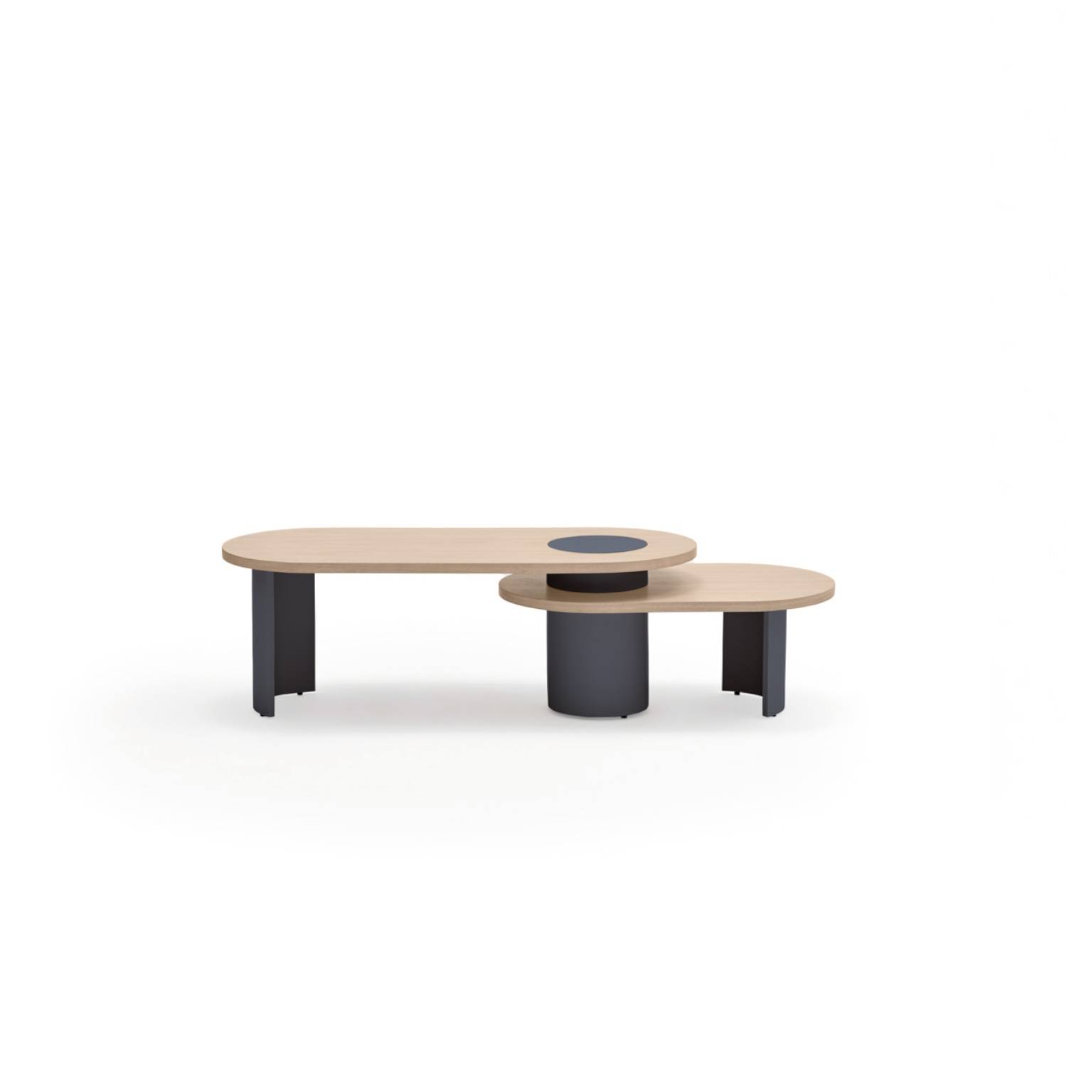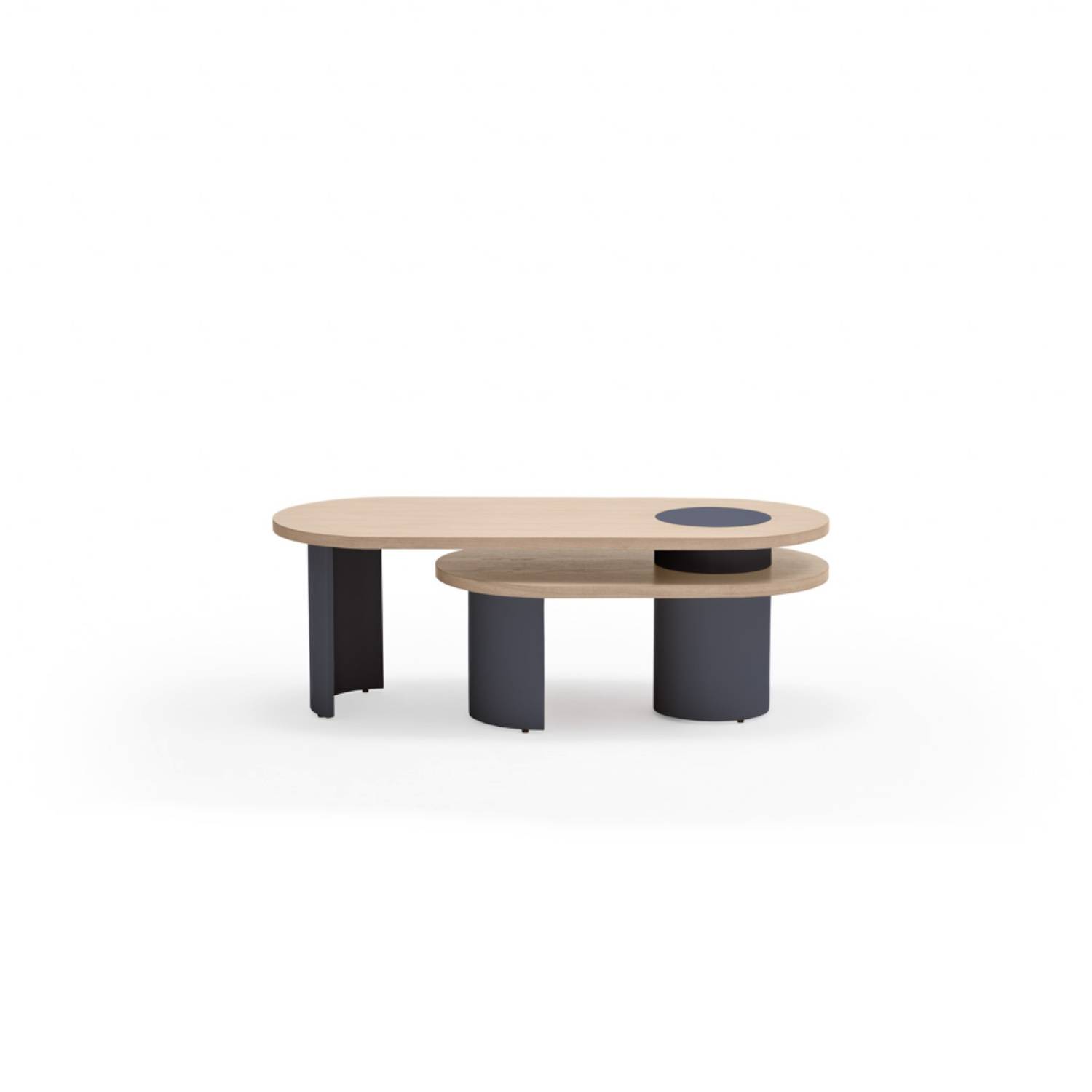 La Mesa de centro ovalada de 2 alturas Nori esta diseñada por Teulat, con un estilo moderno, vanguardista y rompedor. Disponible en tres colores: completamente negro, azul oscuro con natural y crema con natural.