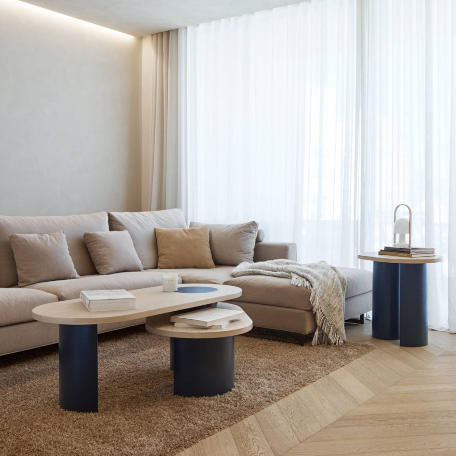 En la mesa de centro ovalada Nori, la geometría de sus piezas en combinación con el contraste entre color y material hacen que esta colección encaje a la perfección con los ambientes más actuales. Está fabricada en madera MDF/FLM y está disponible en tres colores como crema y natural, negro, y azul oscuro y natural.