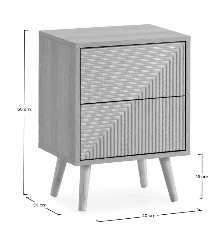 La mesita de noche de 2 cajones Louise destaca por el diseño del frontal de sus cajones con líneas paralelas en relieve con efecto espejo en su diagonal. Fabricada en melamina y patas de pino cónicas inclinadas. Cuenta con sistema push en sus cajones.
