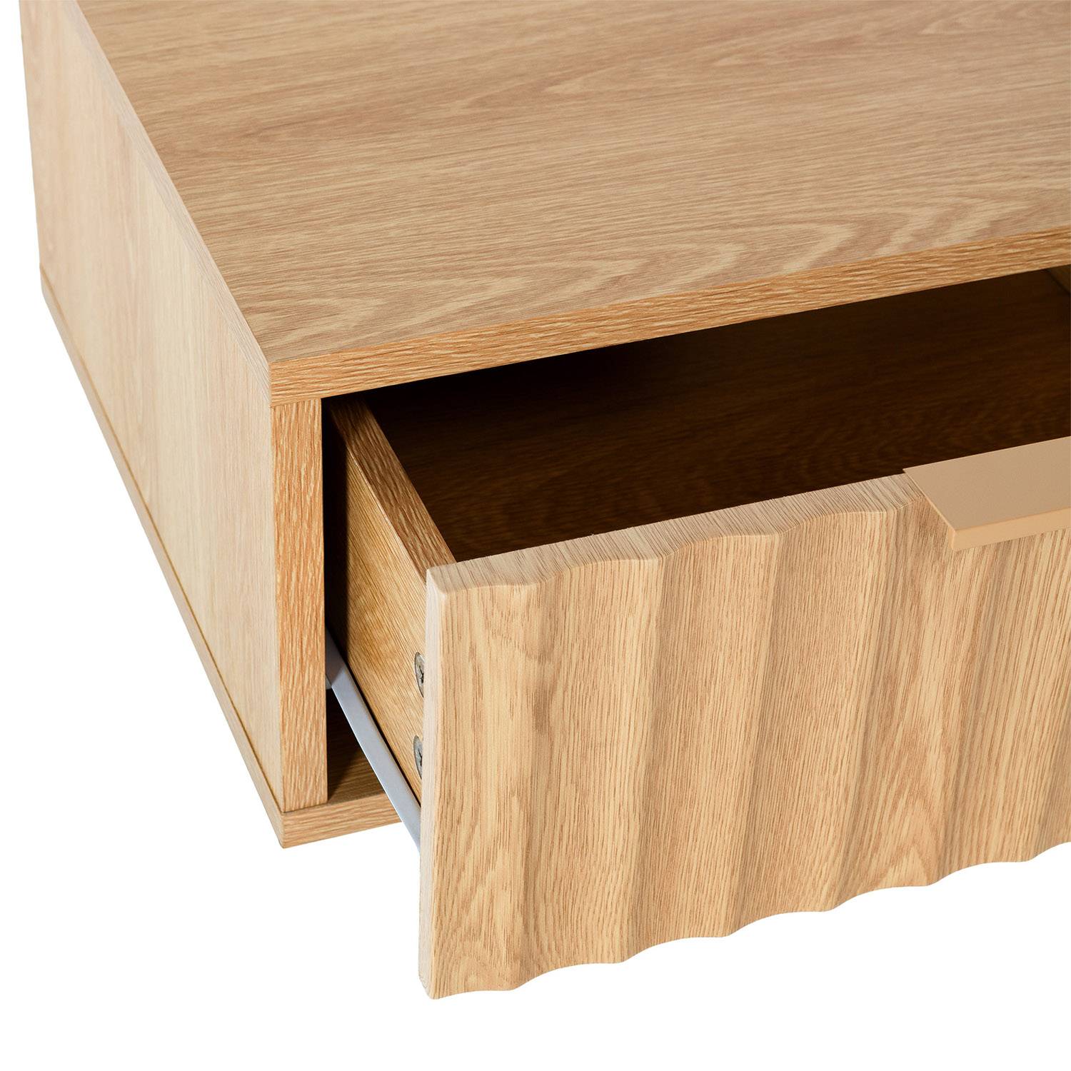 Destaca el diseño del frontal del cajón decorado con líneas verticales en relieve que le aporta textura y este toque único que estas buscando. El conjunto se completa con tiradores metálicos a juego, que refuerzan su estilo moderno y aportan un acabado elegante.