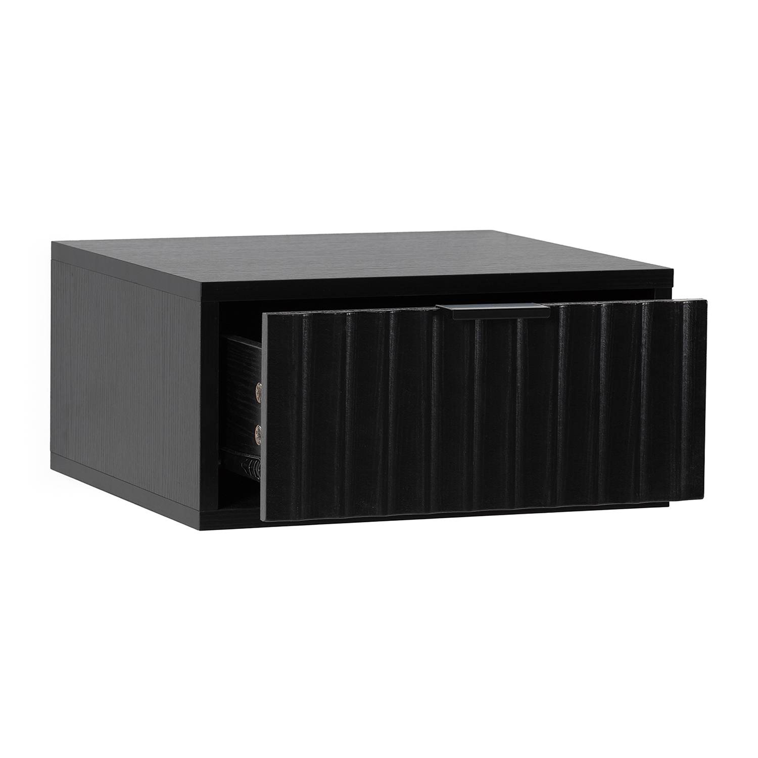 Esta mesita de noche de pared cuenta con un cajón con guías metálicas de deslizamiento suave, ideal para guardar el móvil, el cargador u otros pequeños objetos. Su superficie superior es perfecta para colocar un despertador, una lámpara auxiliar o un libro.