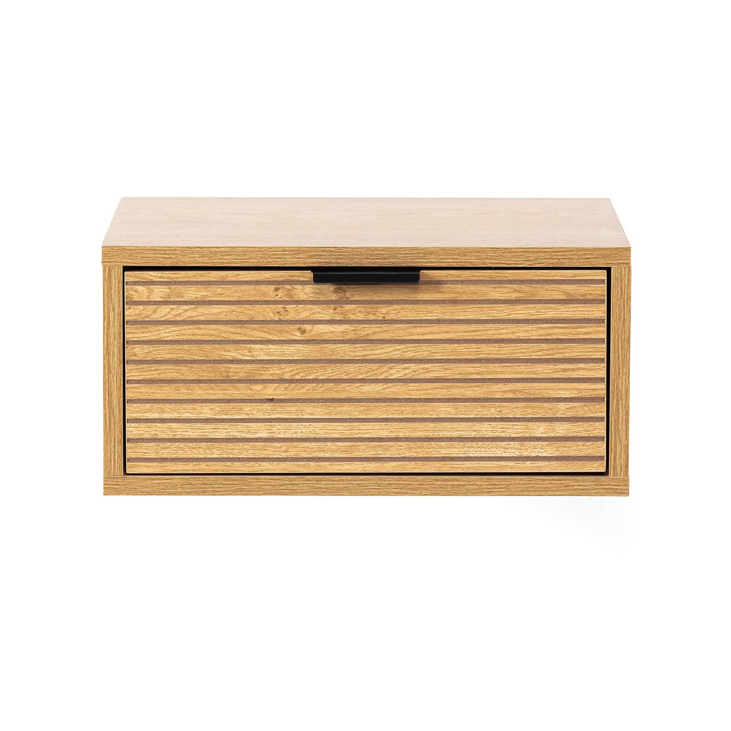 El frontal del cajón presenta elegantes relieves horizontales que añaden textura y profundidad al mueble, consiguiendo un toque único. El tirador metálico negro combina perfectamente con el tono del roble, aportando un contraste sutil pero llamativo. Gracias a sus guías metálicas, el cajón ofrece una apertura y cierre suave, silencioso y duradero.