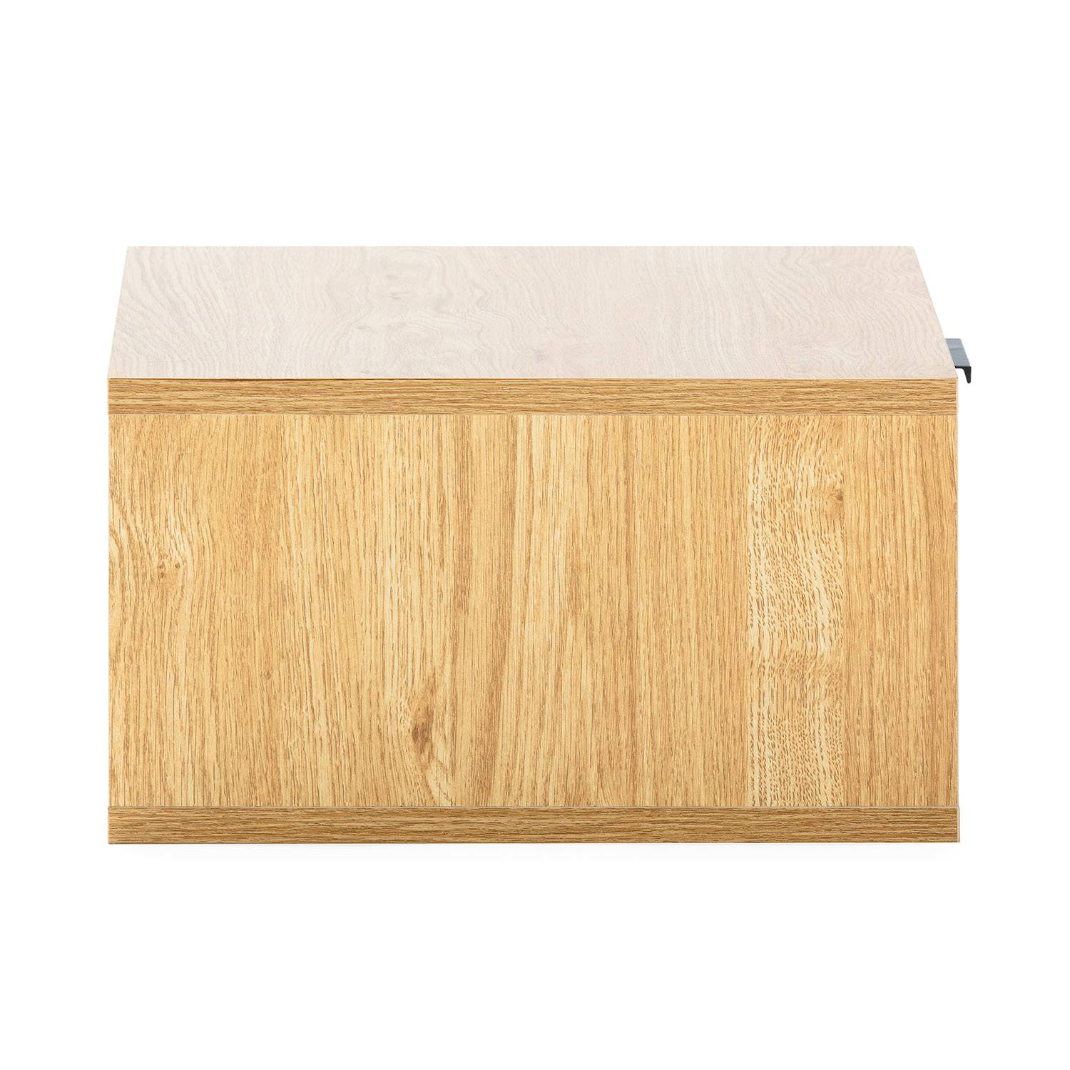 Esta mesita de noche flotante color roble destaca por sus líneas limpias y por su elegancia. Su instalación en la pared crea un efecto de ligereza que despeja el espacio, permitiendo una fácil limpieza del suelo y reforzando la armonía del dormitorio. Al no tener patas, ofrece un efecto visual suspendido que eleva el diseño de cualquier habitación.