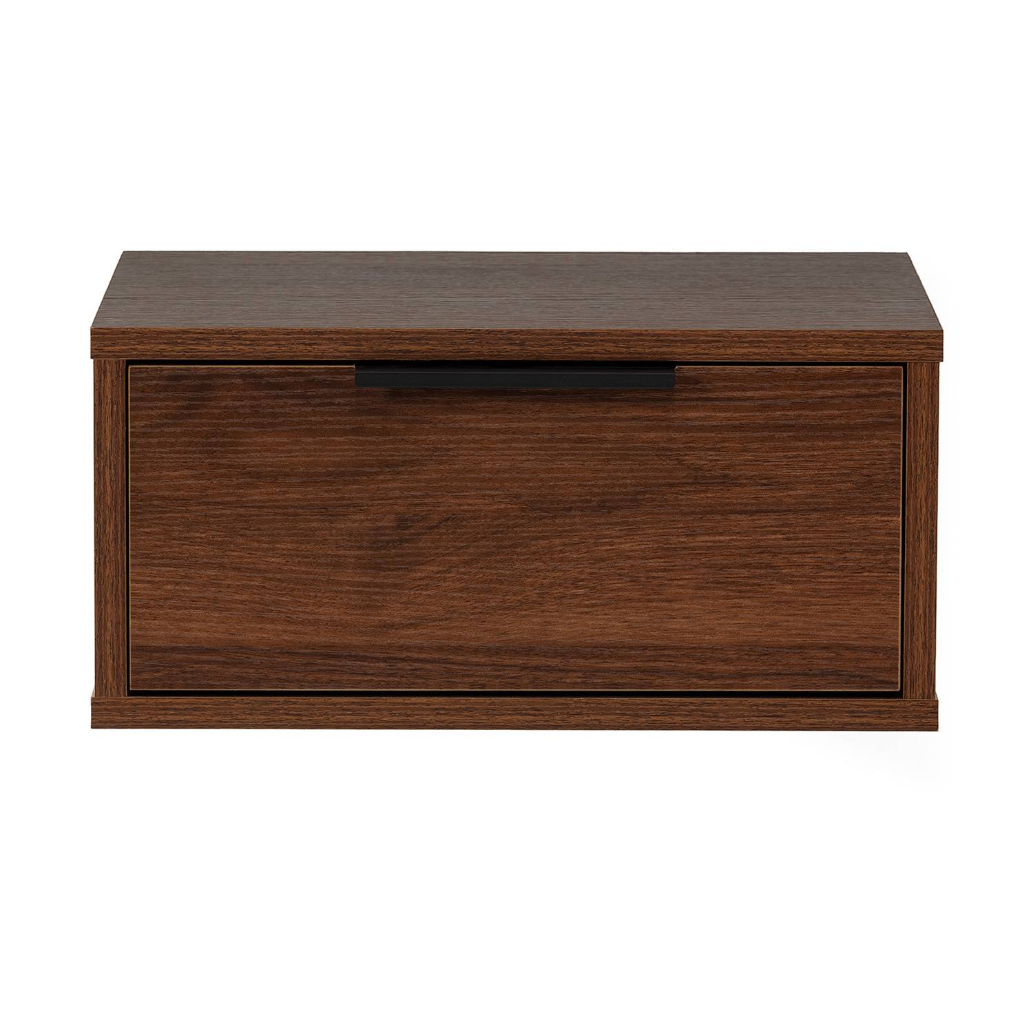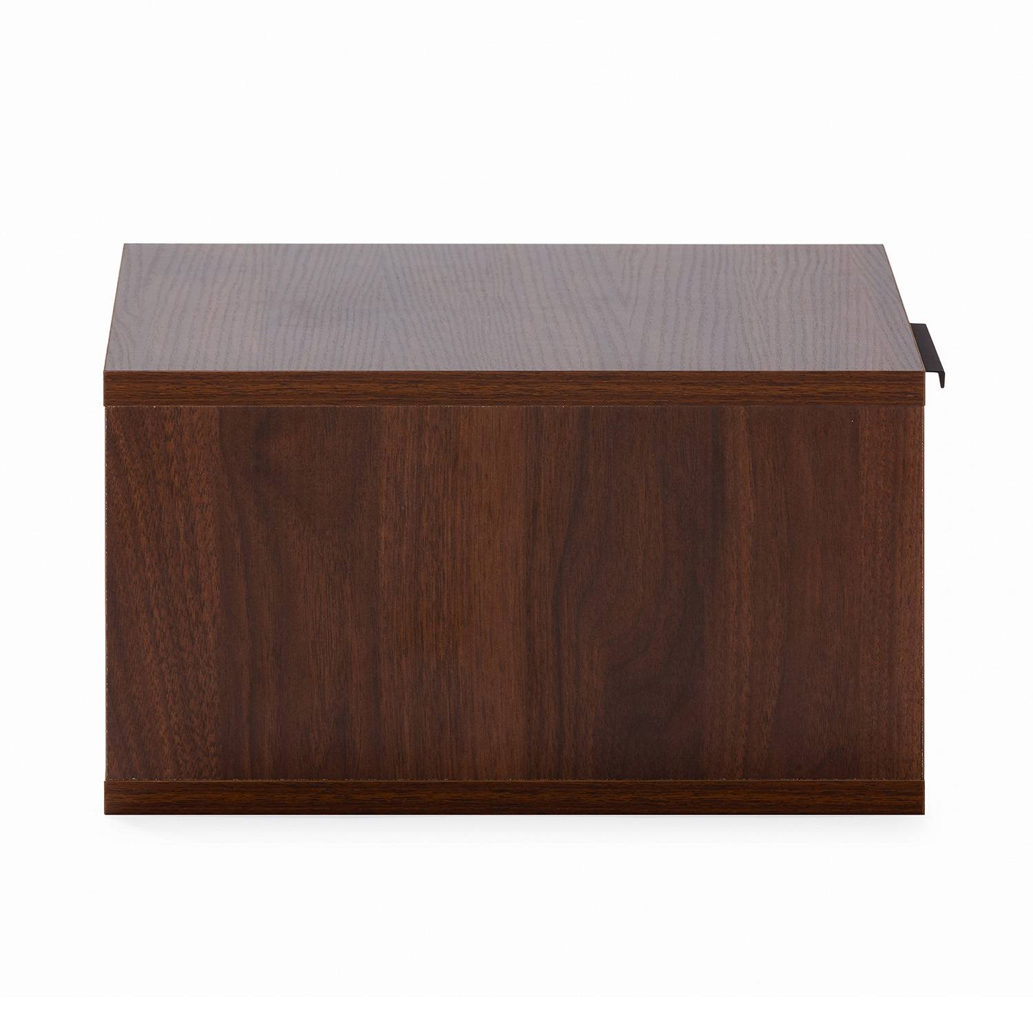Esta mesita flotante incorpora un cajón con guías metálicas que garantizan una apertura y cierre suaves, ofreciendo un espacio de almacenaje práctico para mantener organizados y accesibles, objetos personales y pequeños accesorios. El tirador metálico en color negro aporta un detalle discreto y elegante que contrasta con el acabado del mueble y refuerza su carácter moderno.