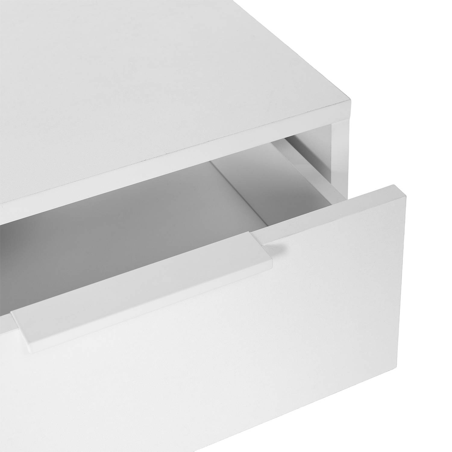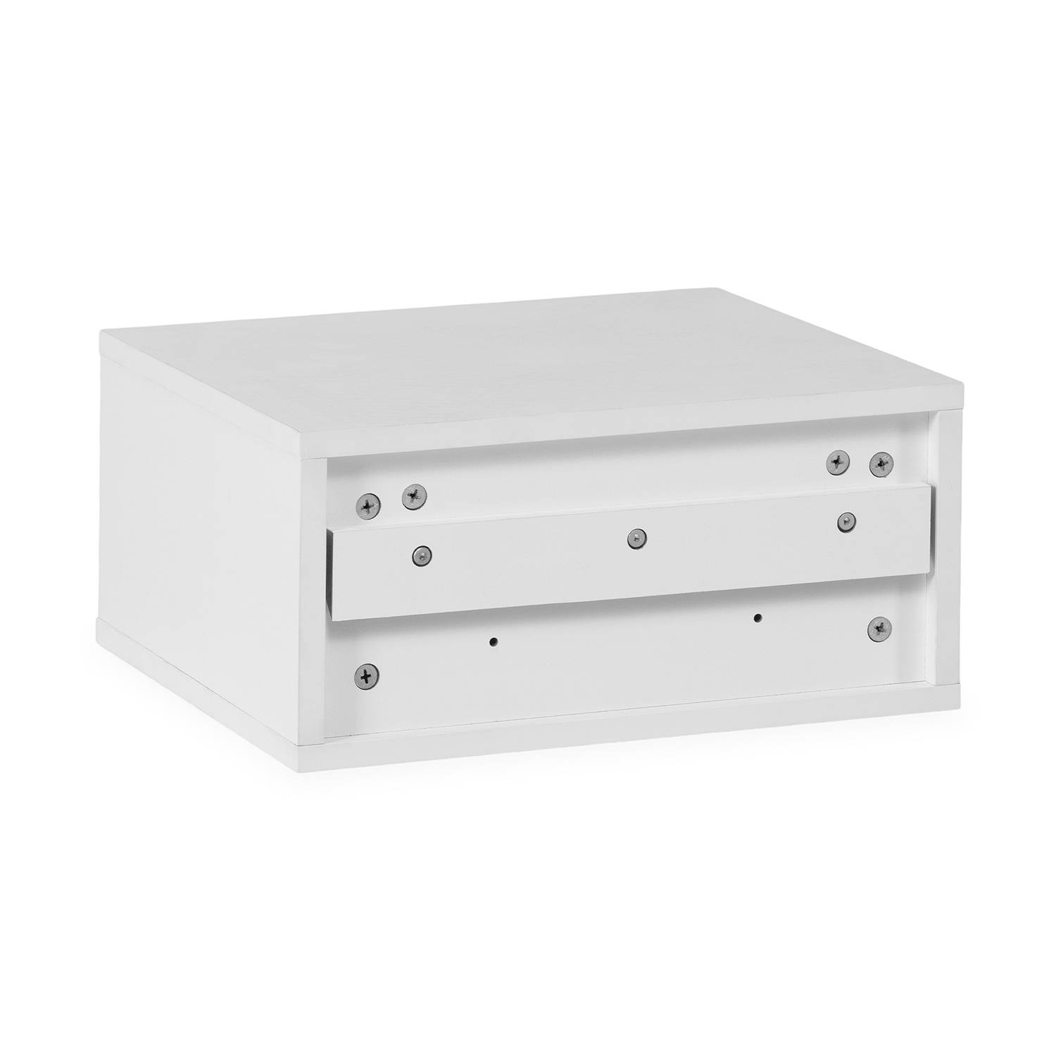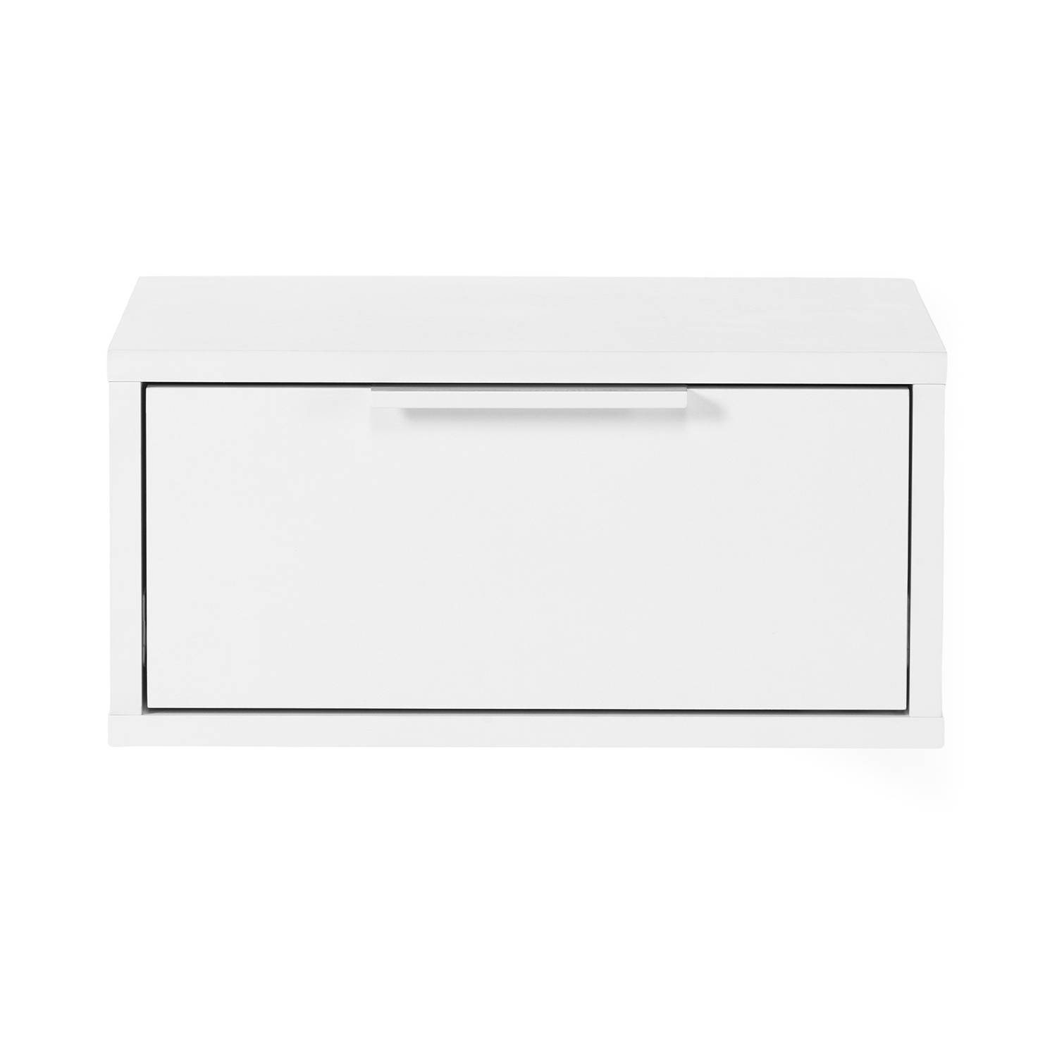 Esta mesita flotante incorpora un cajón con guías metálicas que garantizan una apertura y cierre suaves, ofreciendo un espacio de almacenaje práctico para mantener organizados y accesibles, objetos personales y pequeños accesorios. El tirador metálico en color negro aporta un detalle discreto y elegante que contrasta con el acabado del mueble y refuerza su carácter moderno.