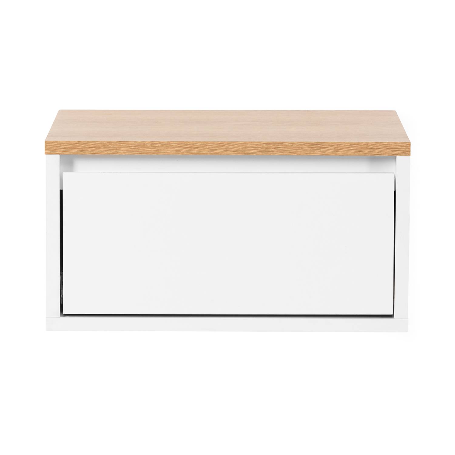 La mesita suspendida Phoebe esta fabricada en melamina de calidad de 15 mm. Diseño minimalista con cajón sin tirador y apertura tipo uñero. Disponible en blanco o negro con tablero superior en color roble. Ideal para dormitorio de estilo minimalista.