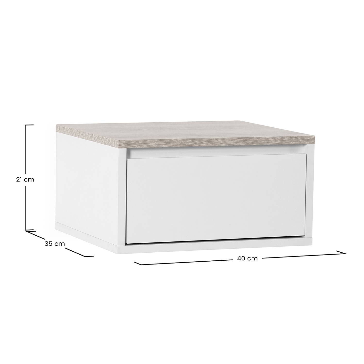 La estructura principal de esta mesita de noche suspendida está disponible en dos combinaciones de color. La versión en blanco aporta luminosidad y una sensación visual ligera, combinando de forma equilibrada con el tablero superior en color roble, que introduce un acabado cálido y natural. La opción en negro ofrece una estética más sobria y elegante, creando un contraste definido con la superficie superior en roble, adecuada para ambientes modernos o de inspiración industrial.