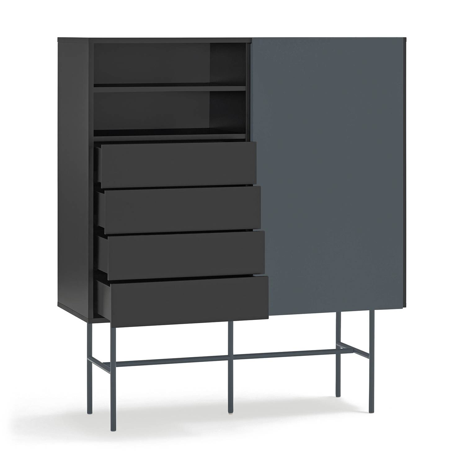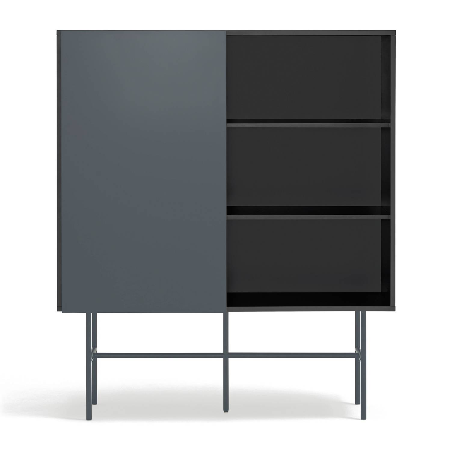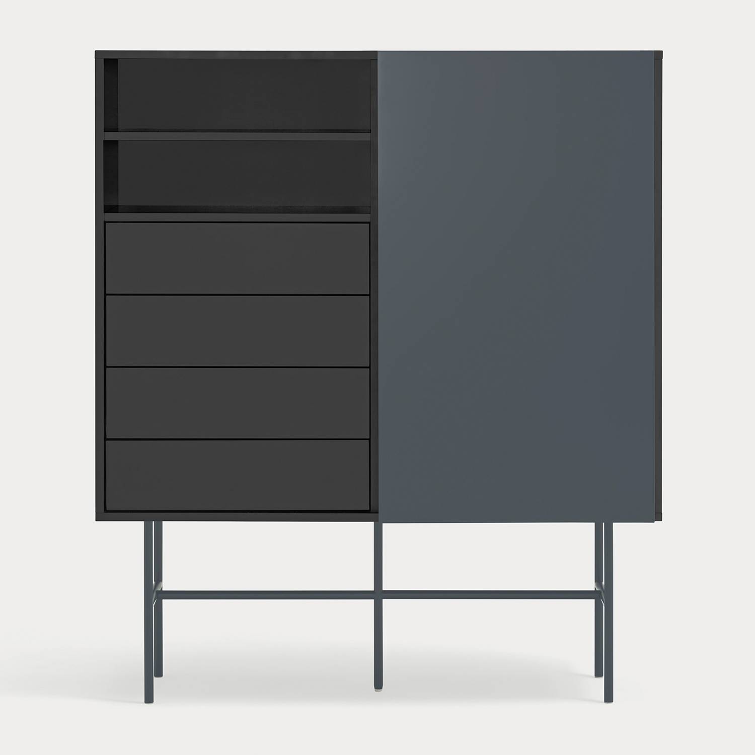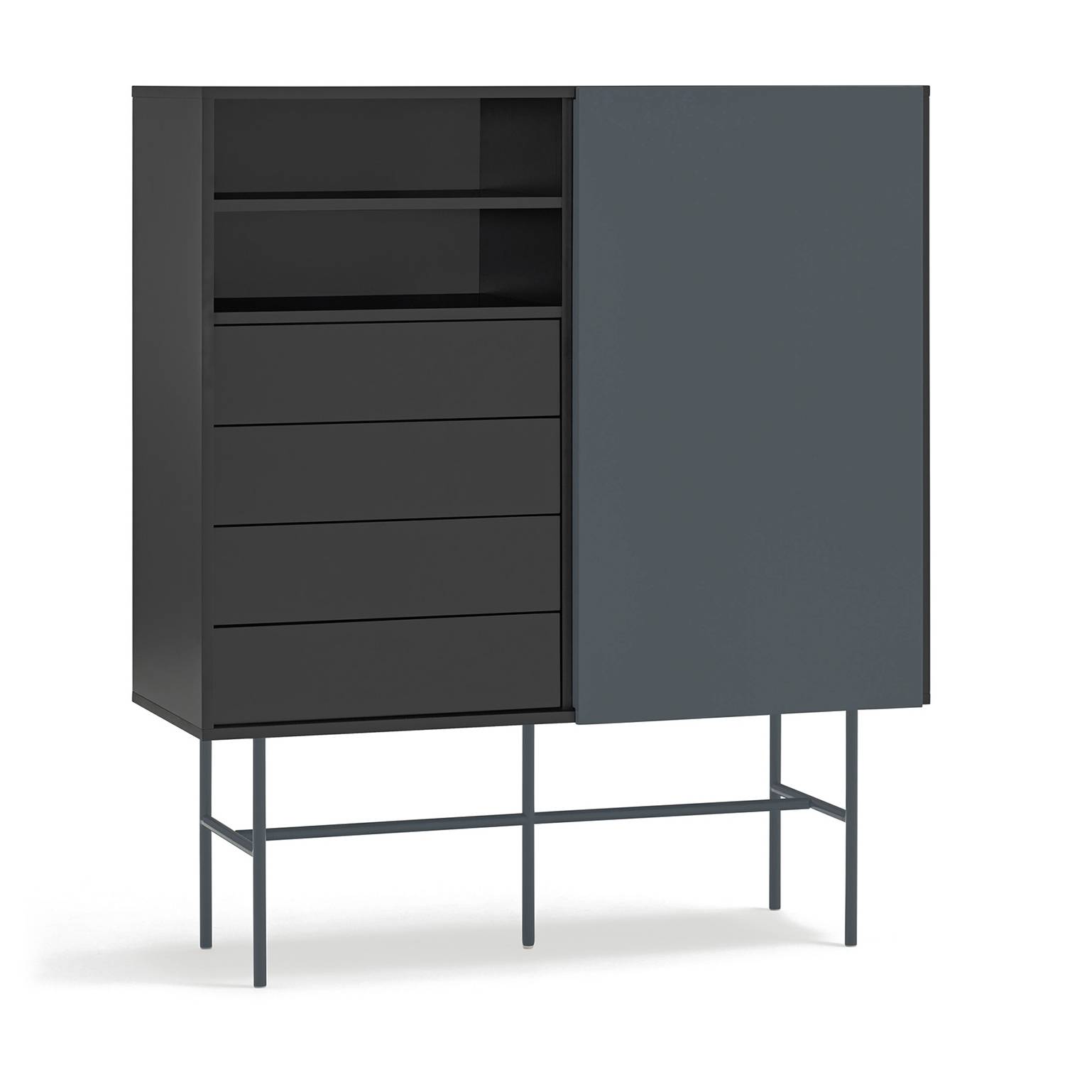 El mueble auxiliar para comedor Nube de diseño moderno esta fabricado en MDF de calidad y cuenta con patas metálicas redondeadas. Dispone de puerta corredera, múltiples huecos y cajones para una organización óptima. Disponible en elegantes combinaciones de color.