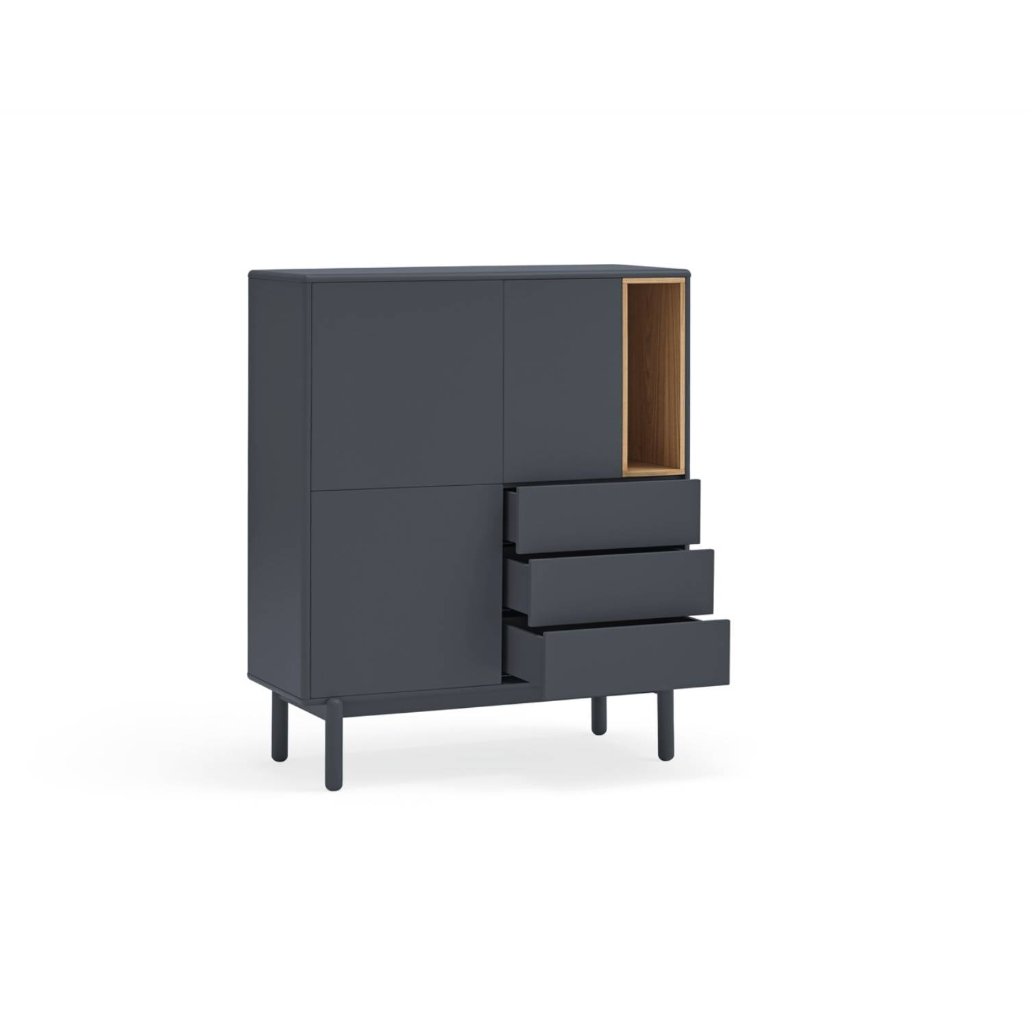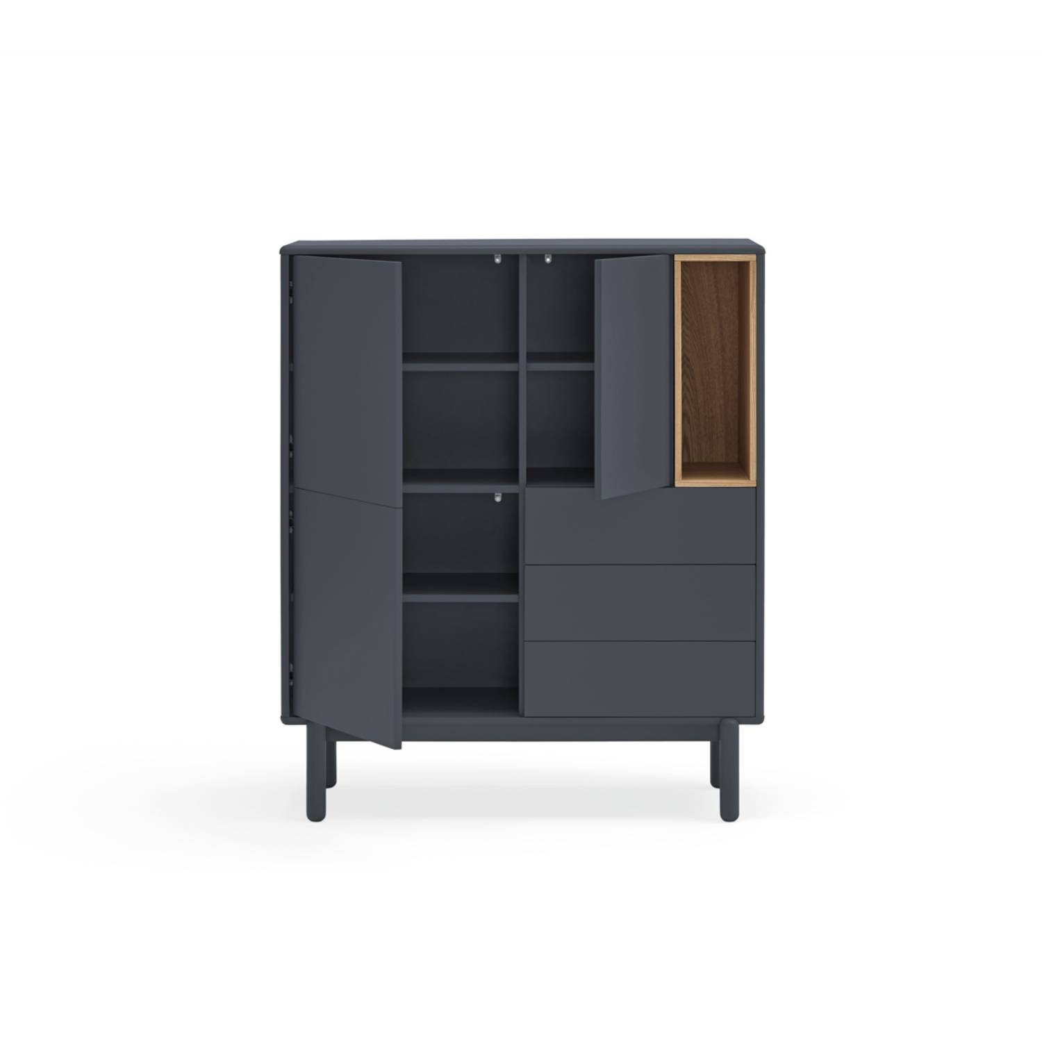 El auxiliar Punto presenta dos puertas. El interior consta de cuatro amplios cajones y cuatro baldas, ofreciendo un espacio de almacenaje ordenado y flexible.