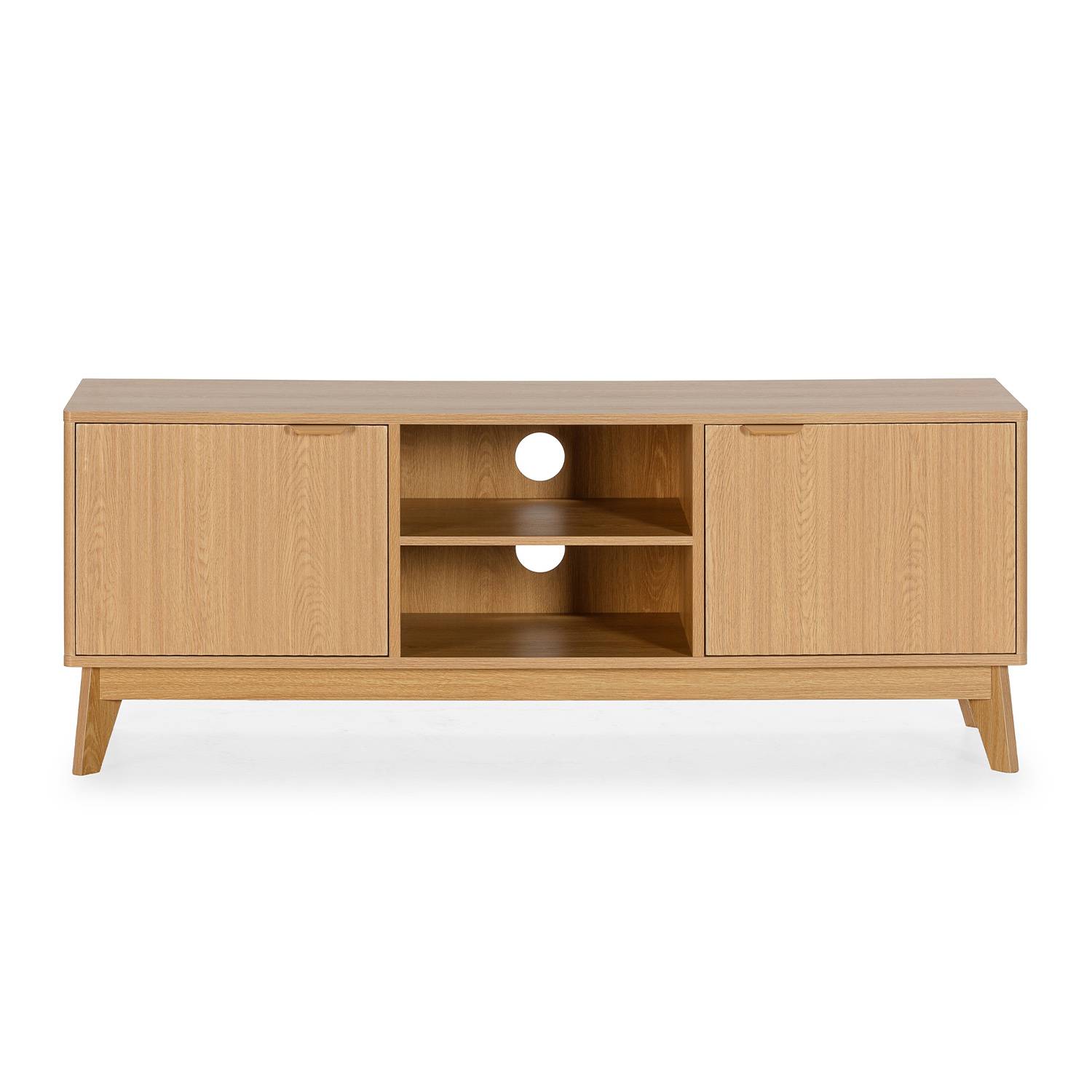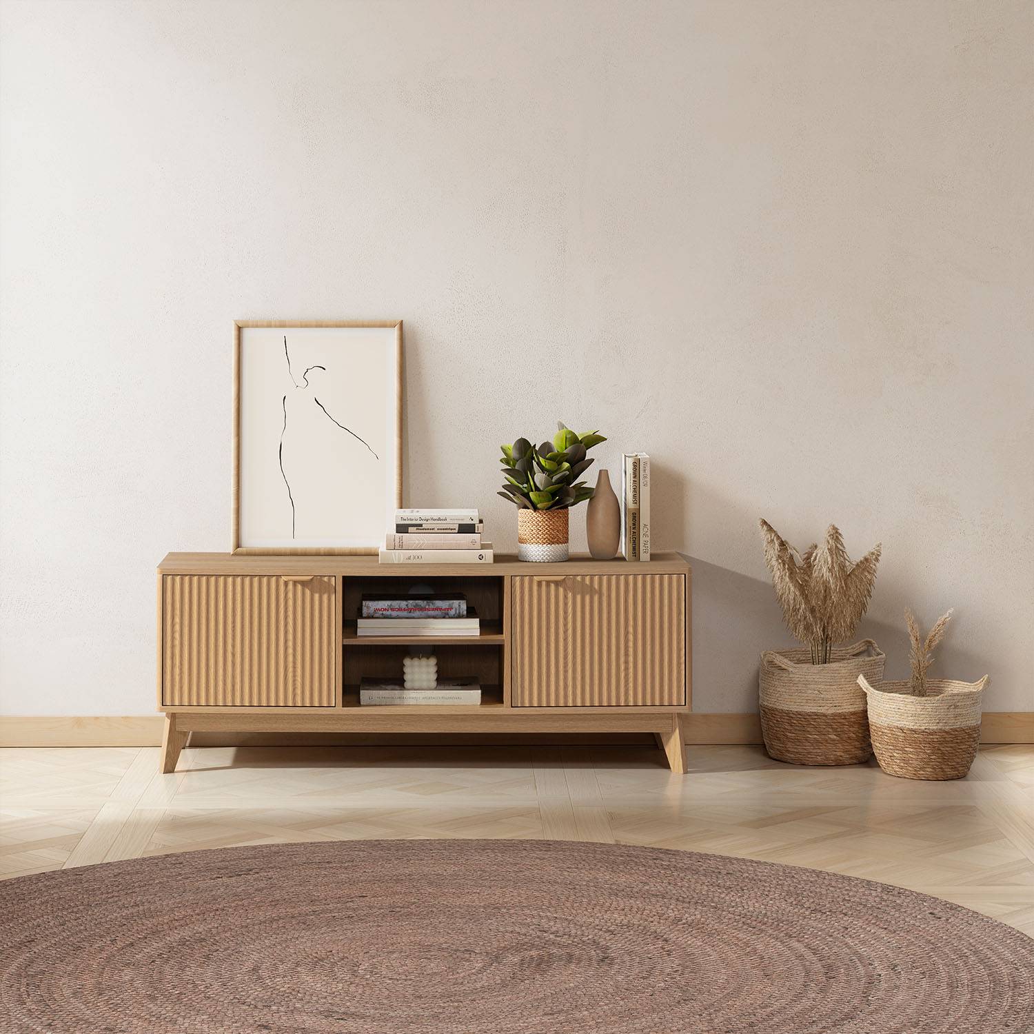 El mueble TV destaca por su diseño funcional y estético. Dispone de dos puertas laterales que permiten ocultar dispositivos o accesorios y dos huecos centrales dispuestos en sentido vertical para situar tus equipos multimedia, consolas o elementos decorativos.
