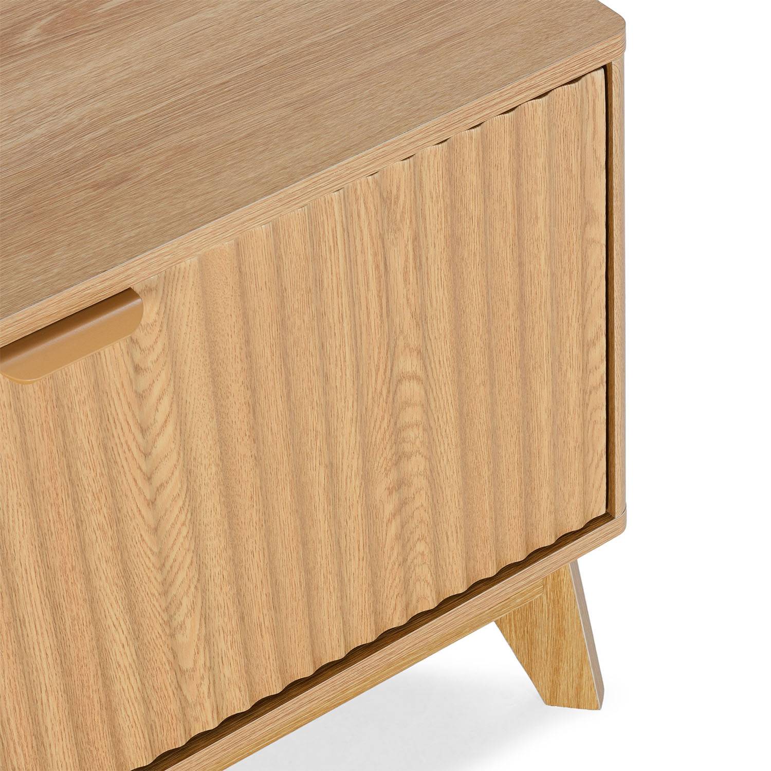 Destaca el frontal de las puertas con relieve aserrado en líneas paralelas verticales, una textura original que añade profundidad y dinamismo al diseño. Los tiradores metálicos combinan perfectamente con el tono roble del conjunto.