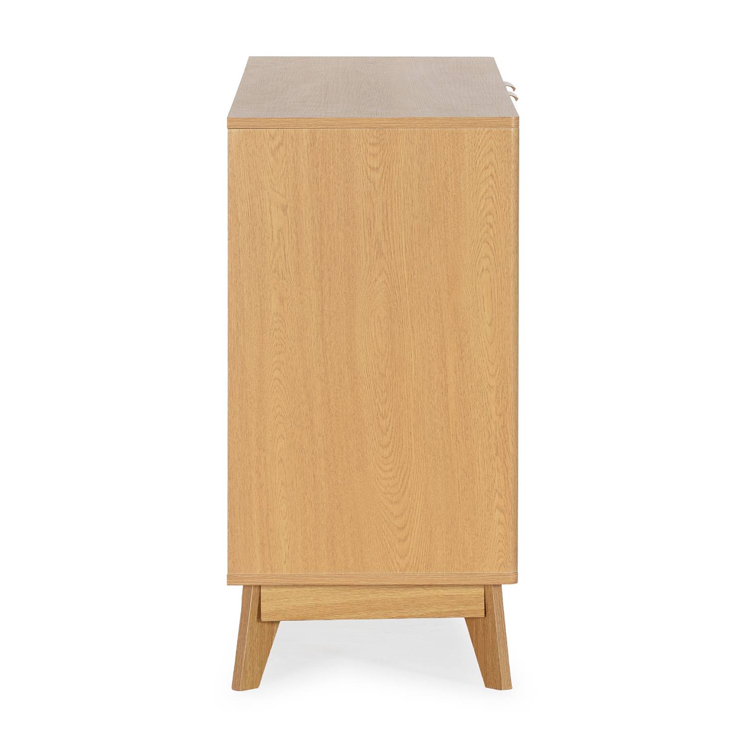 El aparador fusiona un diseño cuidado con una óptima capacidad de almacenamiento. Está compuesto por dos puertas y tres huecos verticales situados en uno de los laterales, ideales para guardar vajilla, mantelería o cualquier tipo de objeto que necesites tener a mano sin renunciar a la estética.