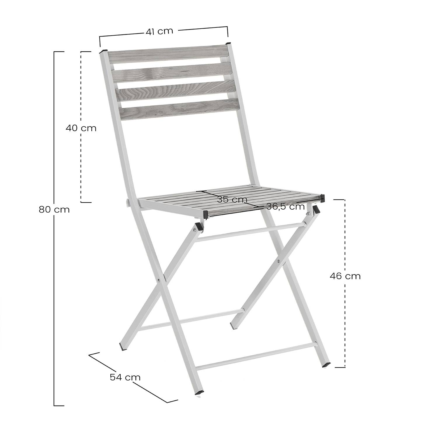 Medidas de la silla: 41 cm de largo, 54 cm de ancho, 80 cm de alto.