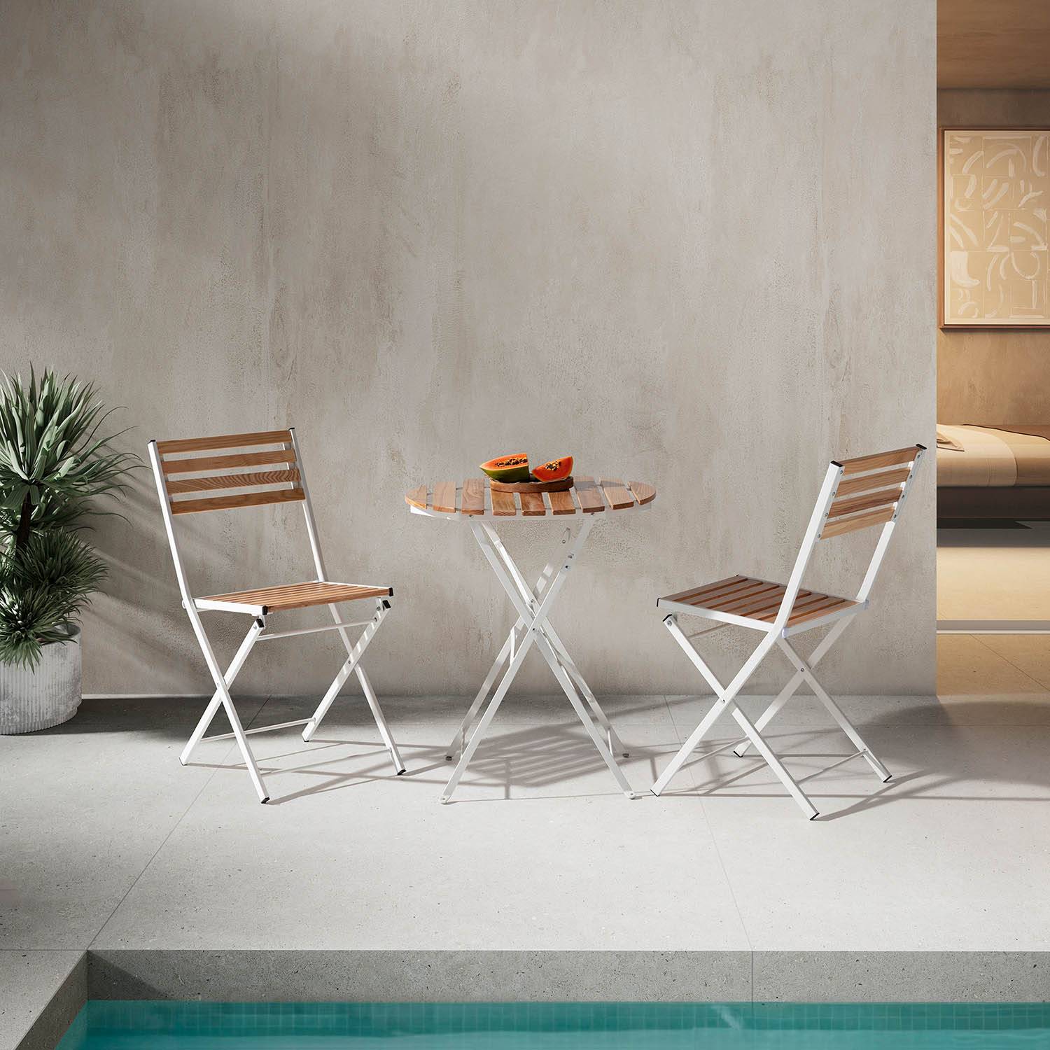El conjunto de 2 sillas plegables de exterior Isla es la elección perfecta para cualquier entorno al aire libre, ya sea un jardín, una terraza o un balcón. La combinación de madera y acero crea un equilibrio perfecto entre estilo y funcionalidad, adaptándose a cualquier decoración exterior y mejorando la estética de tu espacio.