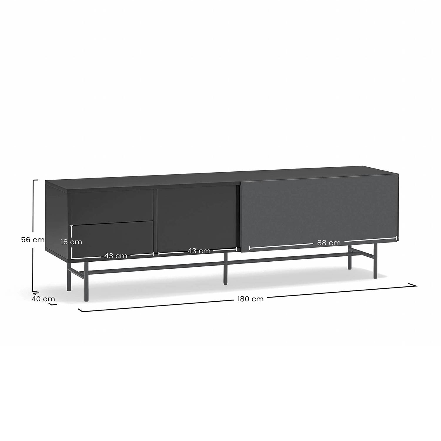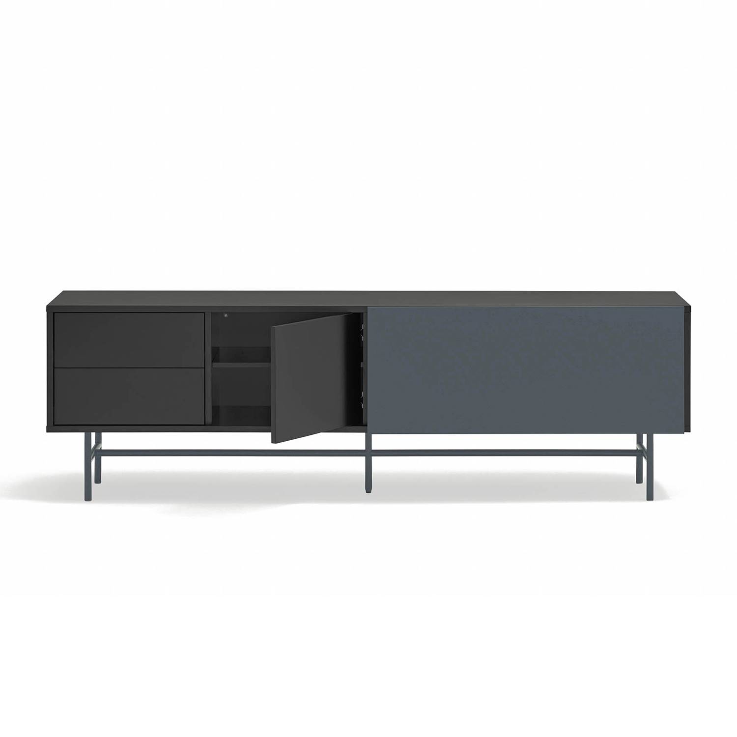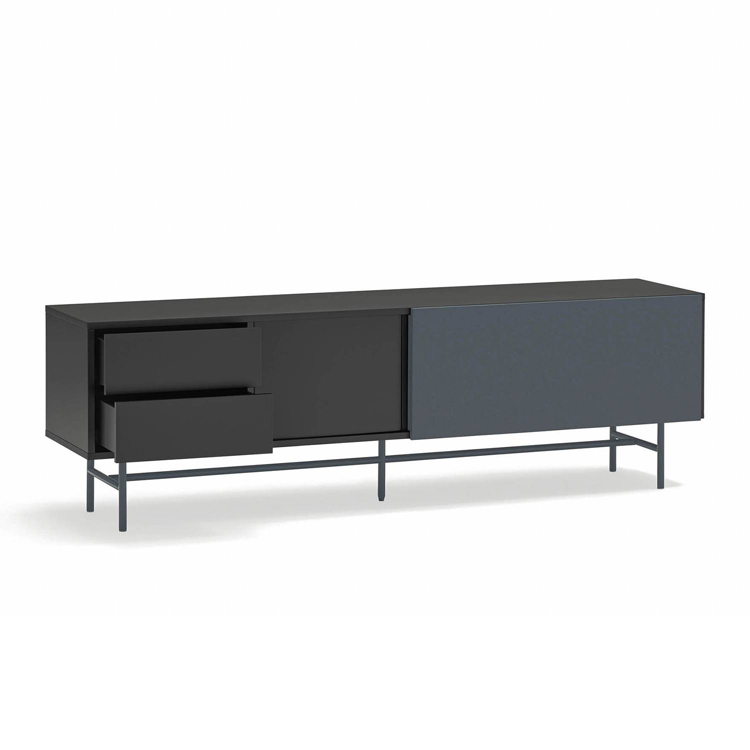 La sección izquierda de este mueble tv moderno está concebida para un almacenamiento ordenado. Incluye dos cajones dispuestos en vertical, ideales para guardar mandos, cables u otros accesorios, junto a una puerta que da acceso a dos huecos interiores.