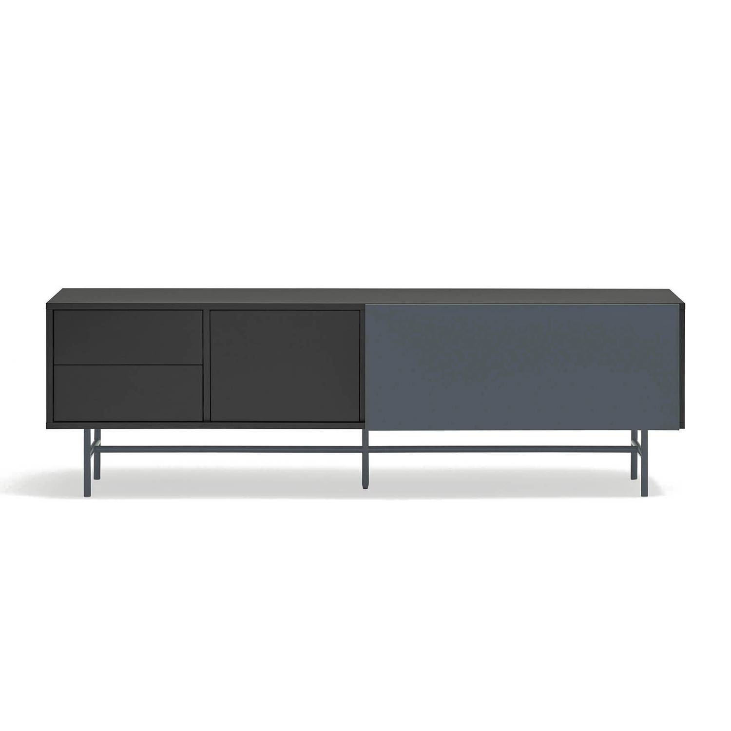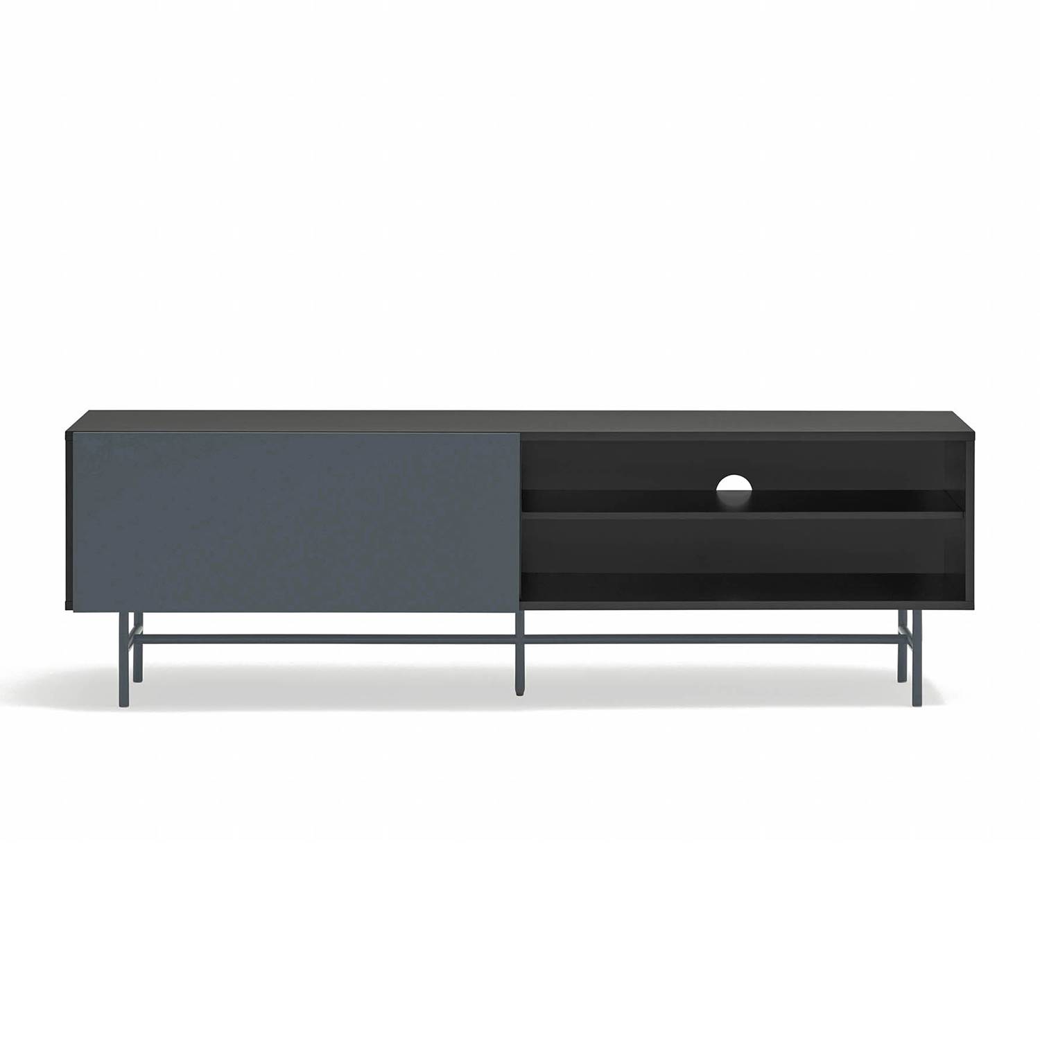 Este mueble tv de diseño ofrece una superficie amplia para televisores de gran formato. Su diseño incorpora una puerta corredera que permite adaptar visualmente el conjunto, ocultando o mostrando las diferentes zonas de almacenaje según se prefiera en cada momento.