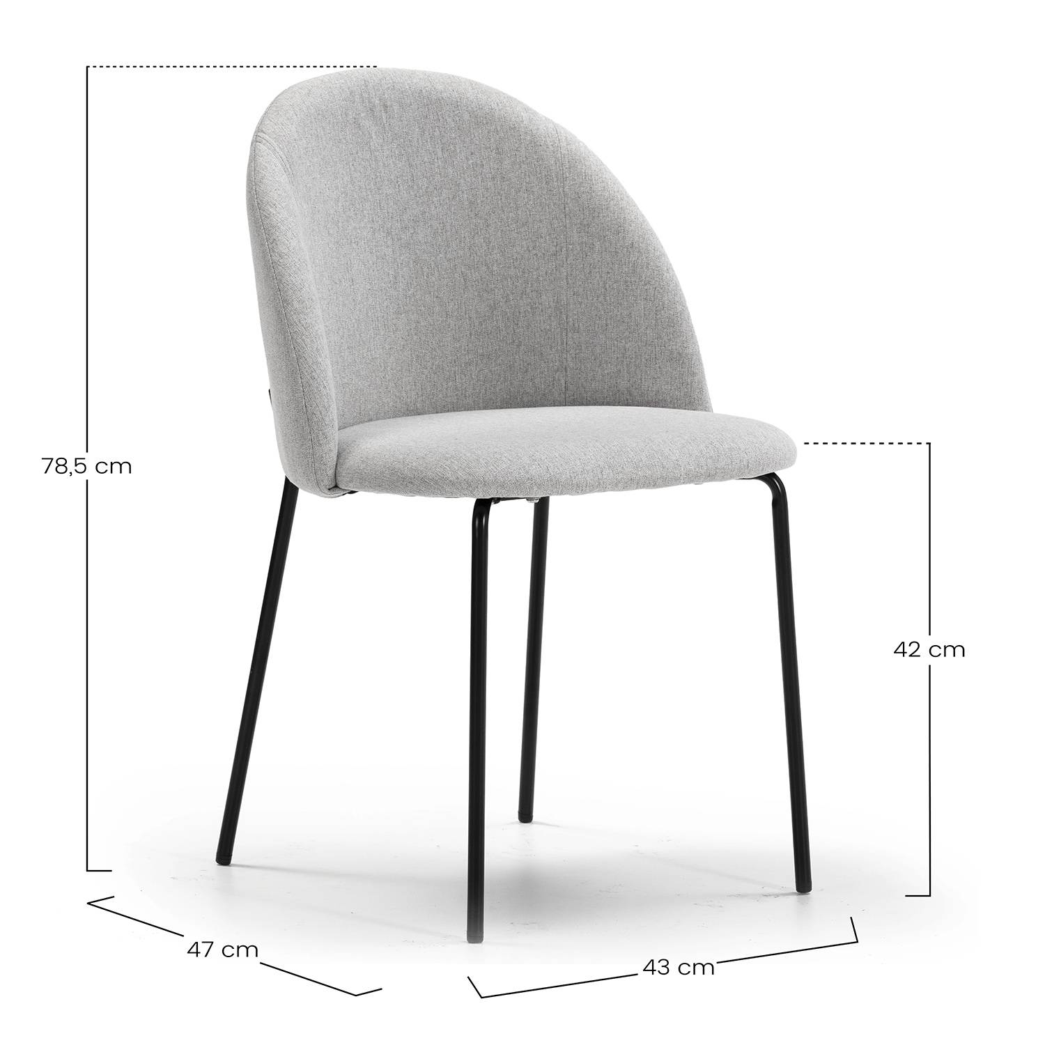 Medidas silla: 43 cm (ancho) x 78,5 cm (alto) x 47 cm (fondo). Altura asiento 42 cm.