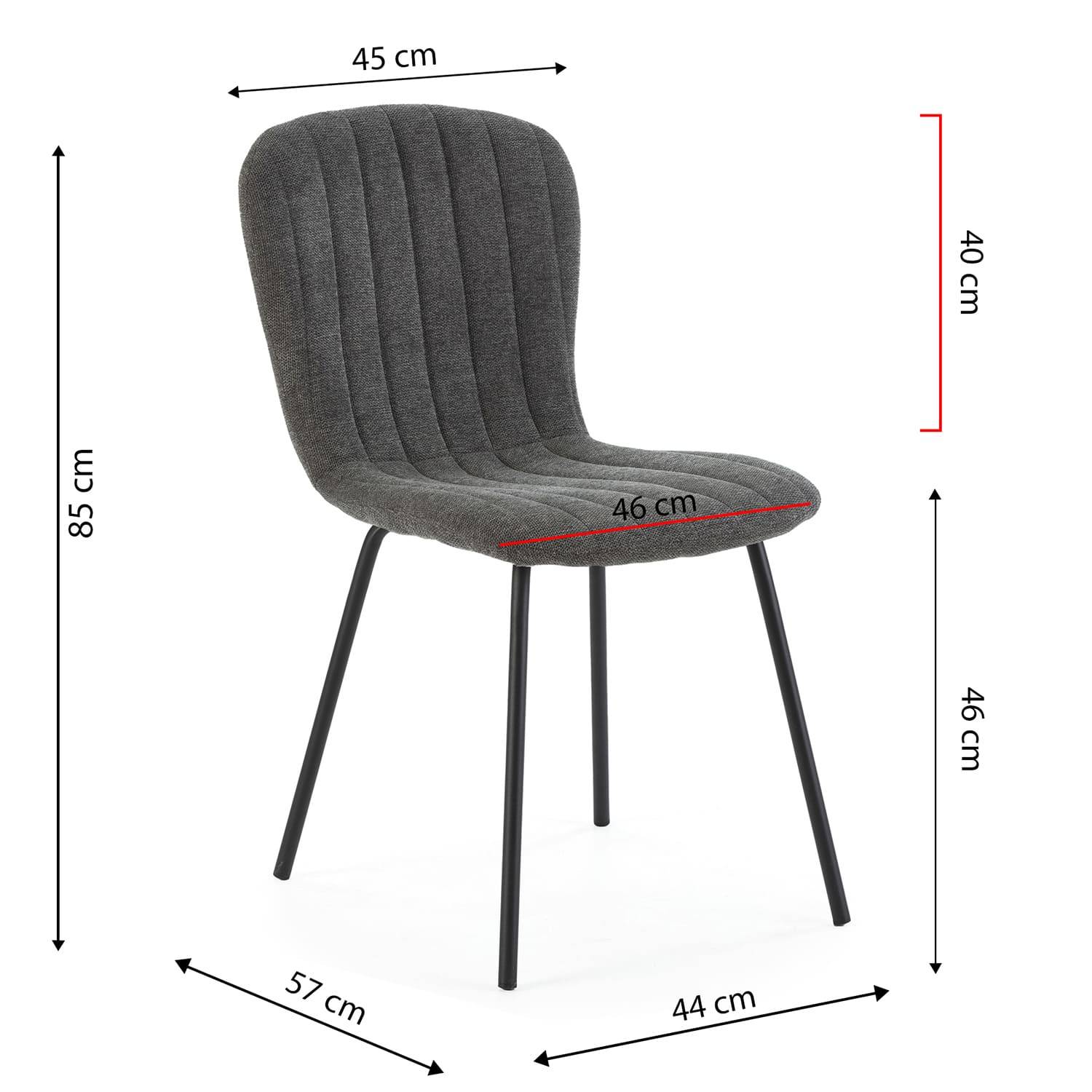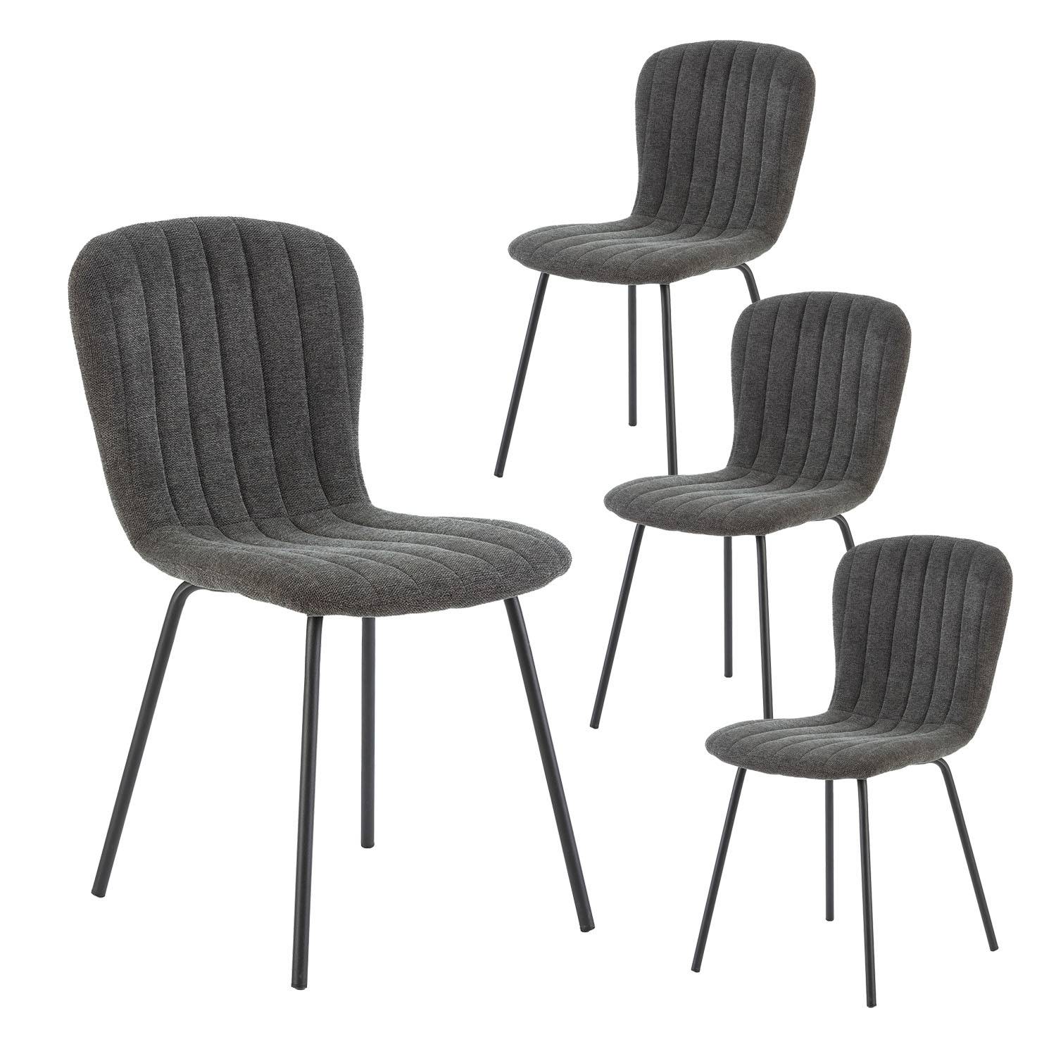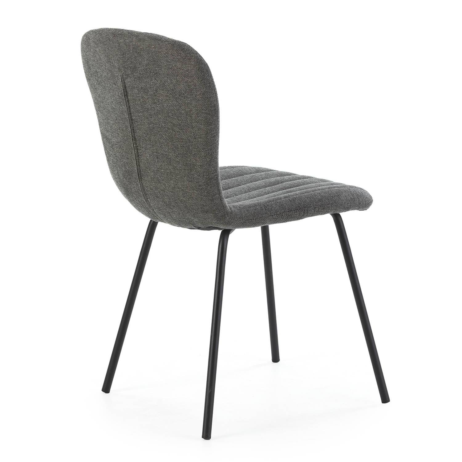 Silla de comedor Serem con tapizado en tela 100% poliéster en 4 colores diferentes y patas metálicas en negro. Es una silla muy cómoda que encaja perfectamente en cualquier espacio con líneas verticales. El pack contiene 4 unidades de la silla.