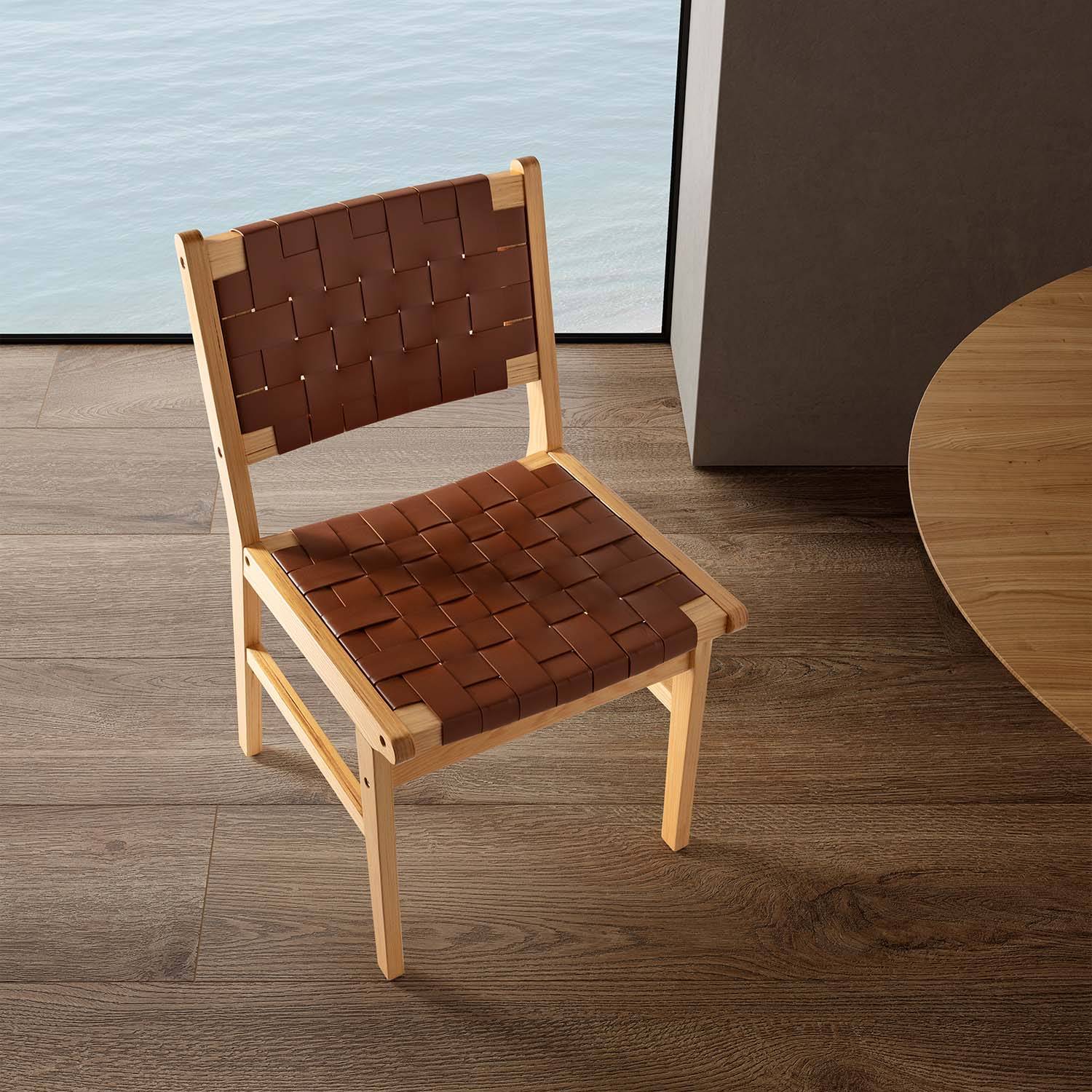 Estas sillas de comedor modernas y elegantes se distinguen por un diseño que combina la madera con un respaldo y asiento cuidadosamente forrados en piel sintética reciclada. Este material es extremadamente agradable al tacto, proporcionando una experiencia de asiento sumamente confortable. La piel sintética reciclada es además muy fácil de limpiar, facilitando su mantenimiento diario y asegurando que tus sillas luzcan siempre impecables con un mínimo esfuerzo.
