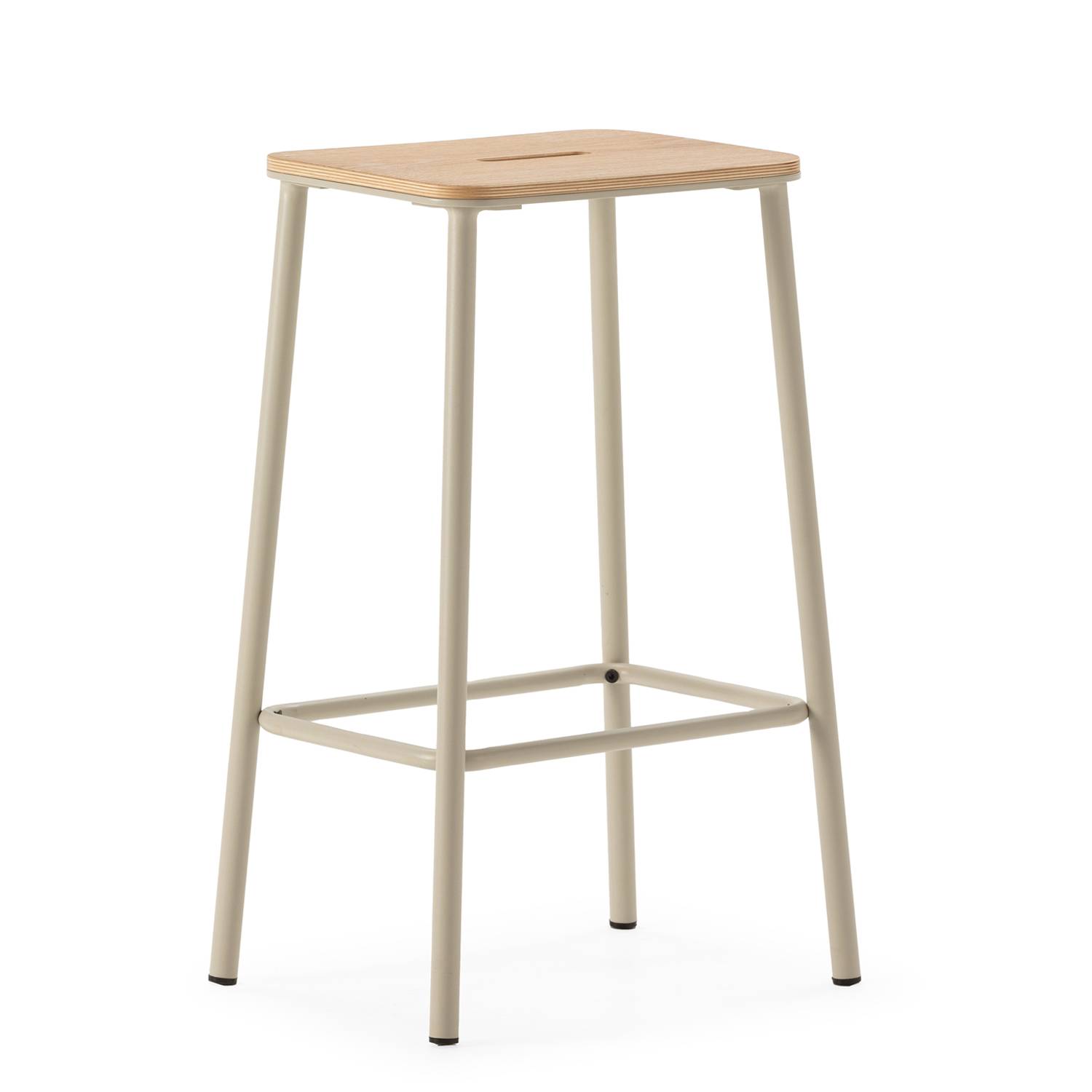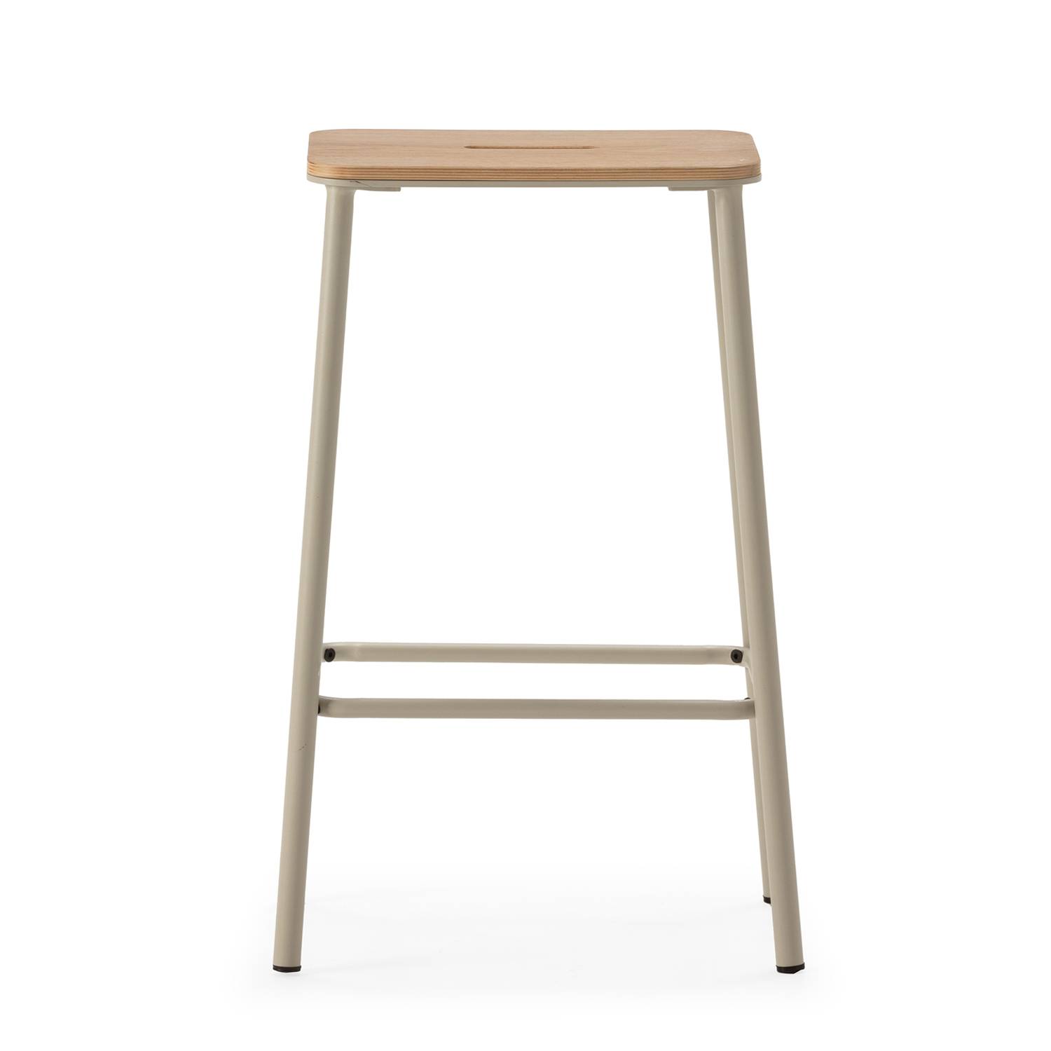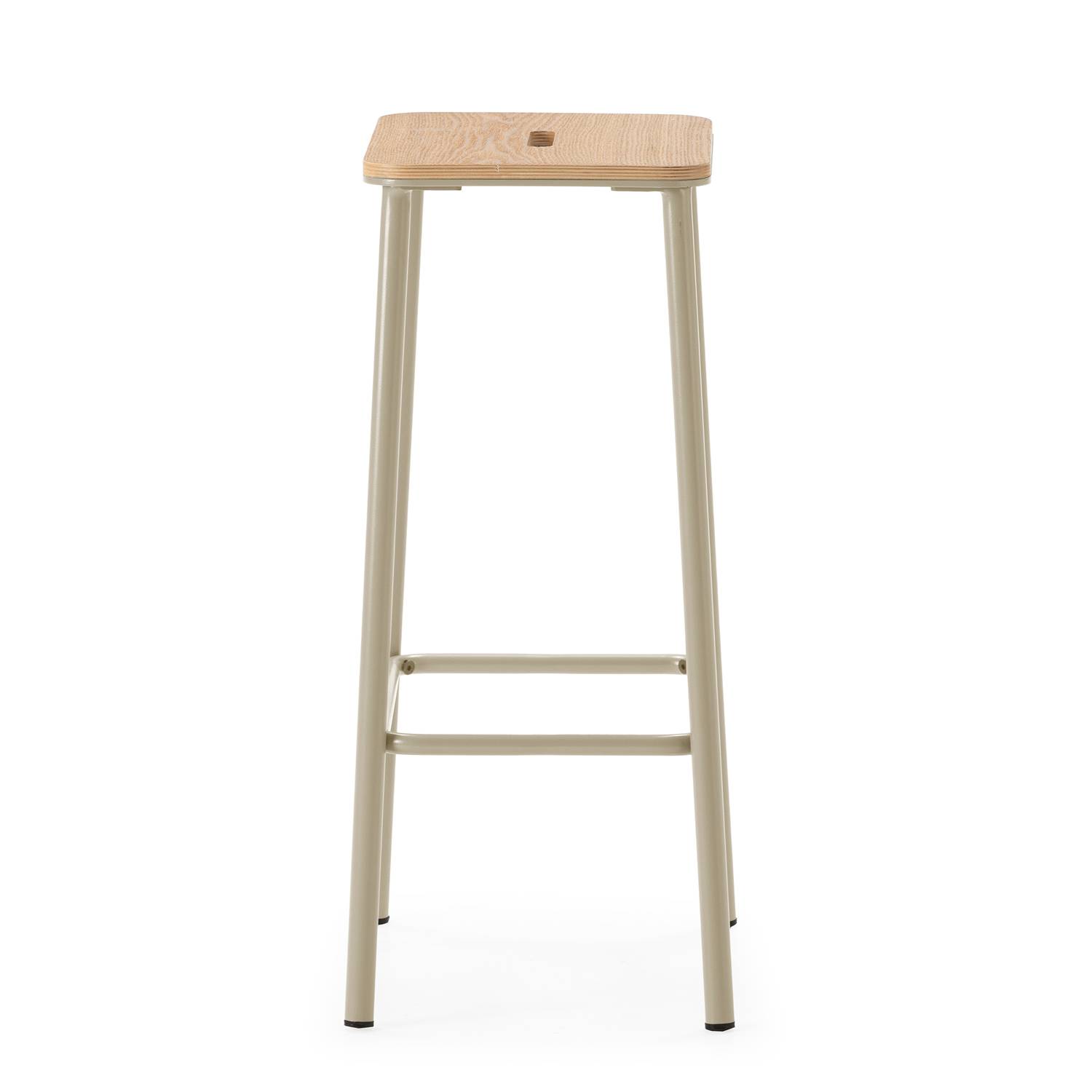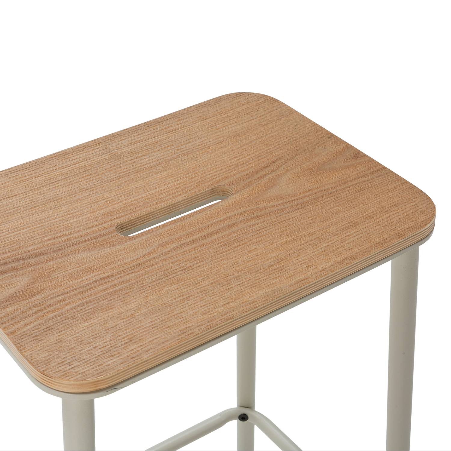Estos taburetes tienen el asiento elaborado de madera, con acabado en un roble claro natural, que aporta calidez y una sensación acogedora al espacio. Su forma recta garantiza una sentada cómoda, mientras que la rendija central no solo suma originalidad al diseño, sino que facilita su manipulación al moverlos. Este pequeño detalle los hace únicos y diferentes a otros modelos del mercado.