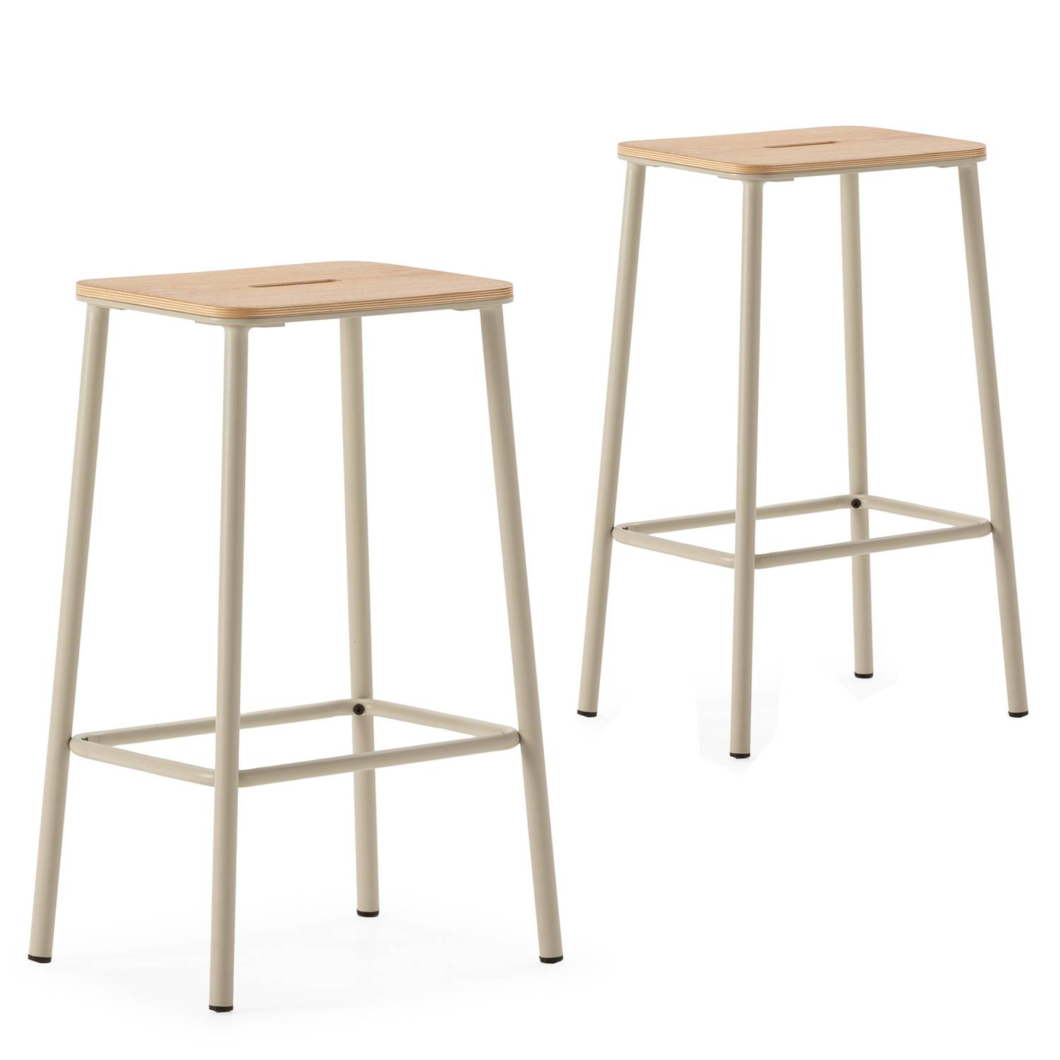 Pack de 2 taburetes Nola, disponibles en color roble/beige, roble/aguamarina, roble/teja y roble/negro. El pack incluye dos unidades indivisibles, sin opción a intercambiar los colores. Fabricados en madera y metal.