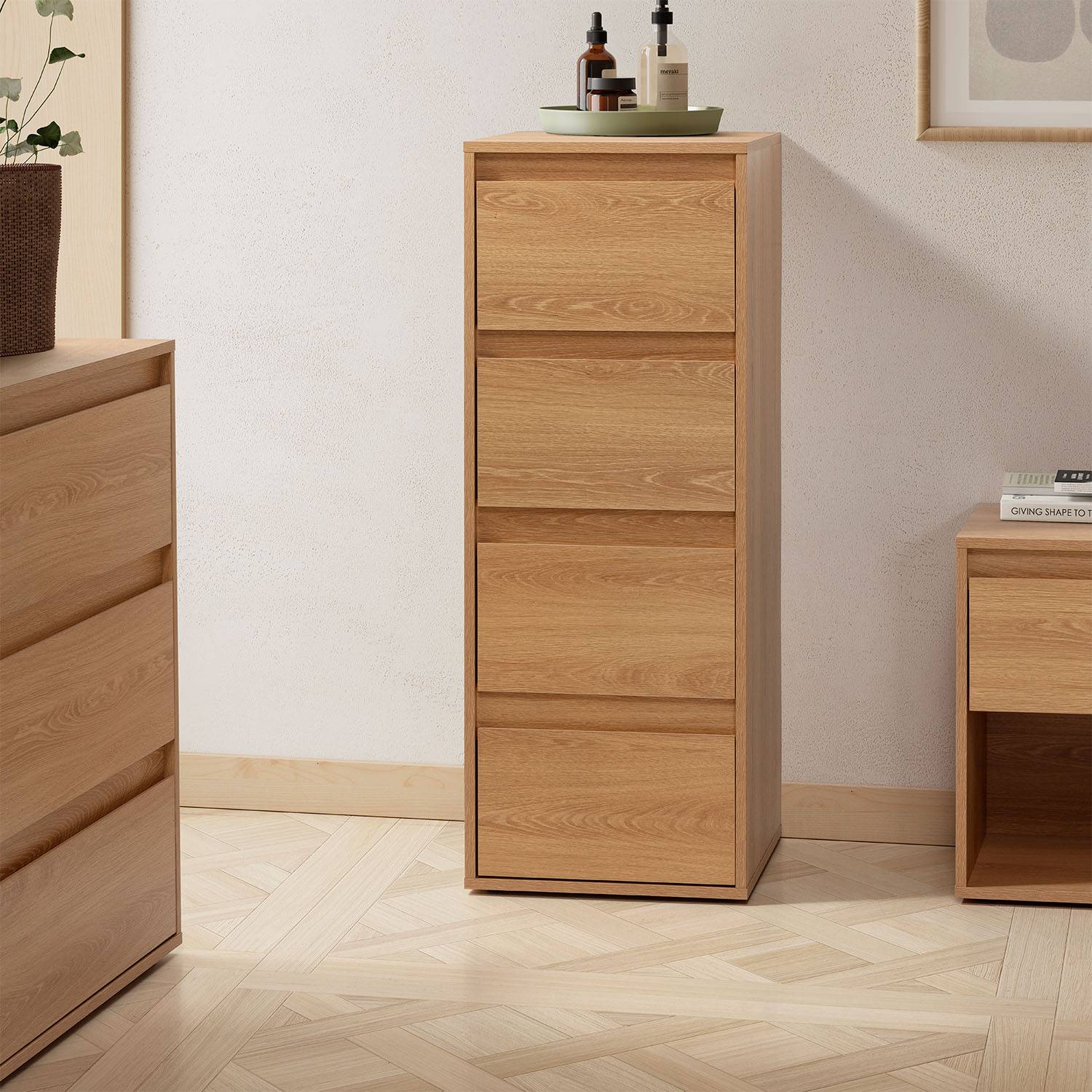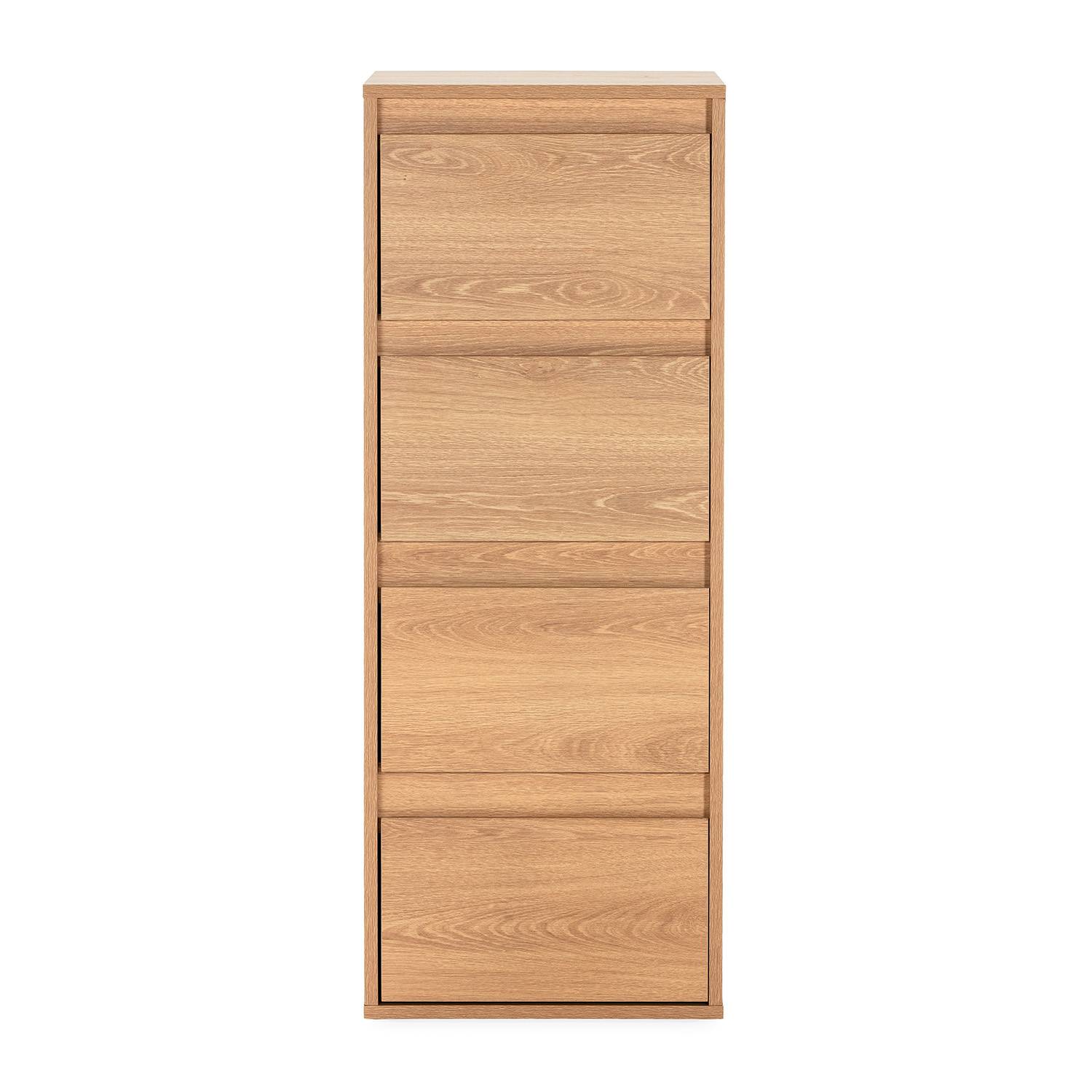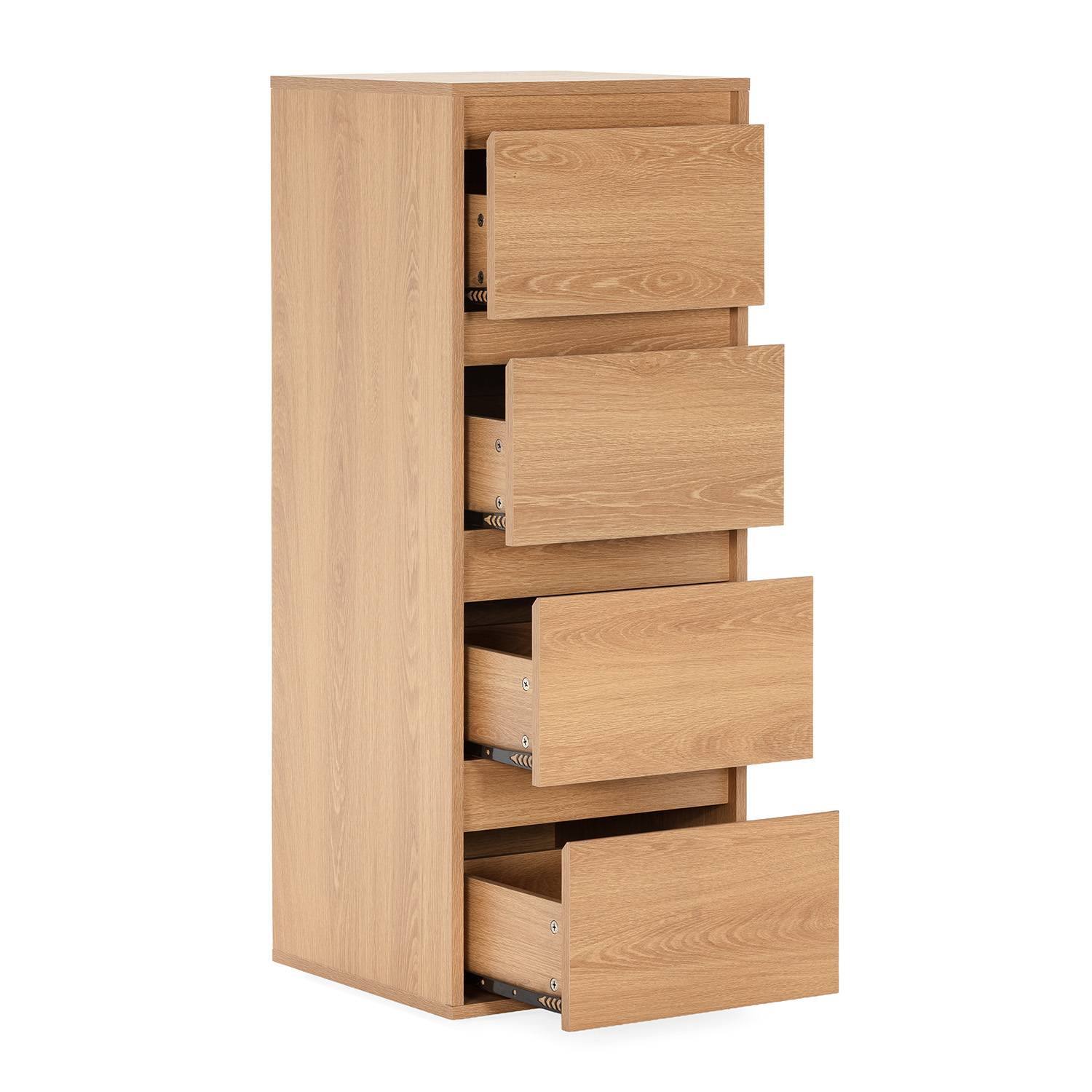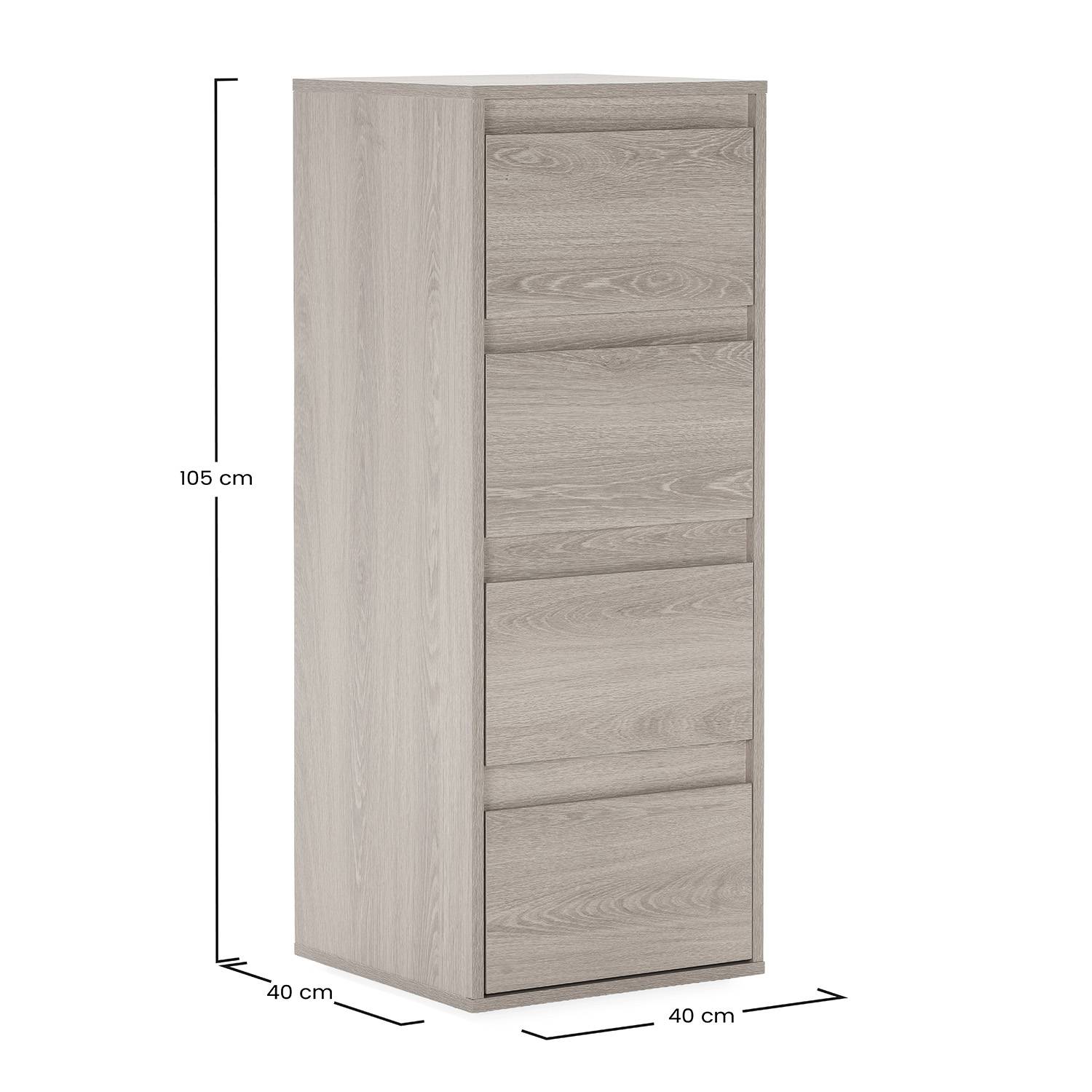 Este sinfonier de 4 cajones es perfecto para mantener el dormitorio ordenado. Ideal para organizar ropa, complementos y objetos personales de forma sencilla. Los cajones incorporan guías metálicas, garantizando un deslizamiento suave y preciso en cada apertura y cierre, mejorando la experiencia de uso diaria.